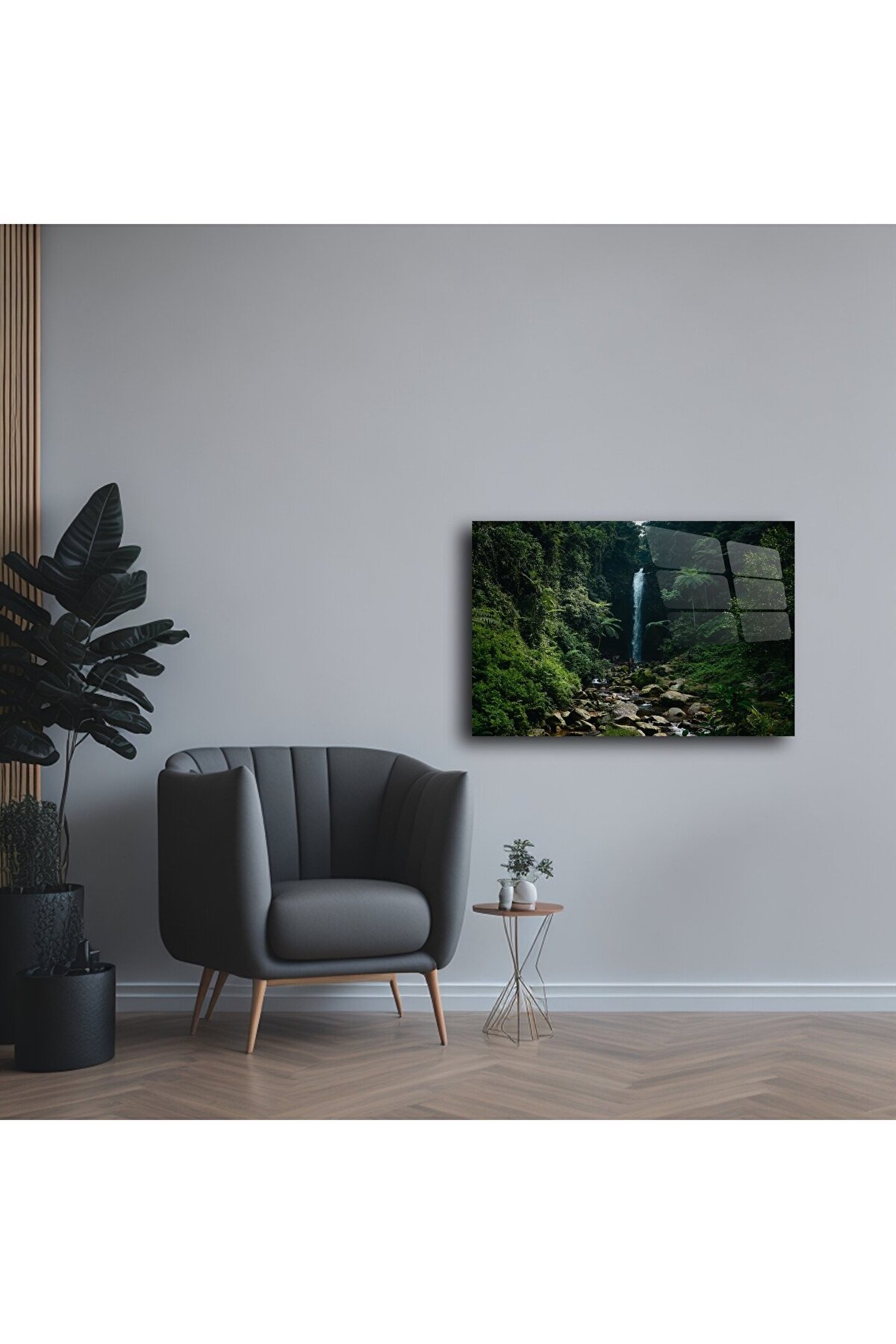 Doğanın büyüleyici gücünü evinize taşıyın. Bu yüksek parlak cam tablo, yeşilin tüm tonlarını içeren tropik bir orman ve zarif bir şelale sahnesiyle huzur ve estetiği bir araya getiriyor. Her detay, modern yaşam alanlarında dinginlik ve stil yaratmak için tasarlandı.
