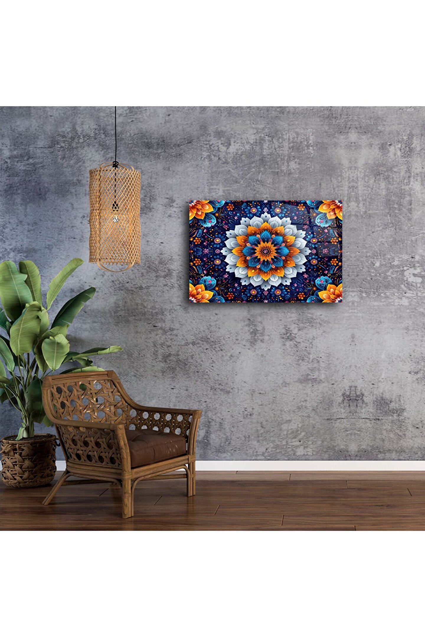 Bohem enerjiyi modern dokunuşla buluşturan bu mandala desenli cam tablo, yaşam alanınıza estetik bir huzur ve renkli bir ruh kazandırır. Cam üzerine yüksek çözünürlüklü baskı tekniğiyle üretilmiş bu dekoratif tablo, özellikle ruhunu ve stilini yansıtan mekanlar yaratmak isteyenler için tasarlandı.