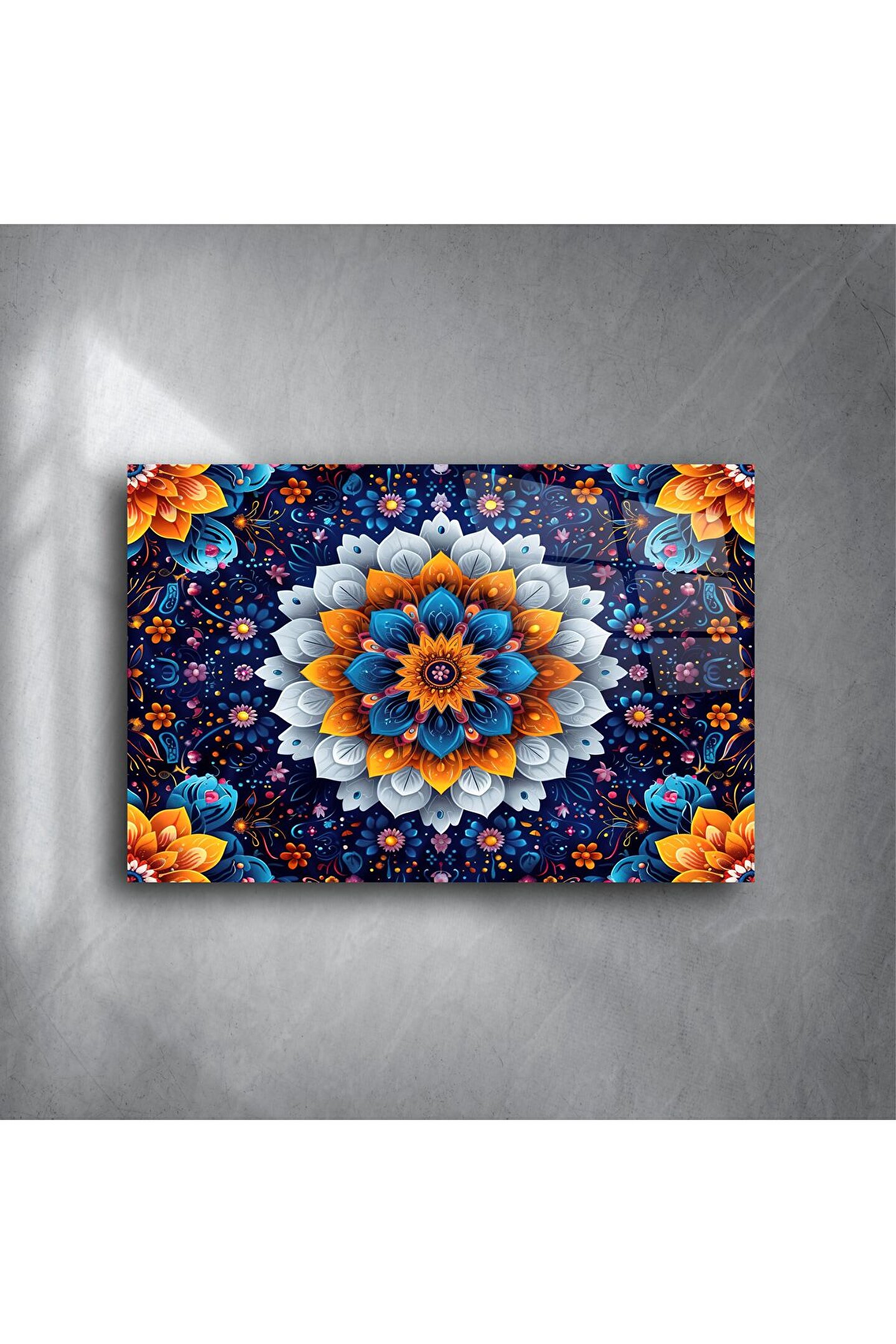 Benzersiz çiçek motifleriyle çevrili mandala formu, meditasyon, şifa ve içsel dengeyi simgelerken; koyu lacivert zemin üzerinde canlı turuncu, mavi ve beyaz renklerin enerjisiyle kontrast bir şıklık sunar.