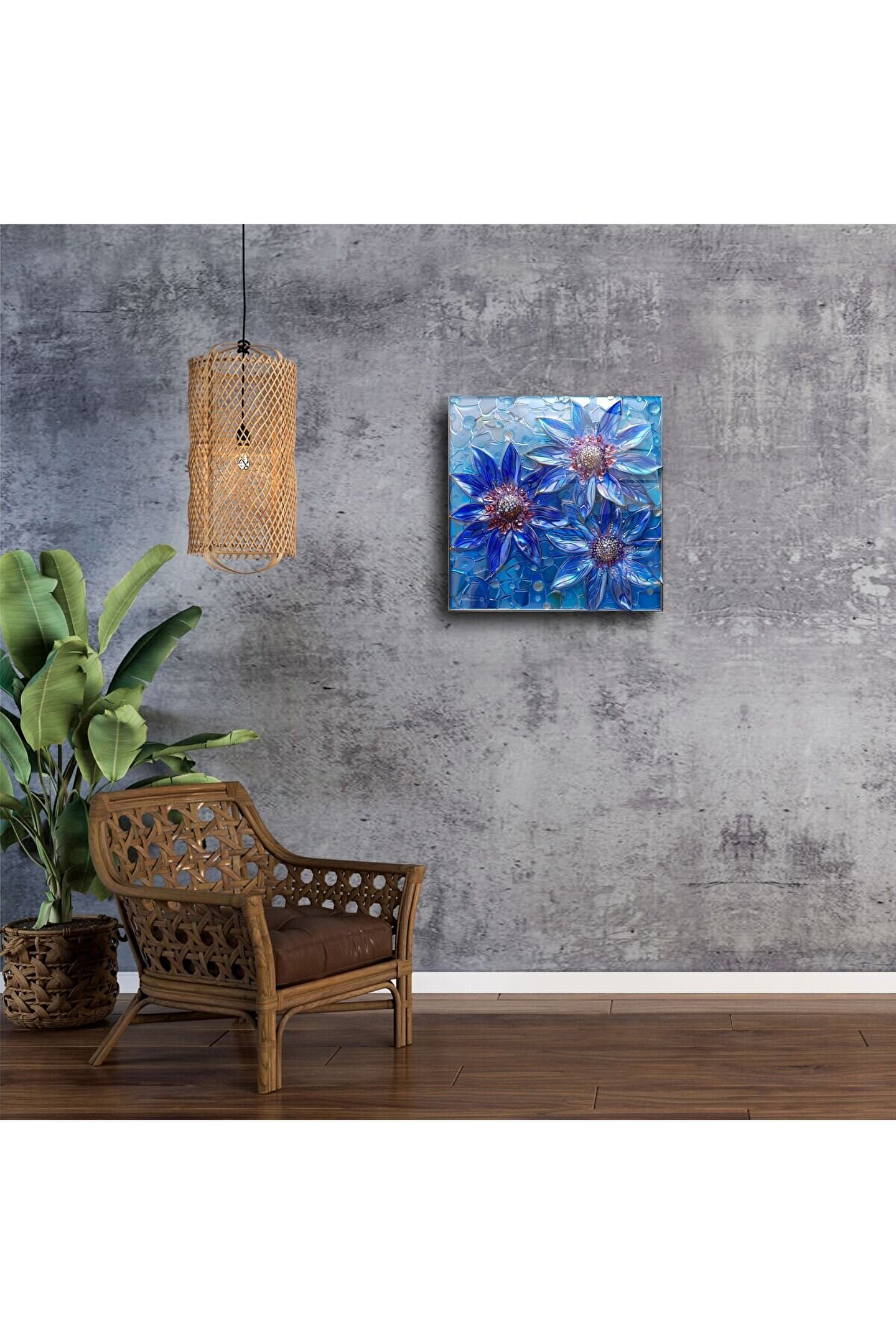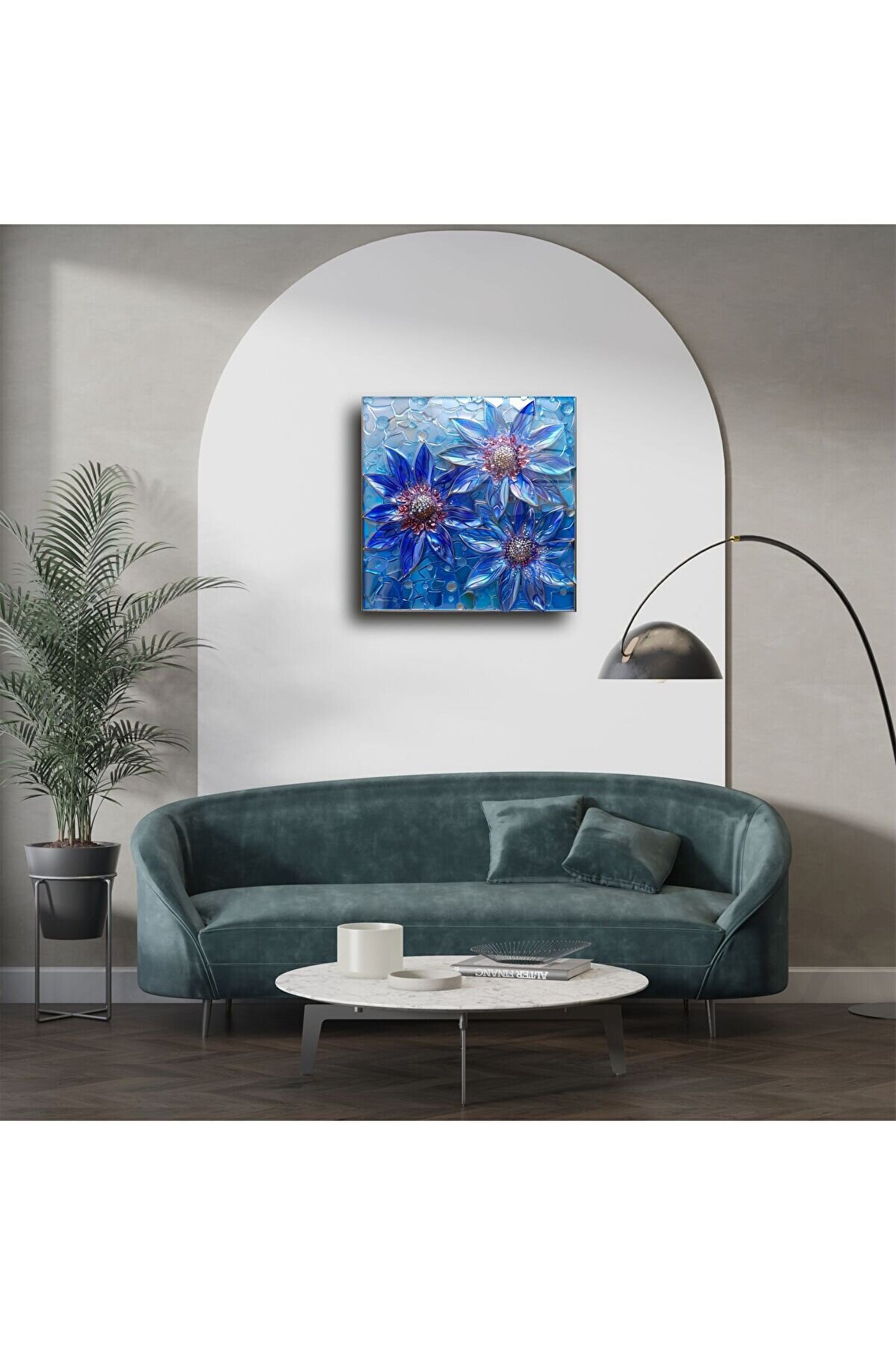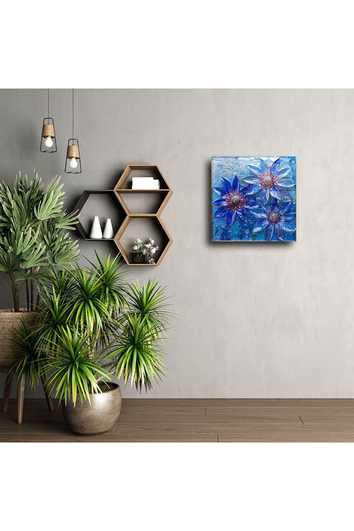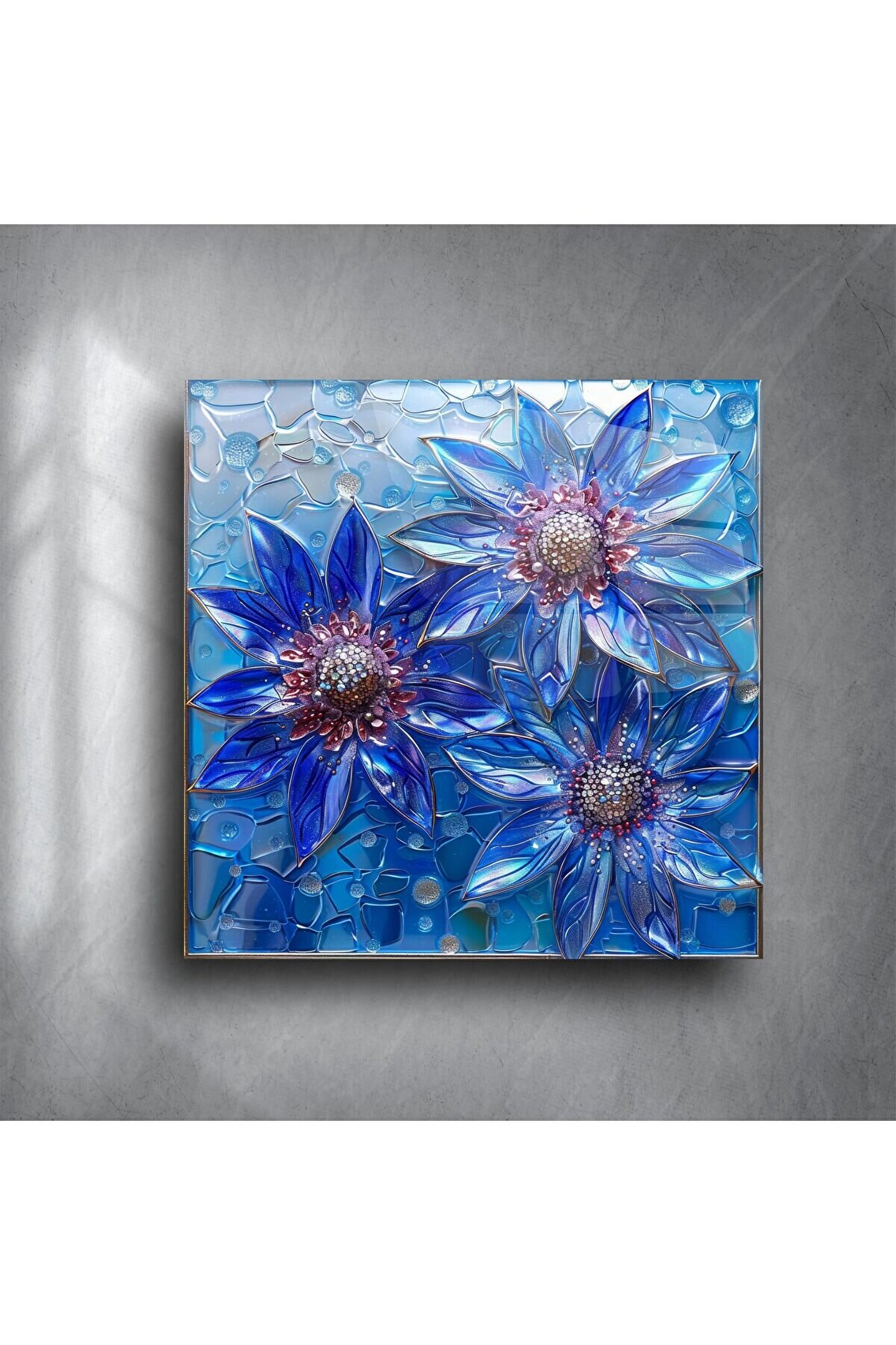 Üç zarif mavi çiçeğin ışıltılı vitray görünümüyle tasarlanan bu el yapımı cam tablo, sakinlik, ferahlık ve zarafeti bir araya getiriyor. Renklerin serin ve modern tonları, yaşam alanınıza huzur ve stil katarken 3D cam efektiyle göz kamaştırıyor.