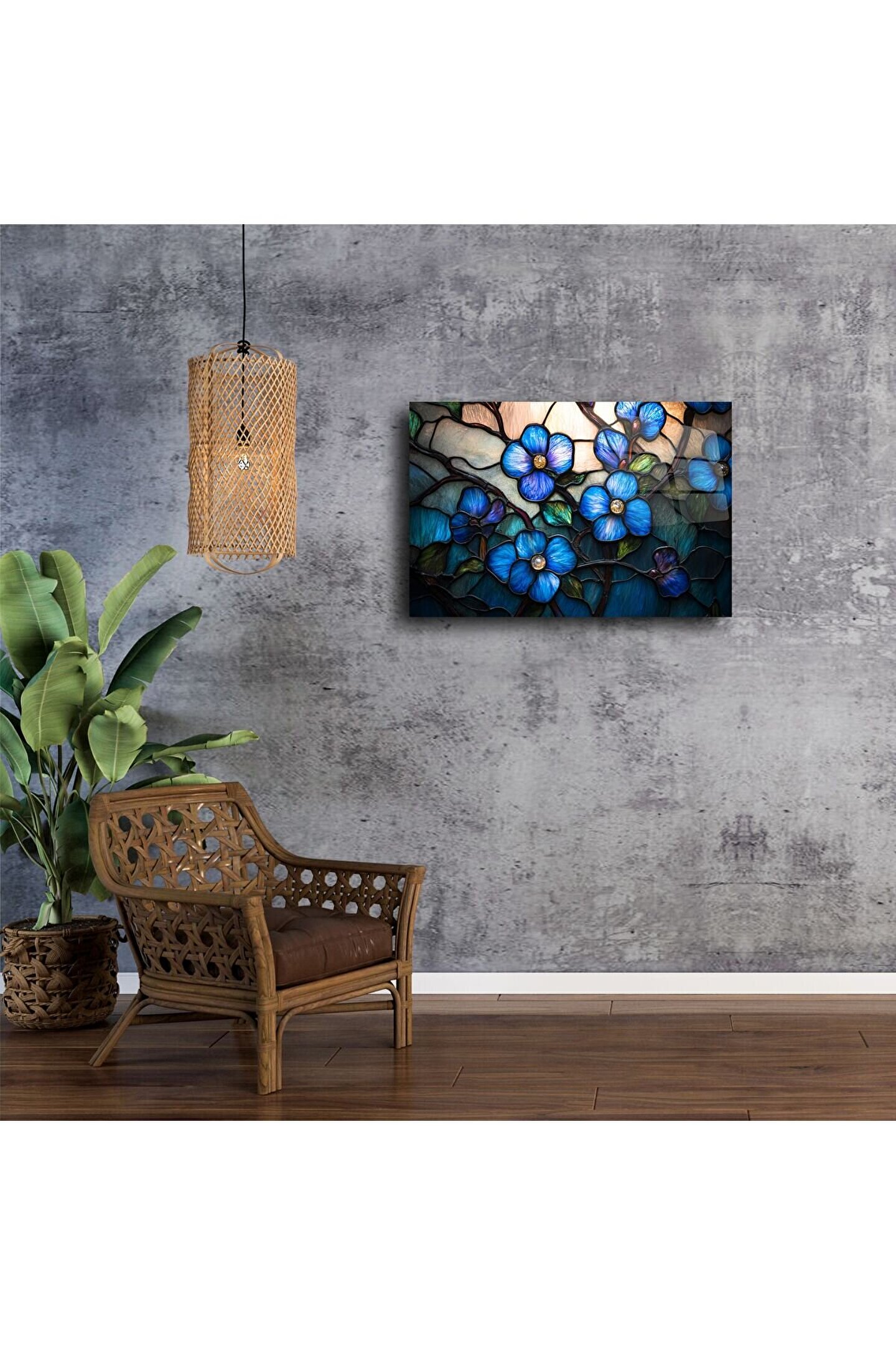 Zarif çizgileri ve canlı mavi tonlarıyla dikkat çeken bu vitray cam tablo, doğanın huzurunu duvarlarınıza taşır. Işığın dans ettiği cam yüzeyde, çiçek detayları 3 boyutlu etkisiyle derinleşir ve sanatı adeta canlı bir deneyime dönüştürür.