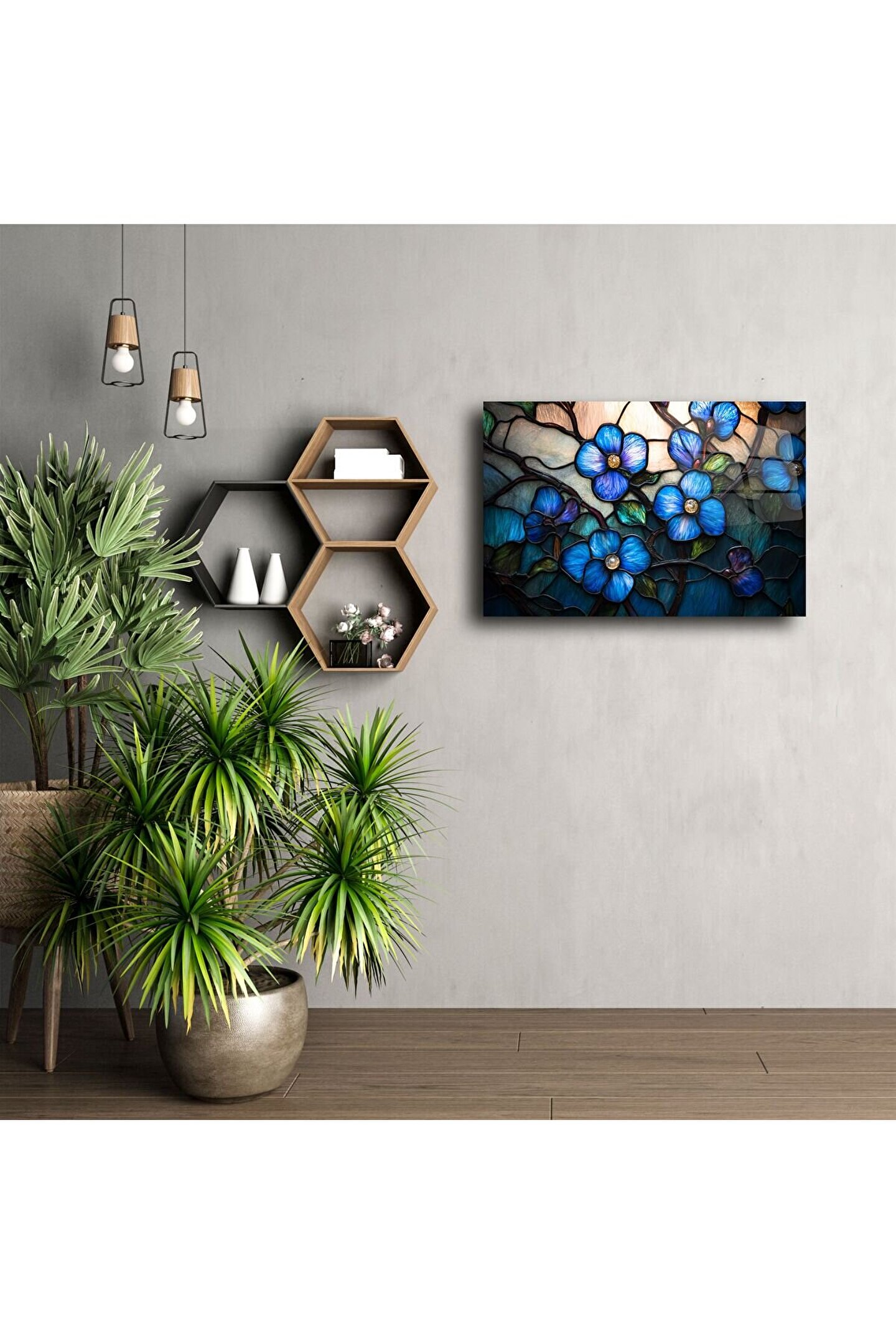 Zarif çizgileri ve canlı mavi tonlarıyla dikkat çeken bu vitray cam tablo, doğanın huzurunu duvarlarınıza taşır. Işığın dans ettiği cam yüzeyde, çiçek detayları 3 boyutlu etkisiyle derinleşir ve sanatı adeta canlı bir deneyime dönüştürür.