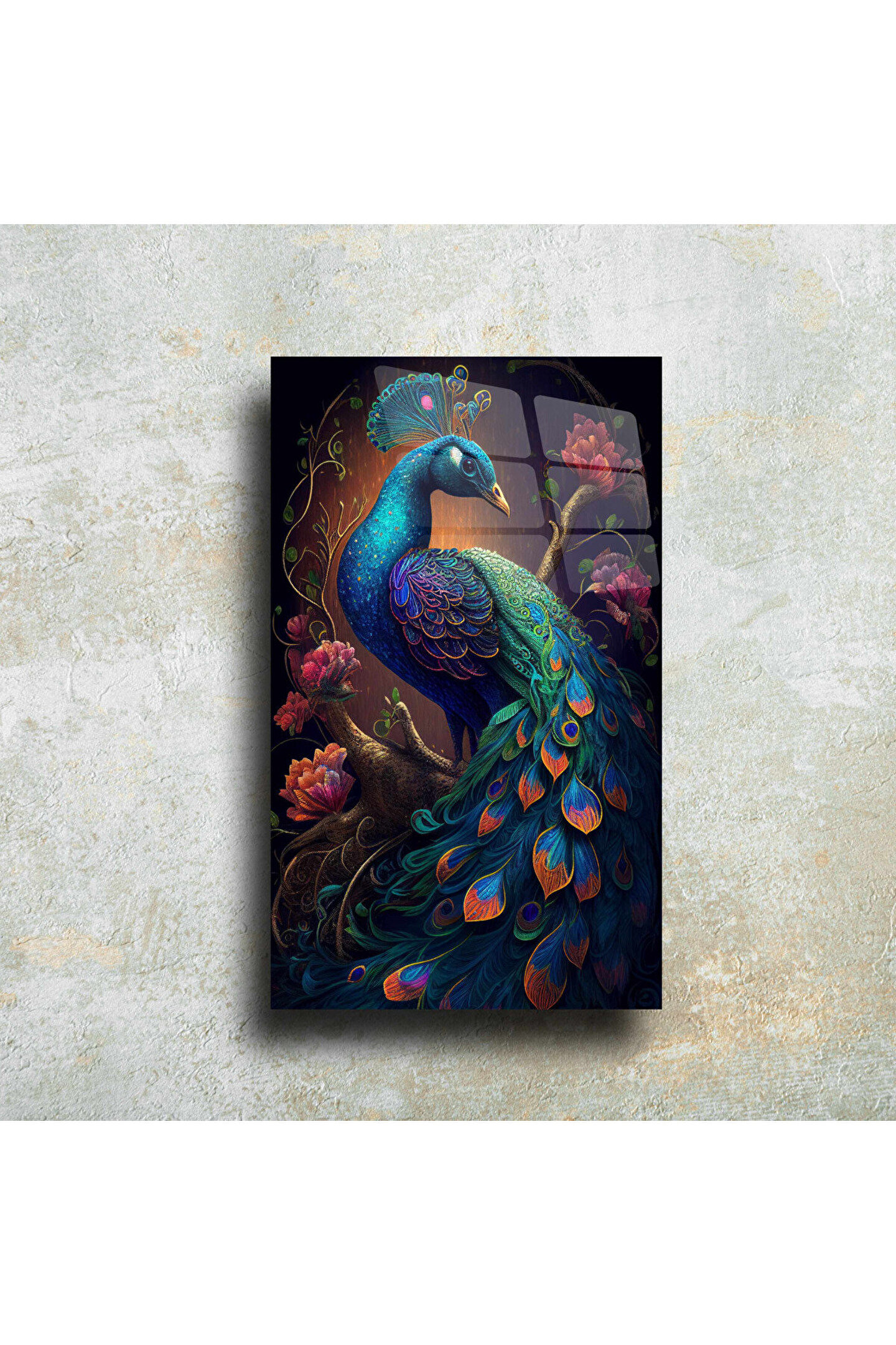 LEYLASER Mavi Tavus Kuşu Cam Tablo Duvar Dekoru