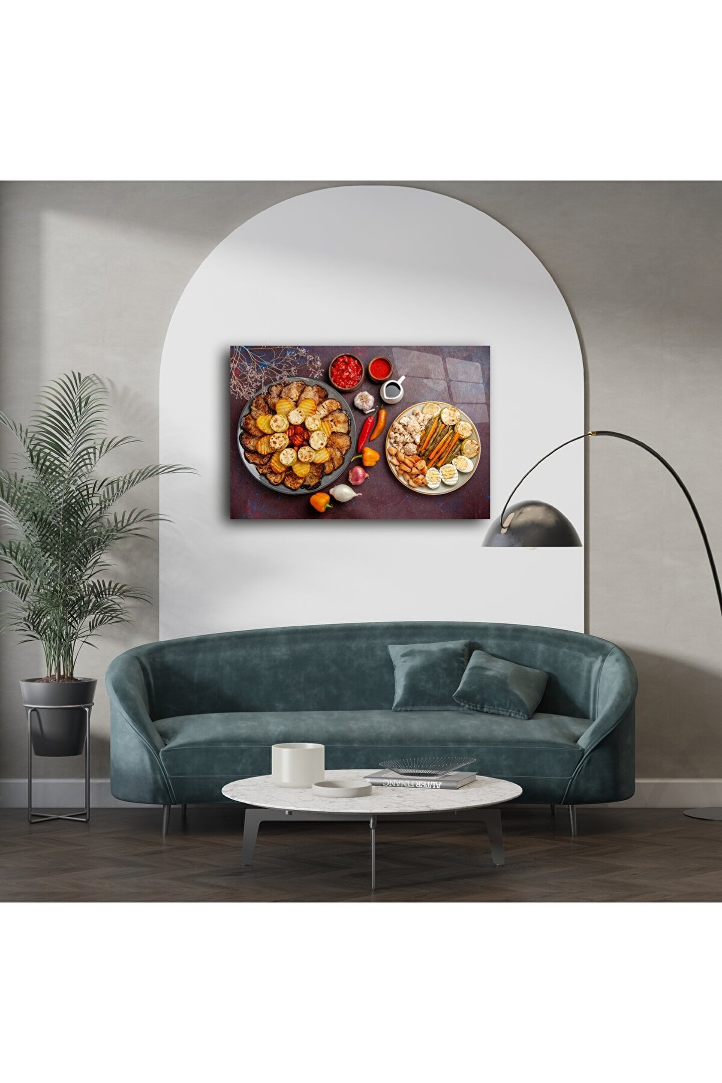 Lezzetli bir sunumun estetikle buluştuğu bu modern cam tablo, mutfaklar ve yemek alanları için eşsiz bir atmosfer yaratır. Gerçek fotoğraf kalitesindeki bu renkli baskı, zengin detayları ve canlı yemek temasıyla hem şıklık hem iştah sunar.