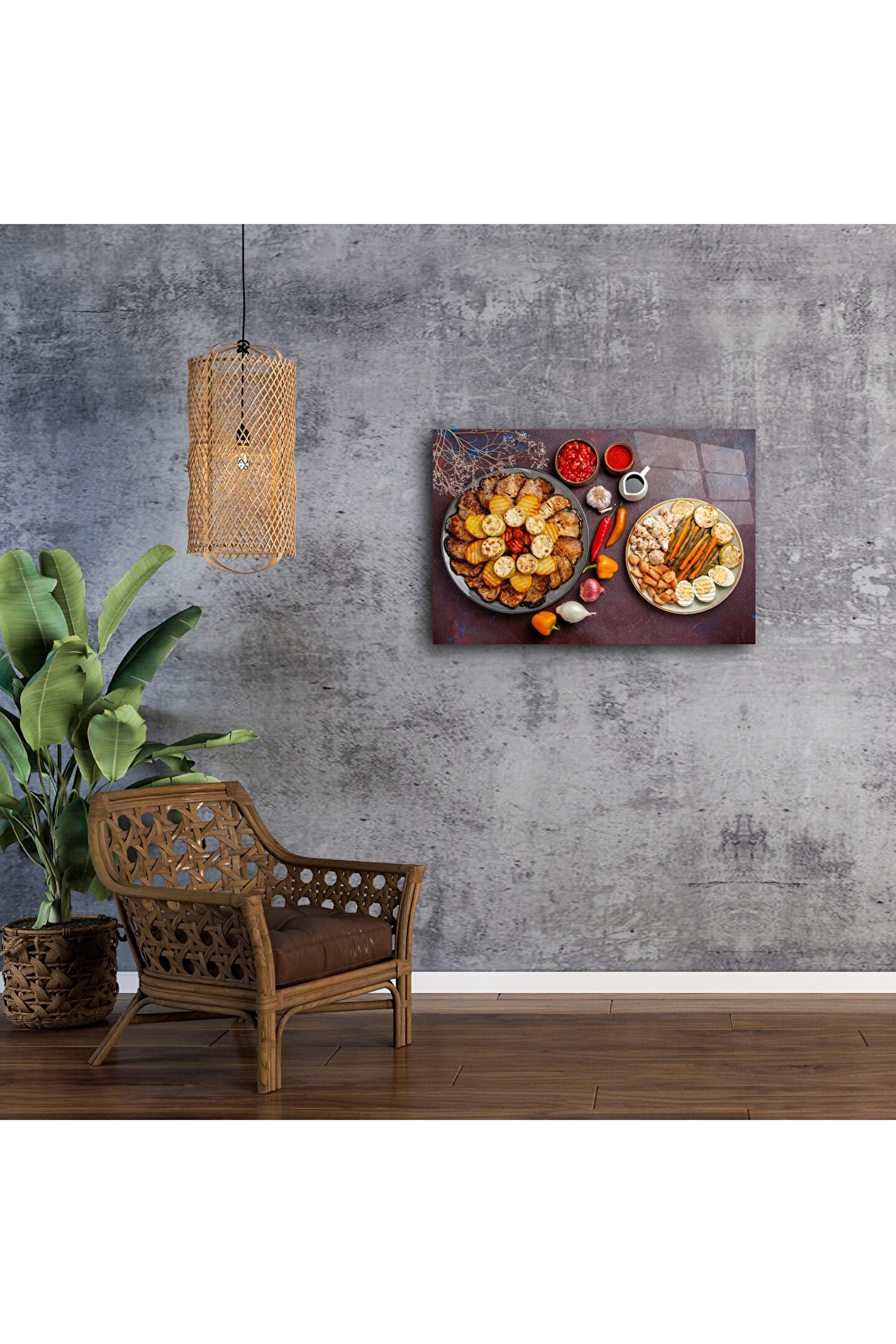 Lezzetli bir sunumun estetikle buluştuğu bu modern cam tablo, mutfaklar ve yemek alanları için eşsiz bir atmosfer yaratır. Gerçek fotoğraf kalitesindeki bu renkli baskı, zengin detayları ve canlı yemek temasıyla hem şıklık hem iştah sunar.