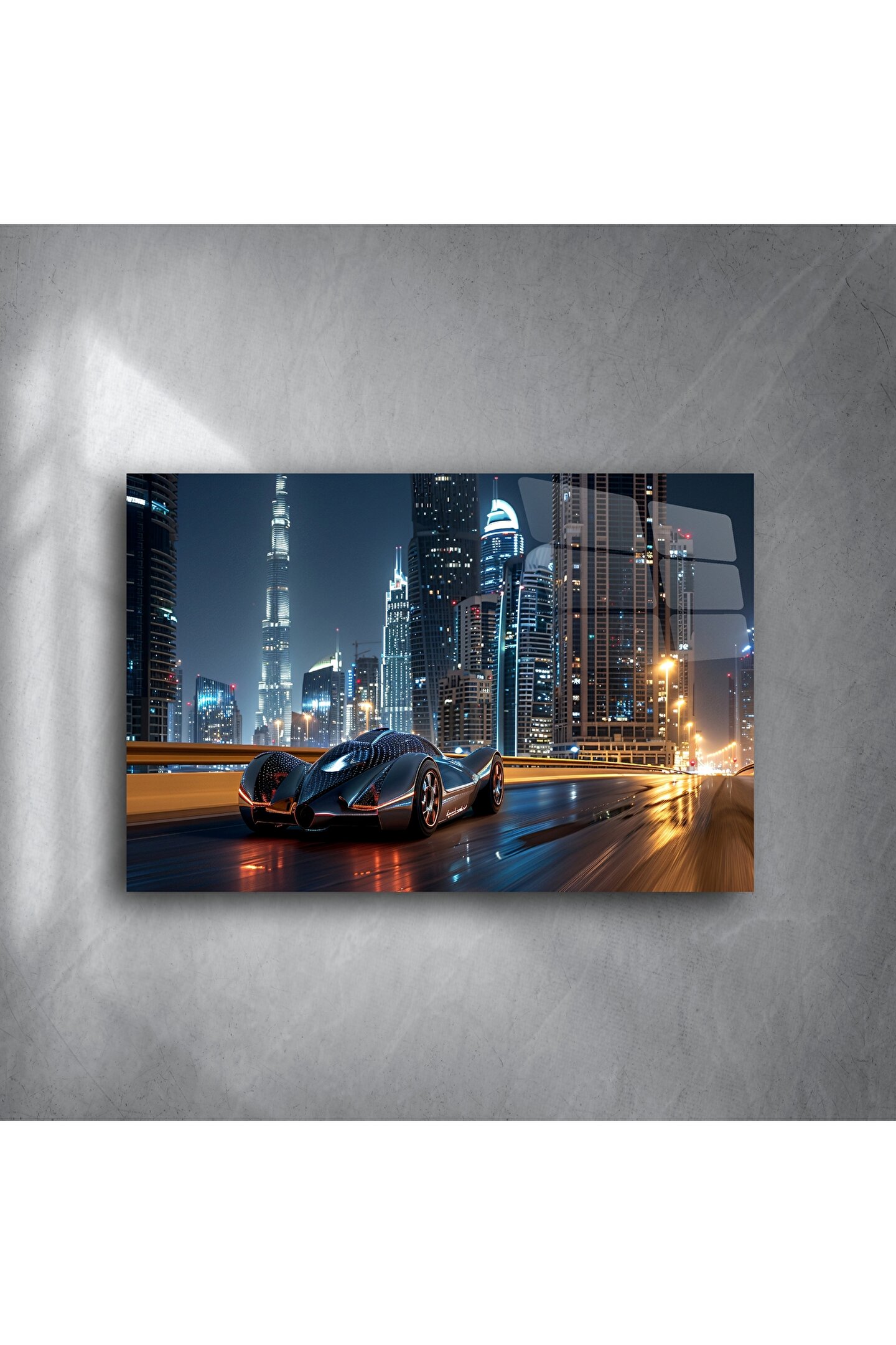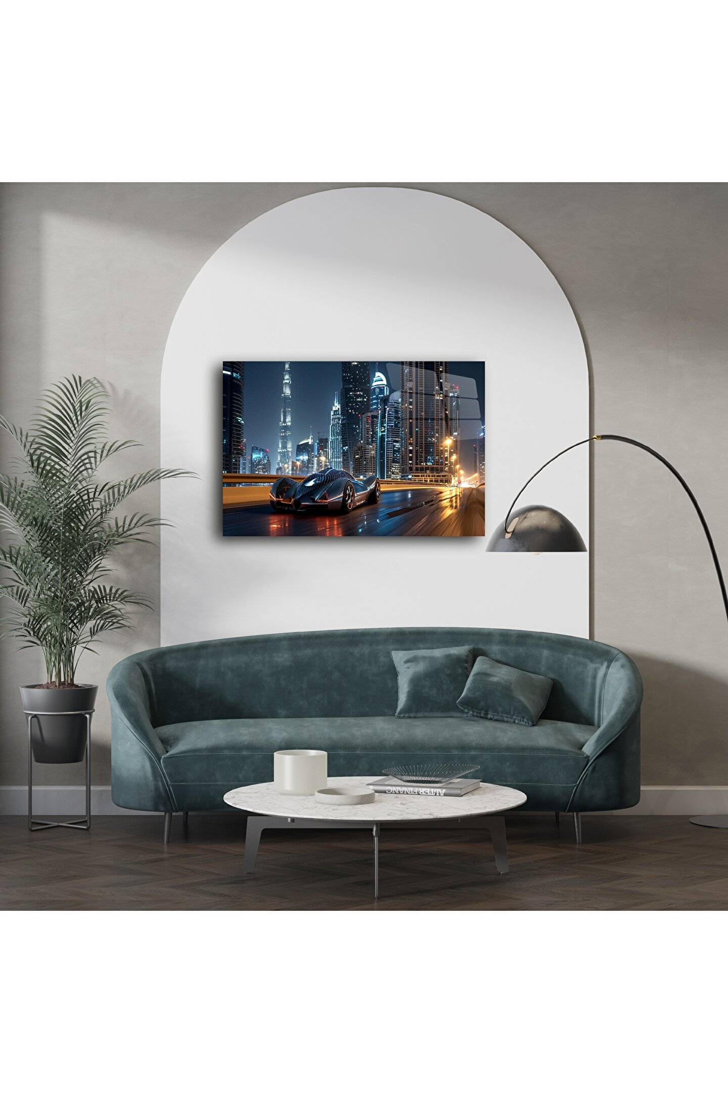 Bu fütüristik süper araba şehir manzarası metal poster, modern yaşamın hızını ve hayali bir geleceğin ihtişamını duvarlarınıza taşıyor. Gece şehir ışıklarıyla harmanlanmış bu çarpıcı tasarım, otomobil tutkunlarına adanmış güçlü bir görsel şölen sunar.