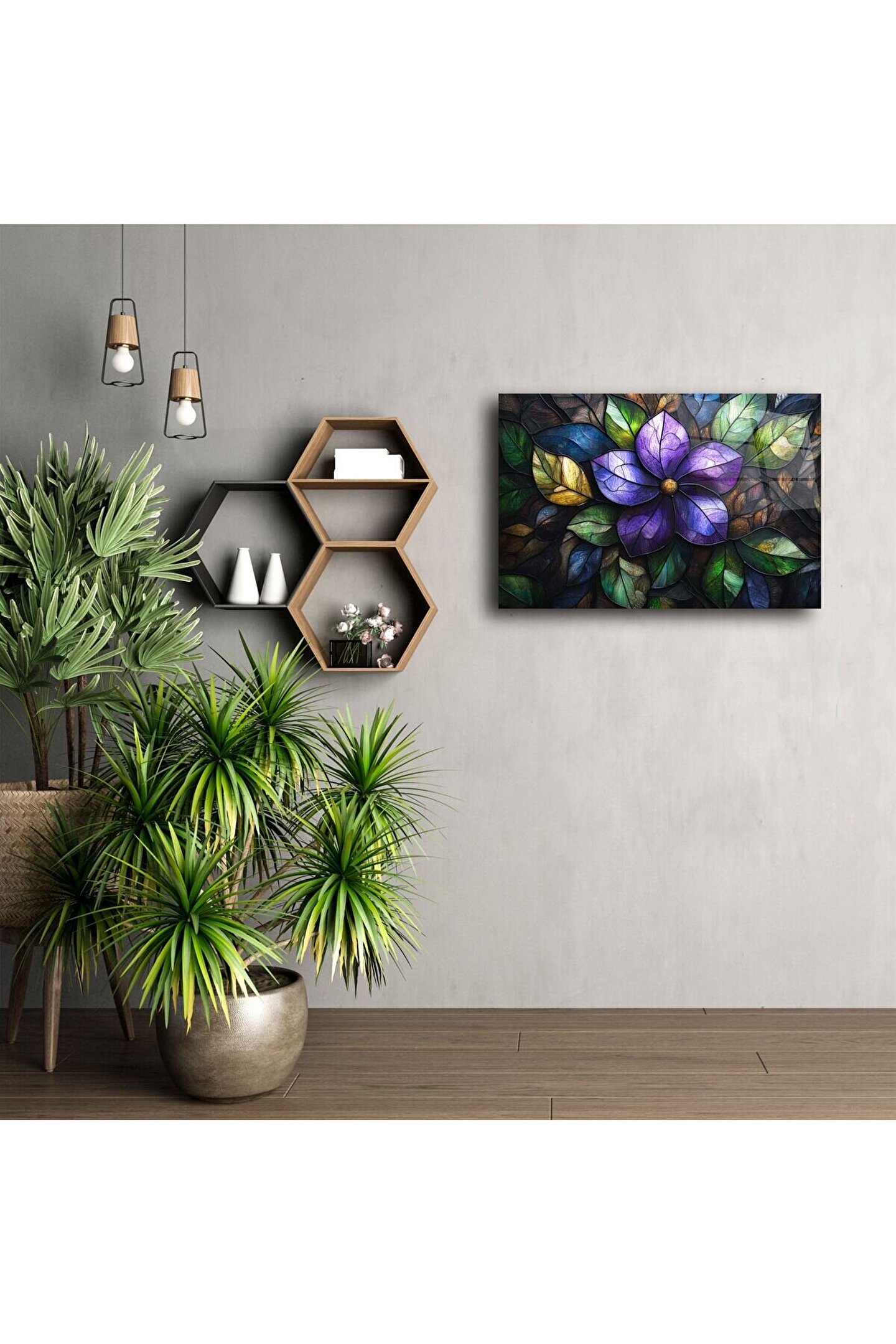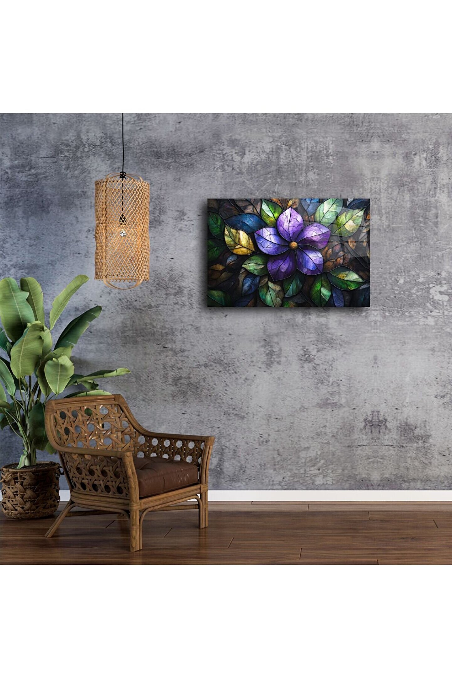 Canlı renklerle bezenmiş bu mor çiçek desenli cam tablo, doğanın zarafetini ve huzurunu yaşam alanınıza taşıyor. Derinliği artıran 3D görsel efekt ve zengin yaprak tonları, iç mekânınıza benzersiz bir karakter ve sofistike bir dokunuş katıyor.