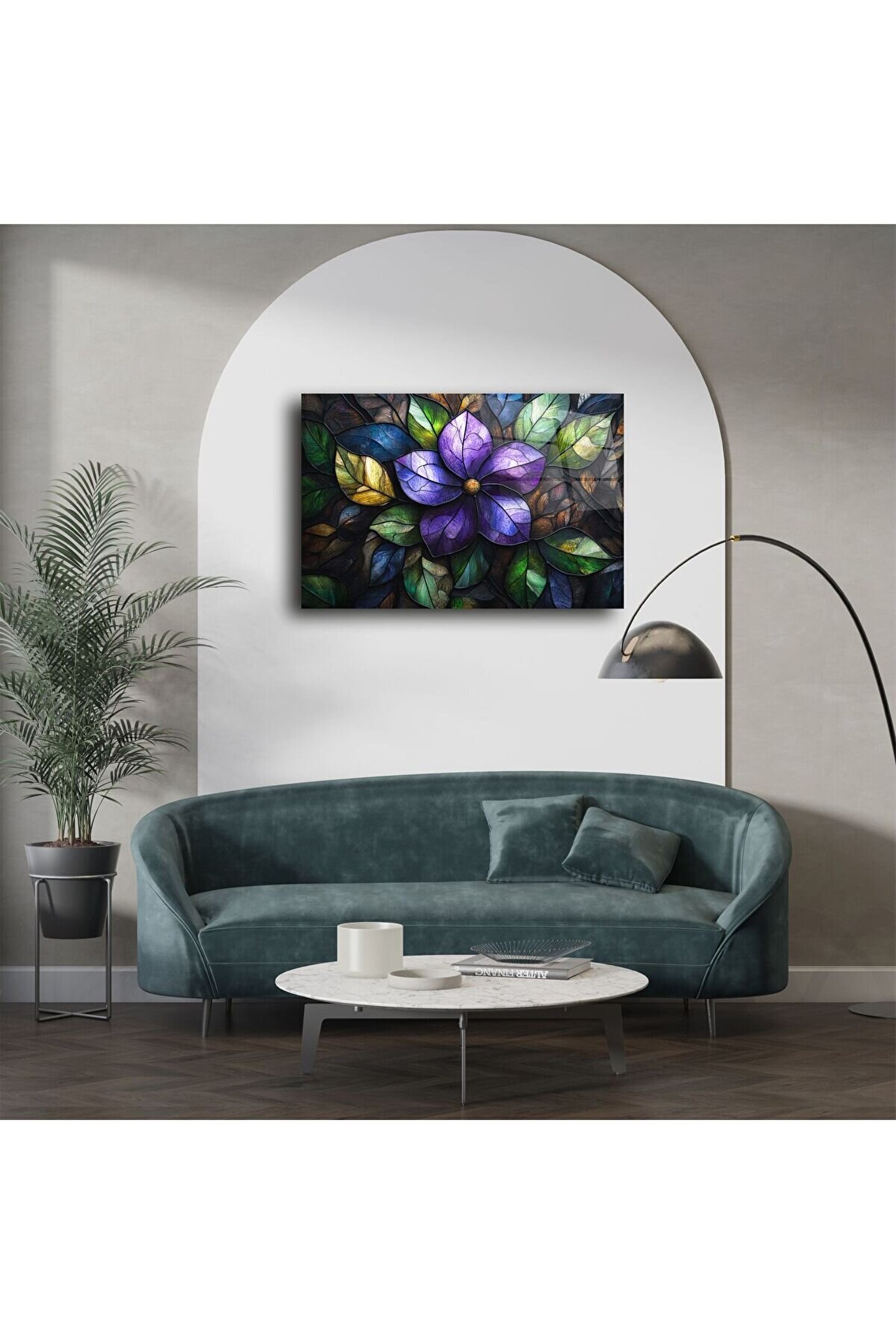 Canlı renklerle bezenmiş bu mor çiçek desenli cam tablo, doğanın zarafetini ve huzurunu yaşam alanınıza taşıyor. Derinliği artıran 3D görsel efekt ve zengin yaprak tonları, iç mekânınıza benzersiz bir karakter ve sofistike bir dokunuş katıyor.