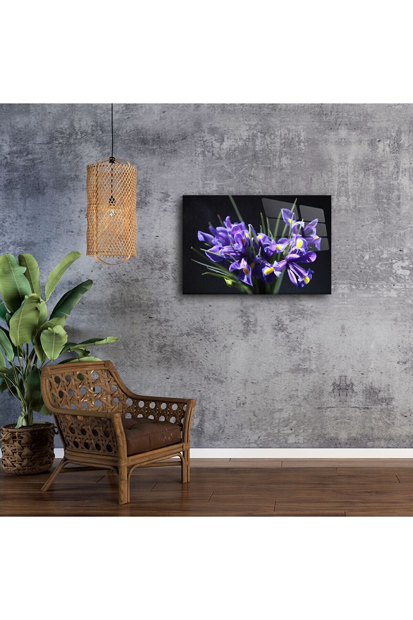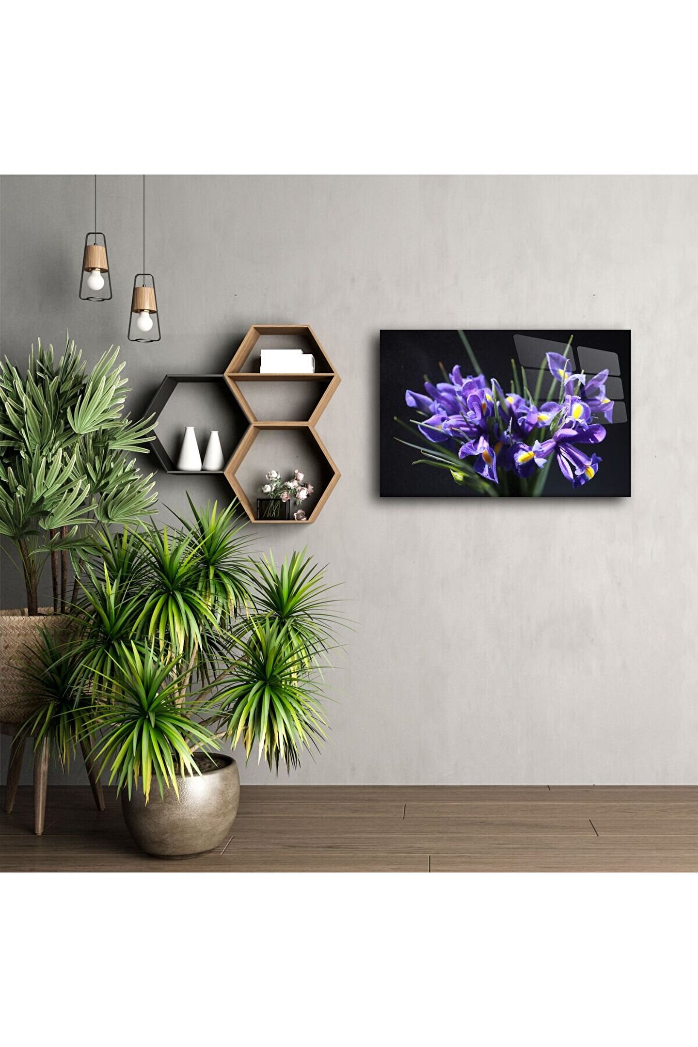 Mor iris çiçeklerinin zarif güzelliğini yaşam alanınıza taşıyın. Koyu fon üzerindeki canlı detaylar, gizemle huzuru bir araya getiriyor — doğanın ve zarafetin mükemmel uyumu.