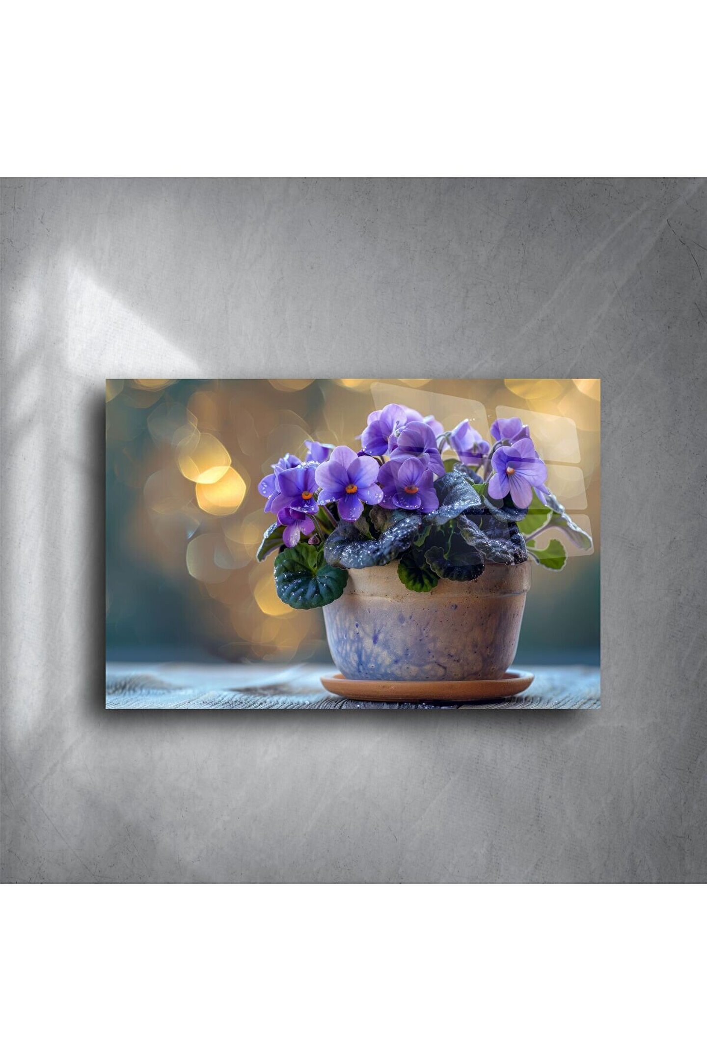 Doğanın zarifliğini ve huzurunu evinize taşıyın. Bu cam tablo, canlı mor menekşeler ve ışıl ışıl bokeh arka planıyla hem doğaya hem de sanata duyulan sevgiyi yansıtıyor. Yüksek çözünürlüklü baskı ve parlak cam yüzey, her detayı ön plana çıkarırken mekanınıza modern bir şıklık katar.