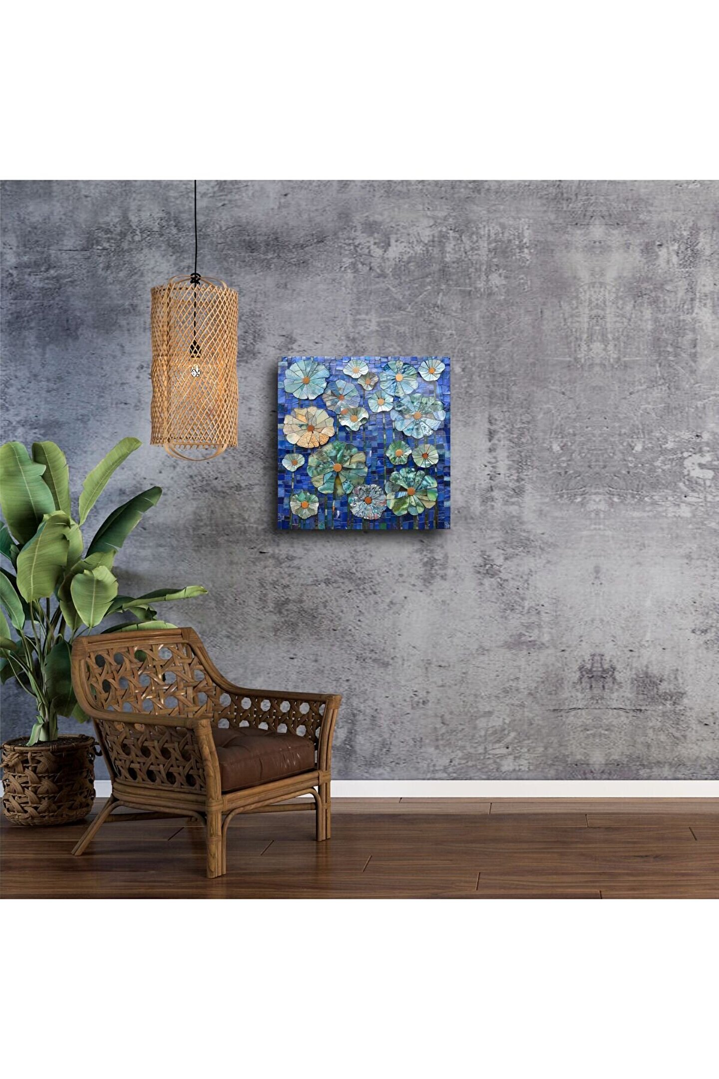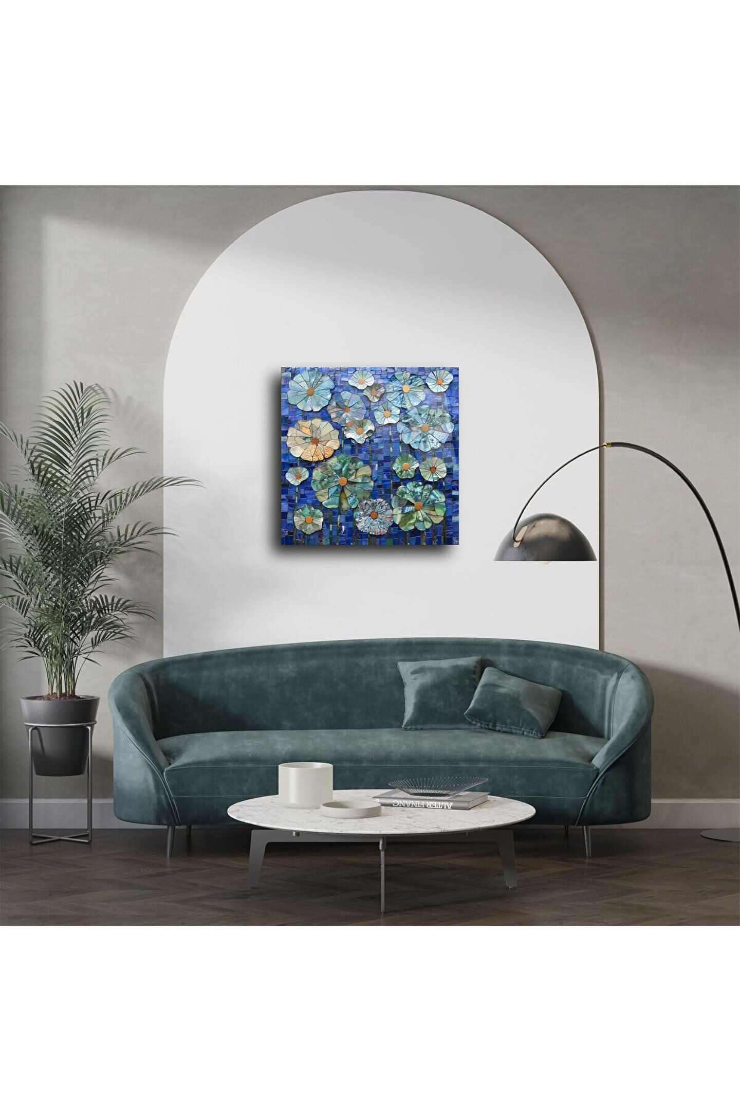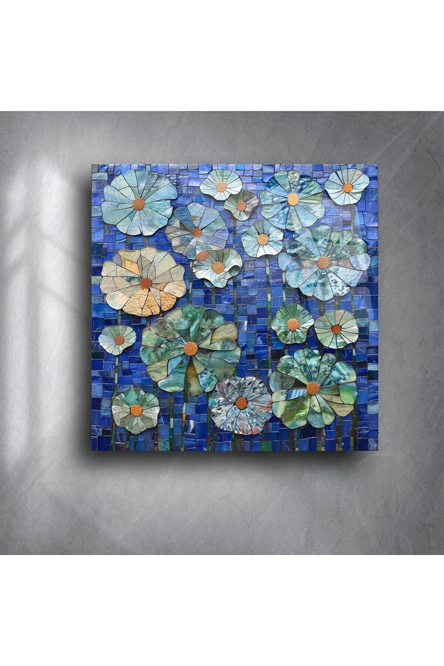 Doğanın huzurunu sanatla buluşturan bu mavi çiçek desenli mozaik cam tablo, yaşam alanlarınıza taze bir nefes ve zarafet katıyor. Cam parçacıklarının titizlikle bir araya getirildiği bu el işçiliği sanat eseri, her bakışta yeni bir detay sunan benzersiz bir estetik sunar.