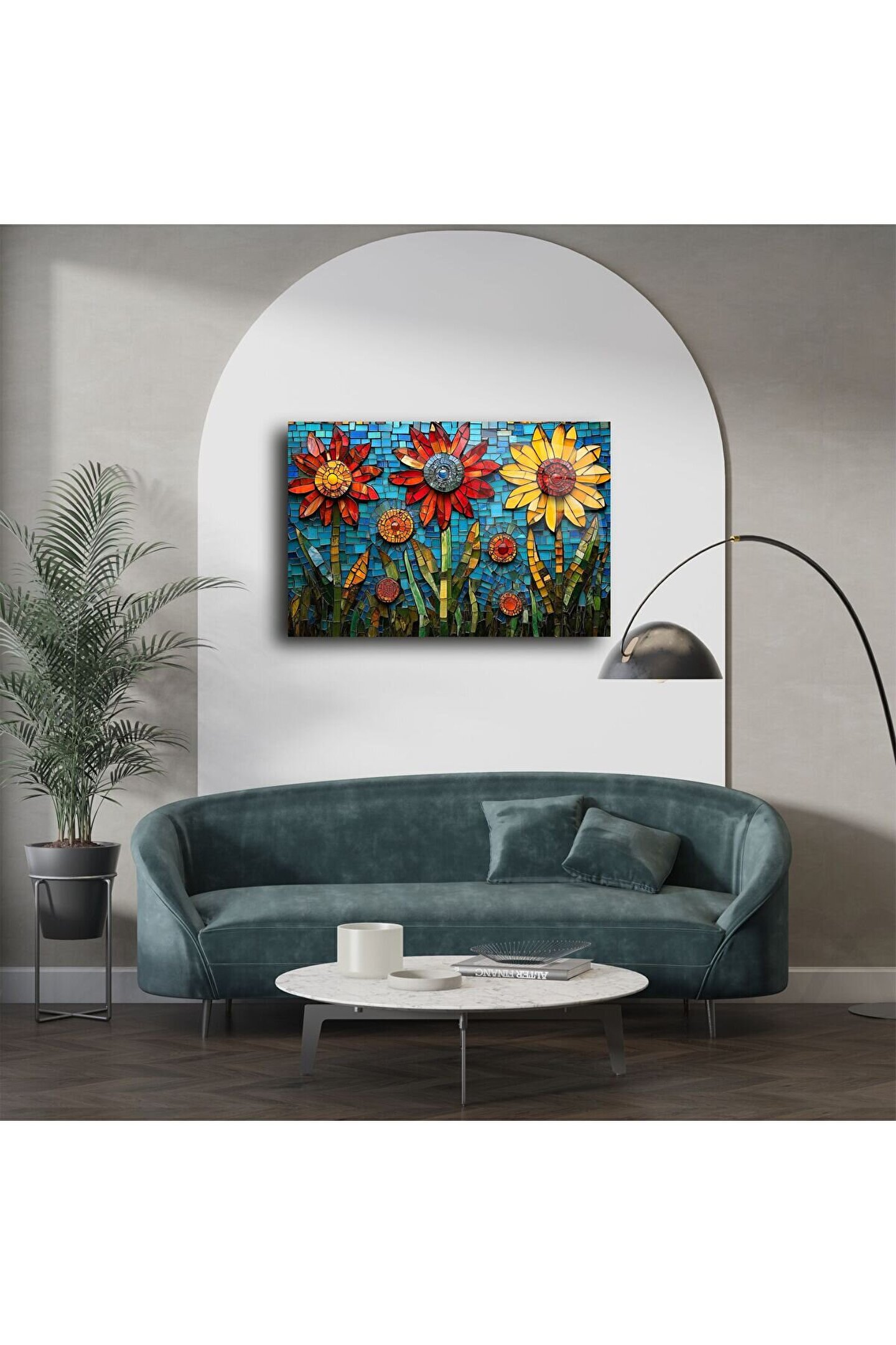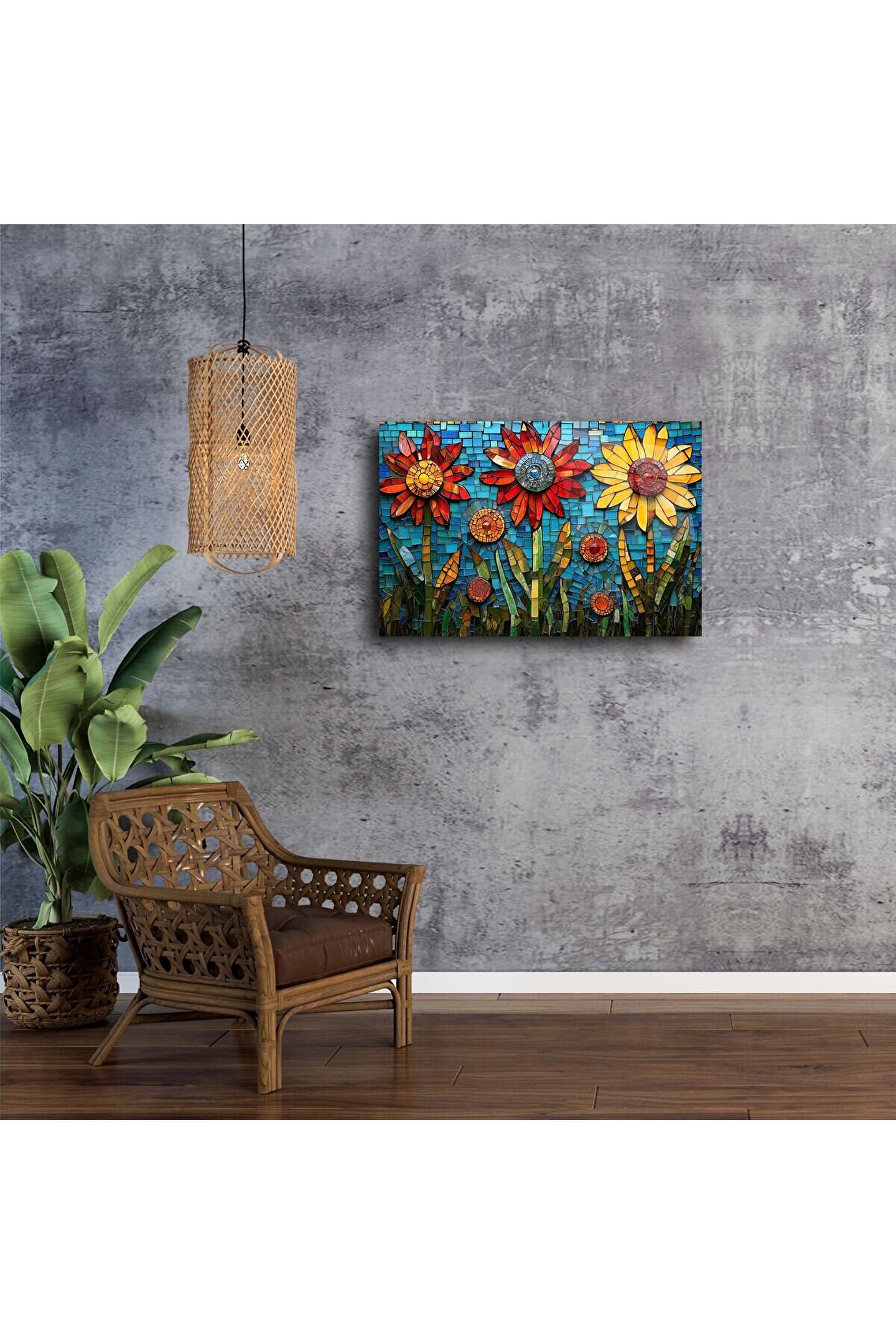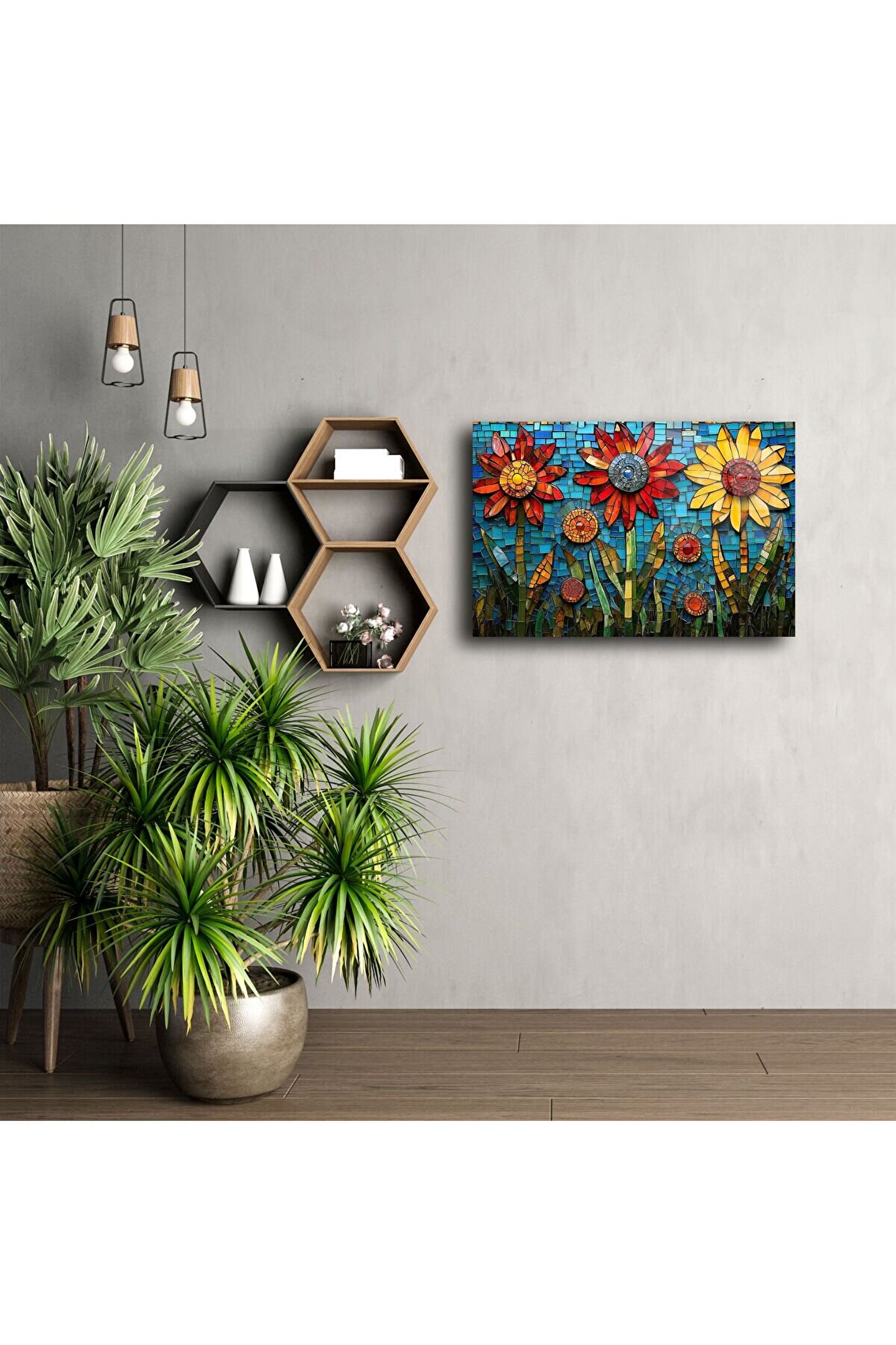 Özellikle doğal ışıkla birleştiğinde ışığı yansıtarak mekâna derinlik ve neşe katıyor. Modern, bohem ya da rustik dekorasyon tarzlarıyla uyum sağlar. Yalnızca bir tablo değil, aynı zamanda bir duygu yansımasıdır.
