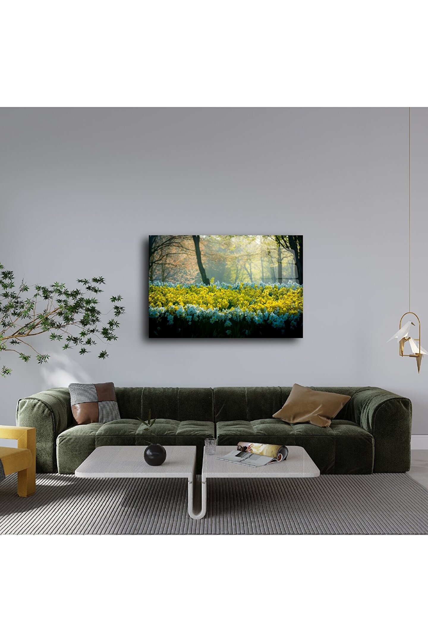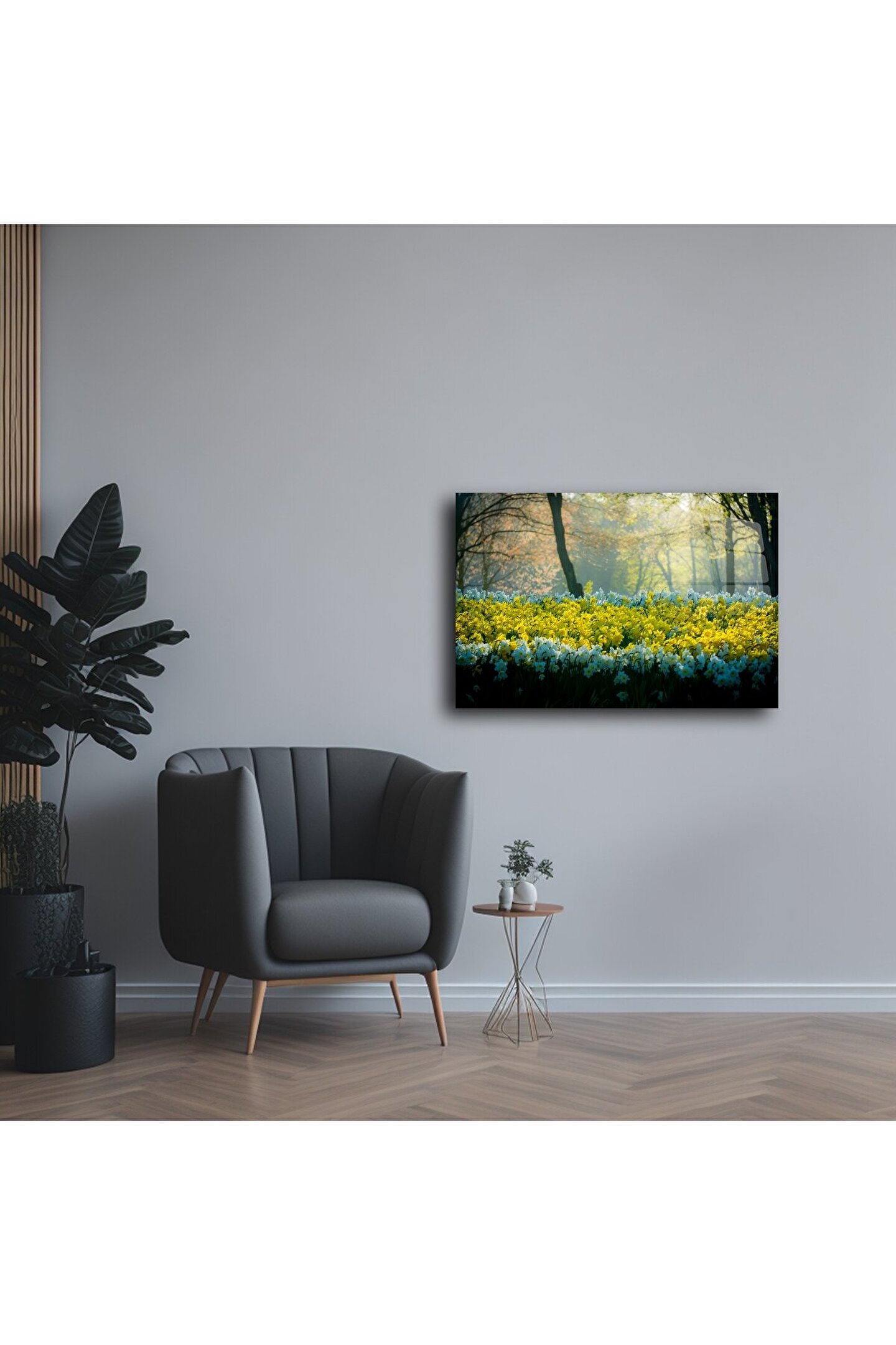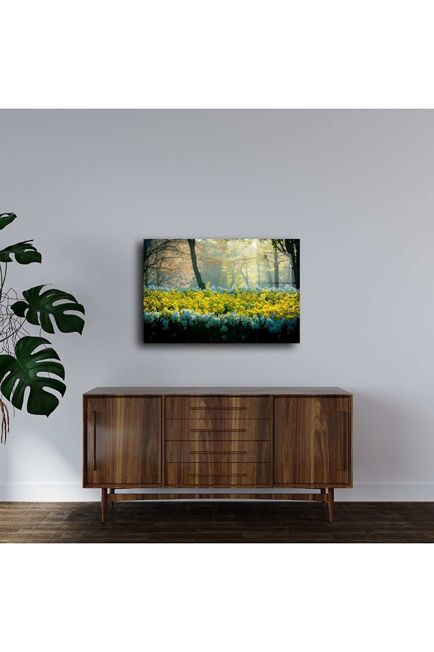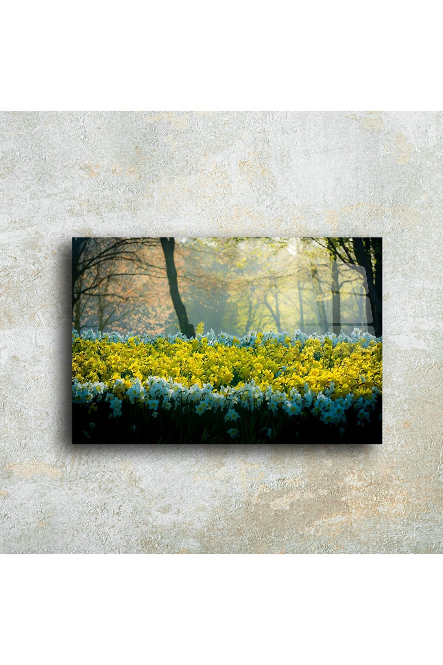 Doğanın zarafetini evinize taşıyın. Bu cam tablo, orman içinde açan sarı ve beyaz nergis çiçeklerinin yarattığı huzurlu bahar atmosferini duvarlarınıza getiriyor. Yumuşak ışık geçişleriyle çevrelenen bu sahne, yaşam alanlarınıza sakinlik ve tazelik katmak için mükemmel bir tercih.