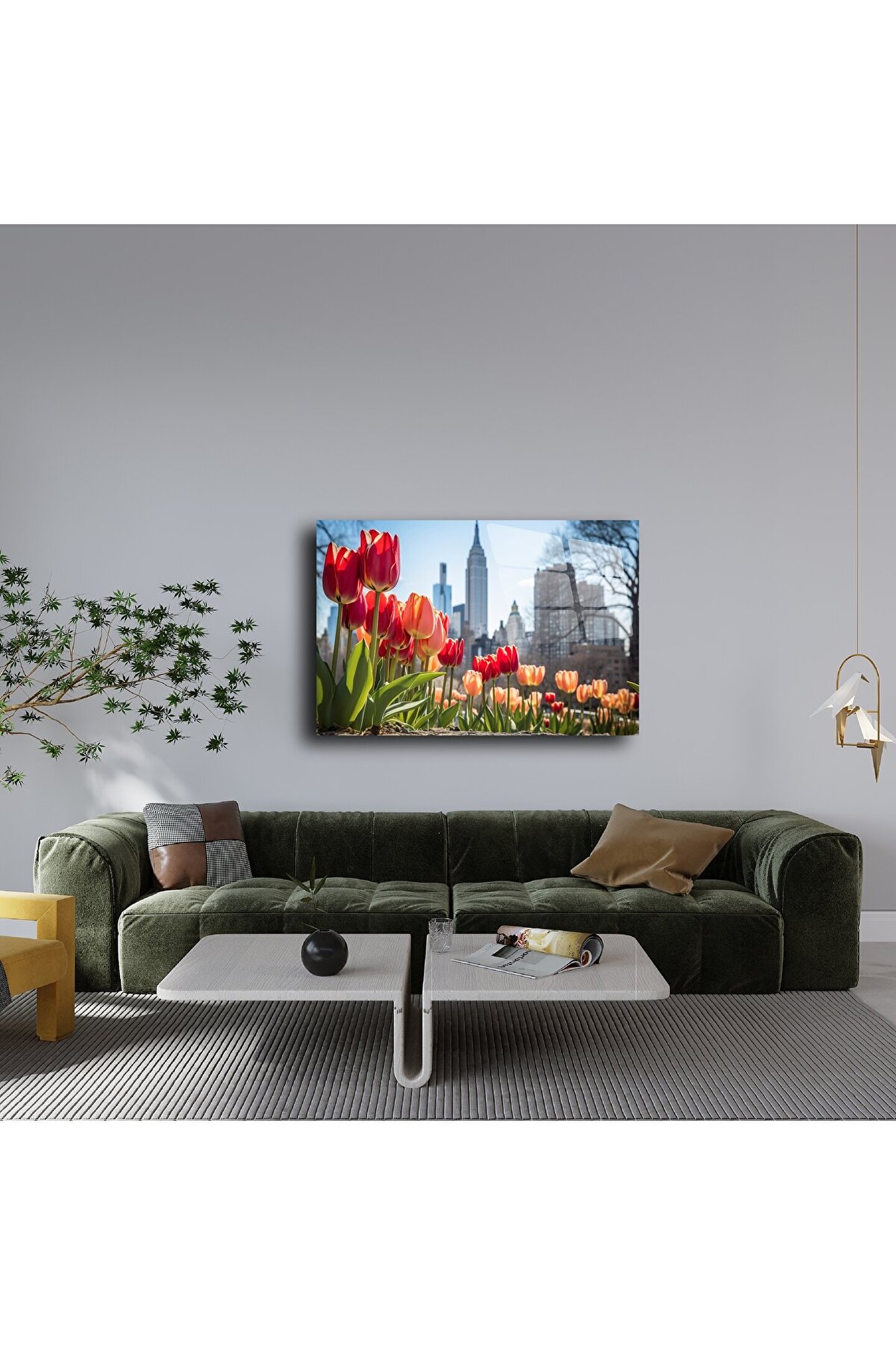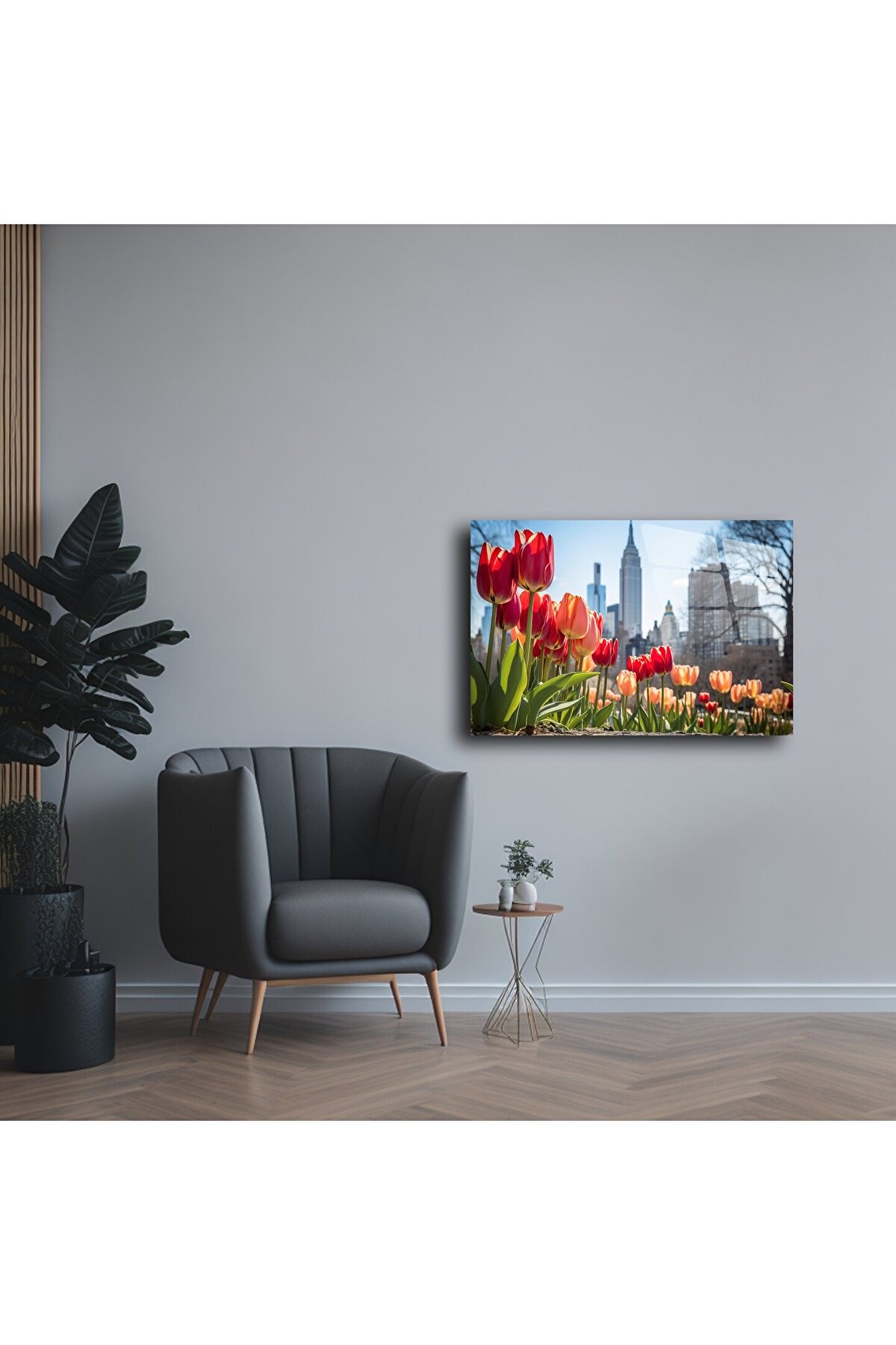 Şehir ve doğanın zarif buluşması: Bu cam tablo, renkli laleler eşliğinde yükselen New York siluetiyle hayat dolu bir kontrast sunar. Baharın taze enerjisi ile modern metropolün ikonik dokusu, evinize pozitif bir atmosfer katmak için buluşuyor.