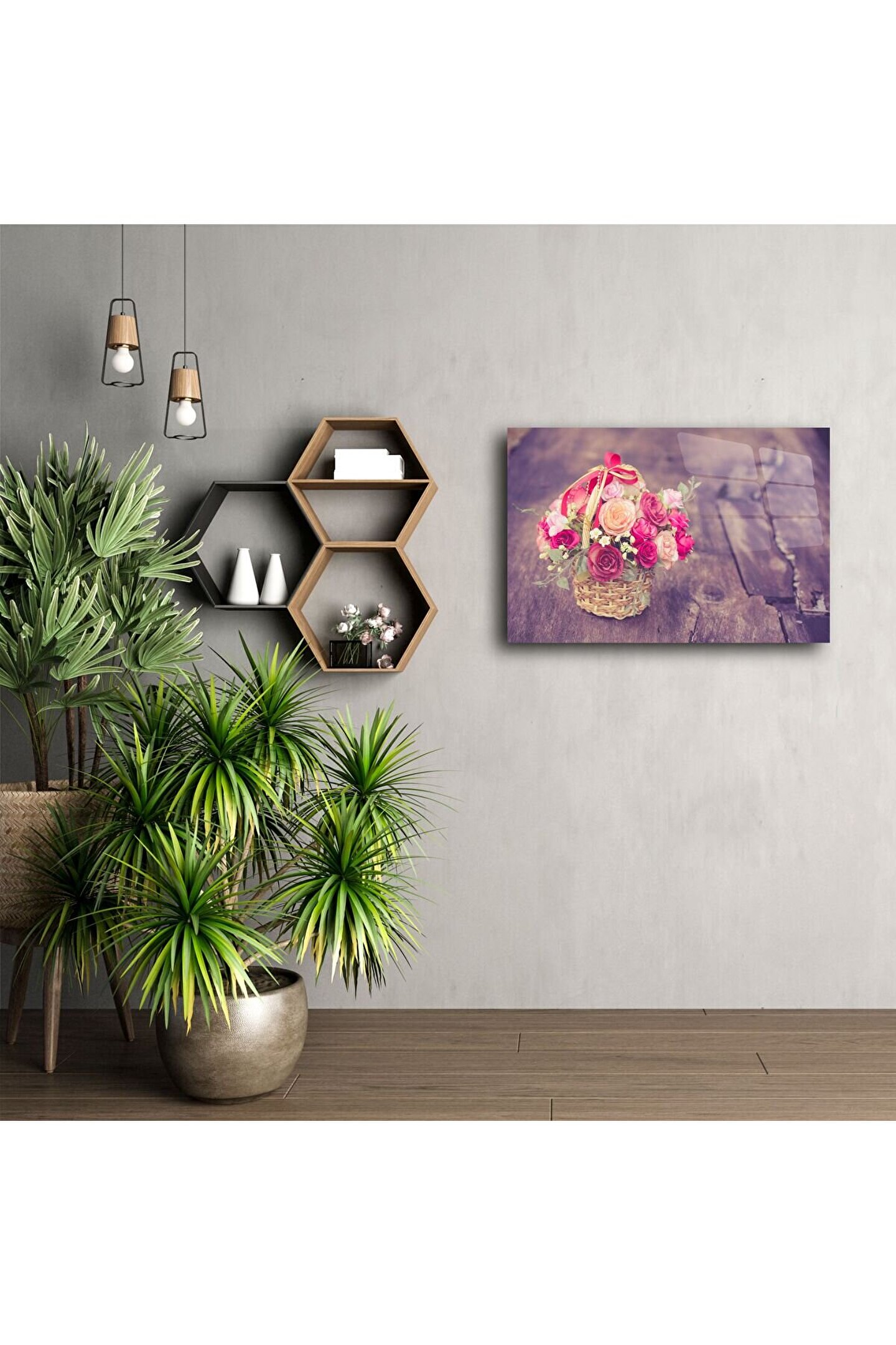 Bu romantik vintage çiçek sepeti posteri, yumuşak pembe ve pastel tonlarındaki güllerle kalbinize dokunur. Sepetin zarafeti ve arka planın rustik ahşap dokusu nostalji ve huzur hissi uyandırır.