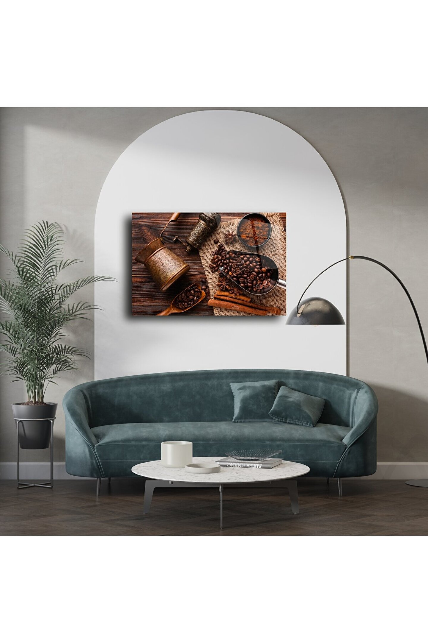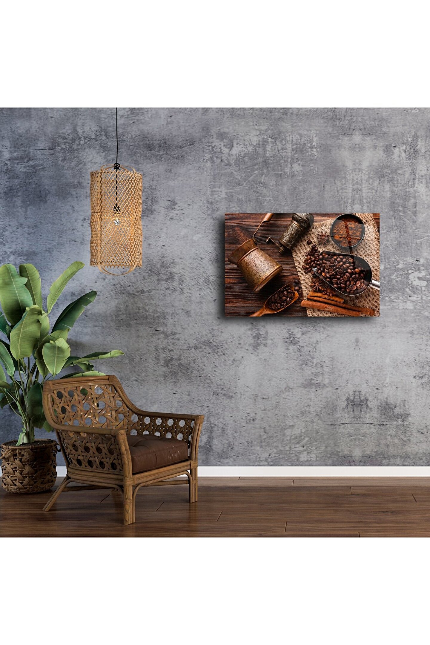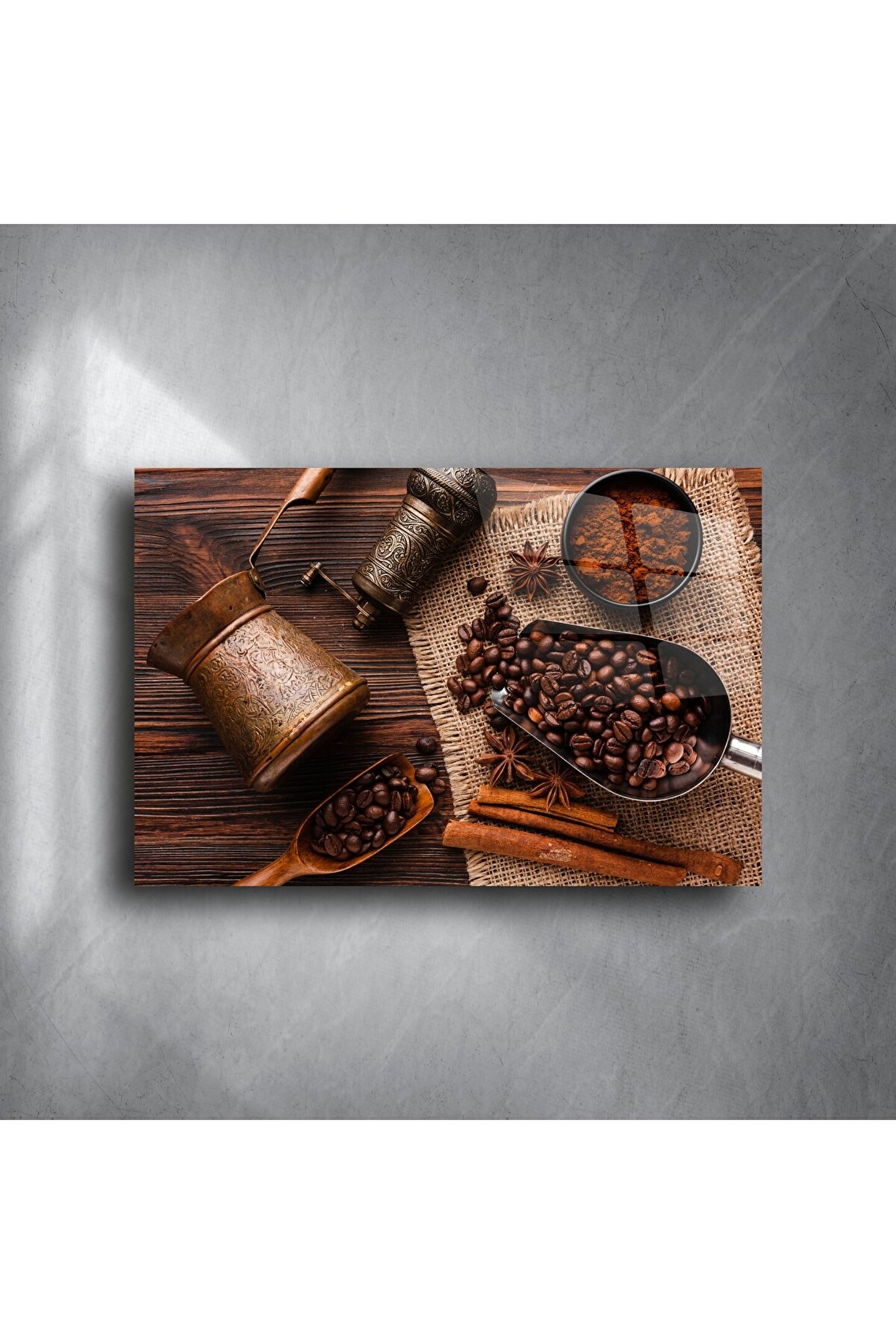 Zanaatın ve kahvenin sıcak ruhunu bir araya getiren bu Otantik Kahve Temalı Cam Duvar Tablosu, bakır kahve cezvesi, el değirmeni, taze çekirdekler ve baharat dokusuyla evinize nostaljik bir zarafet katıyor. Jüt kumaş üstü kompozisyon, rustik estetikle zenginleştirilmiş otantik kahve kültürünü yansıtıyor.