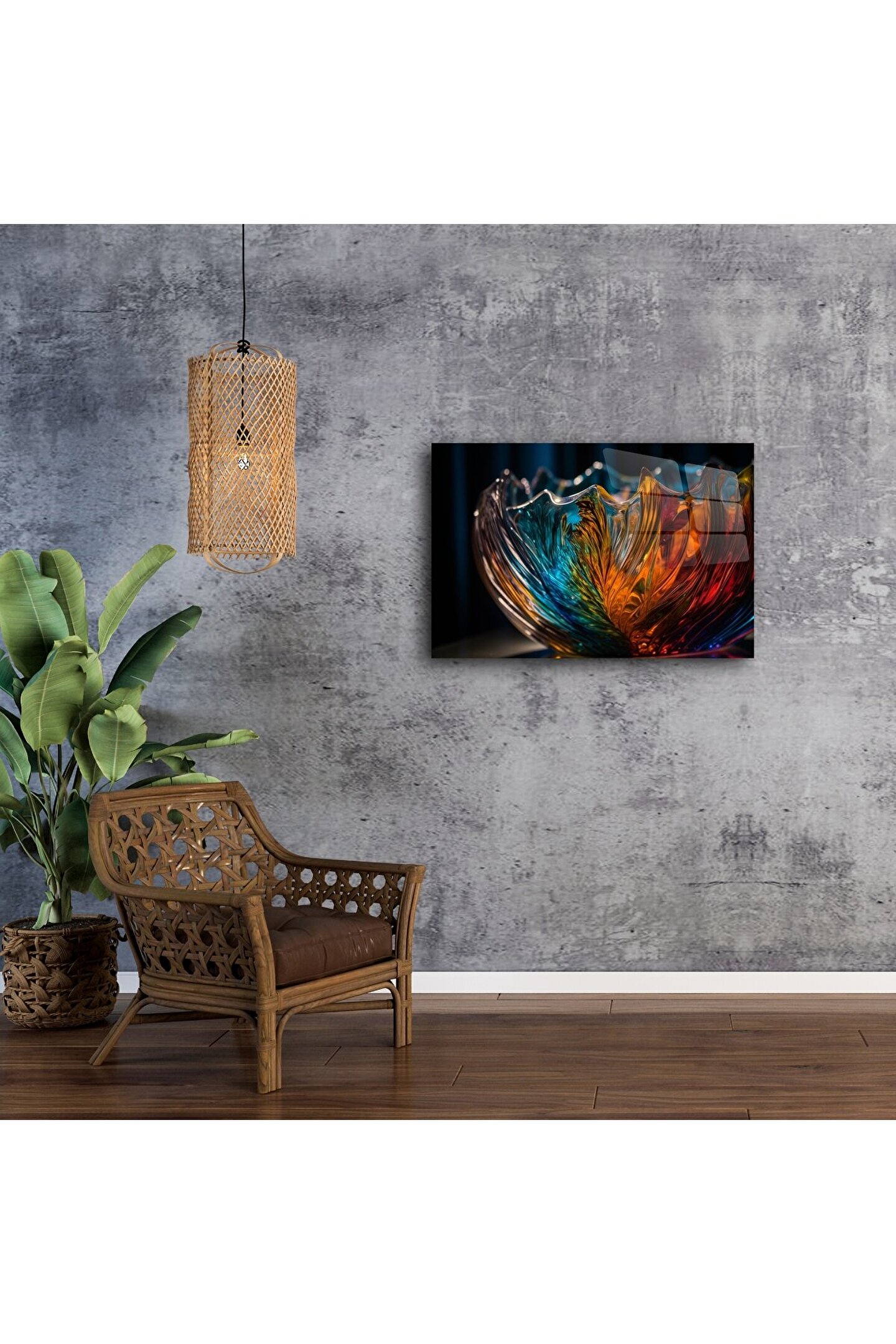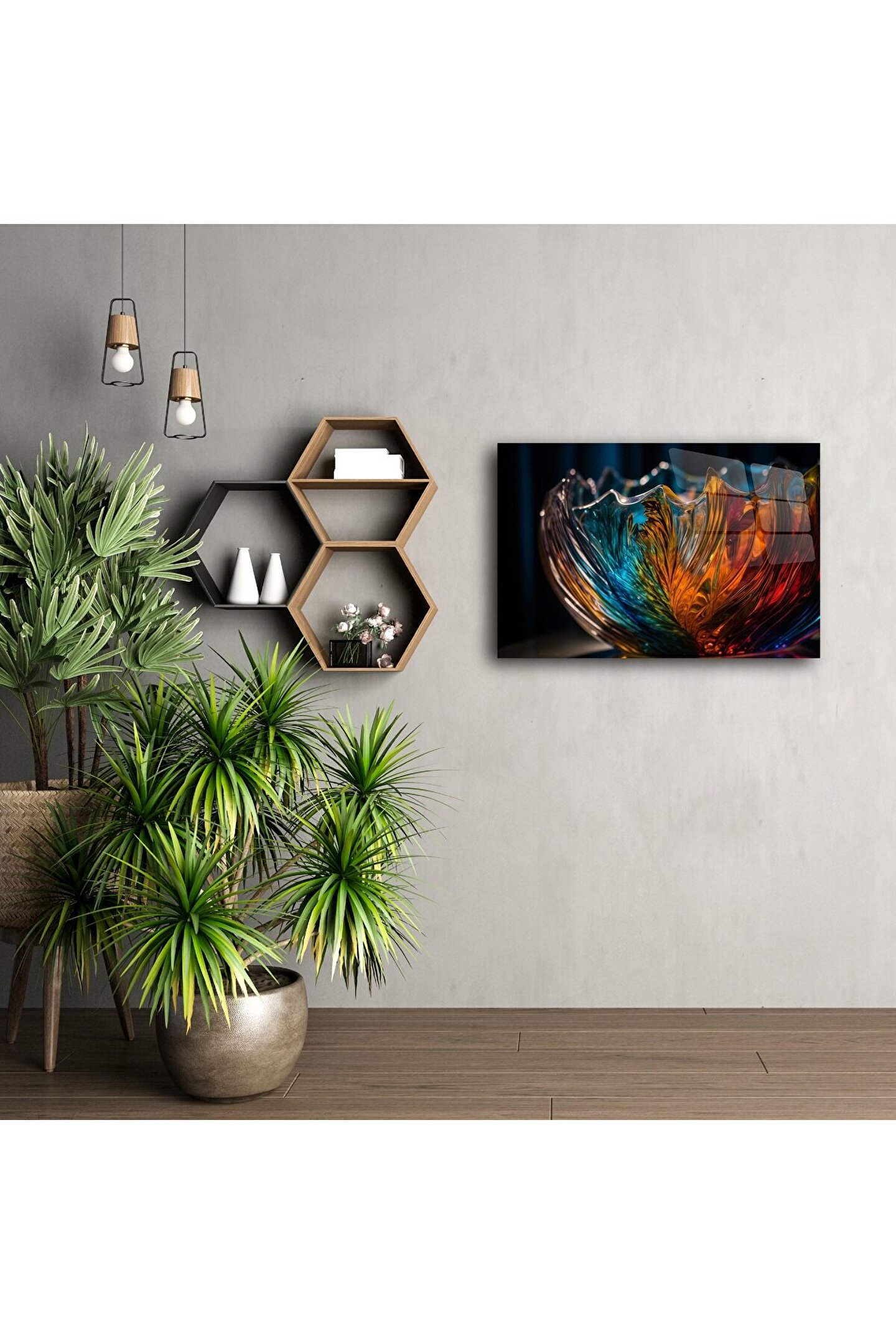 Eşsiz bir estetik formda şekillenen bu cam tablo, zarif dalga yapıları ve renklerin akışkan uyumuyla ev dekorasyonunuza lüks bir imza atıyor. Turuncudan maviye, kırmızıdan sarıya uzanan renk geçişleri, göz alıcı cam kase detaylarıyla birleşerek üç boyutlu bir sanat şöleni sunuyor.