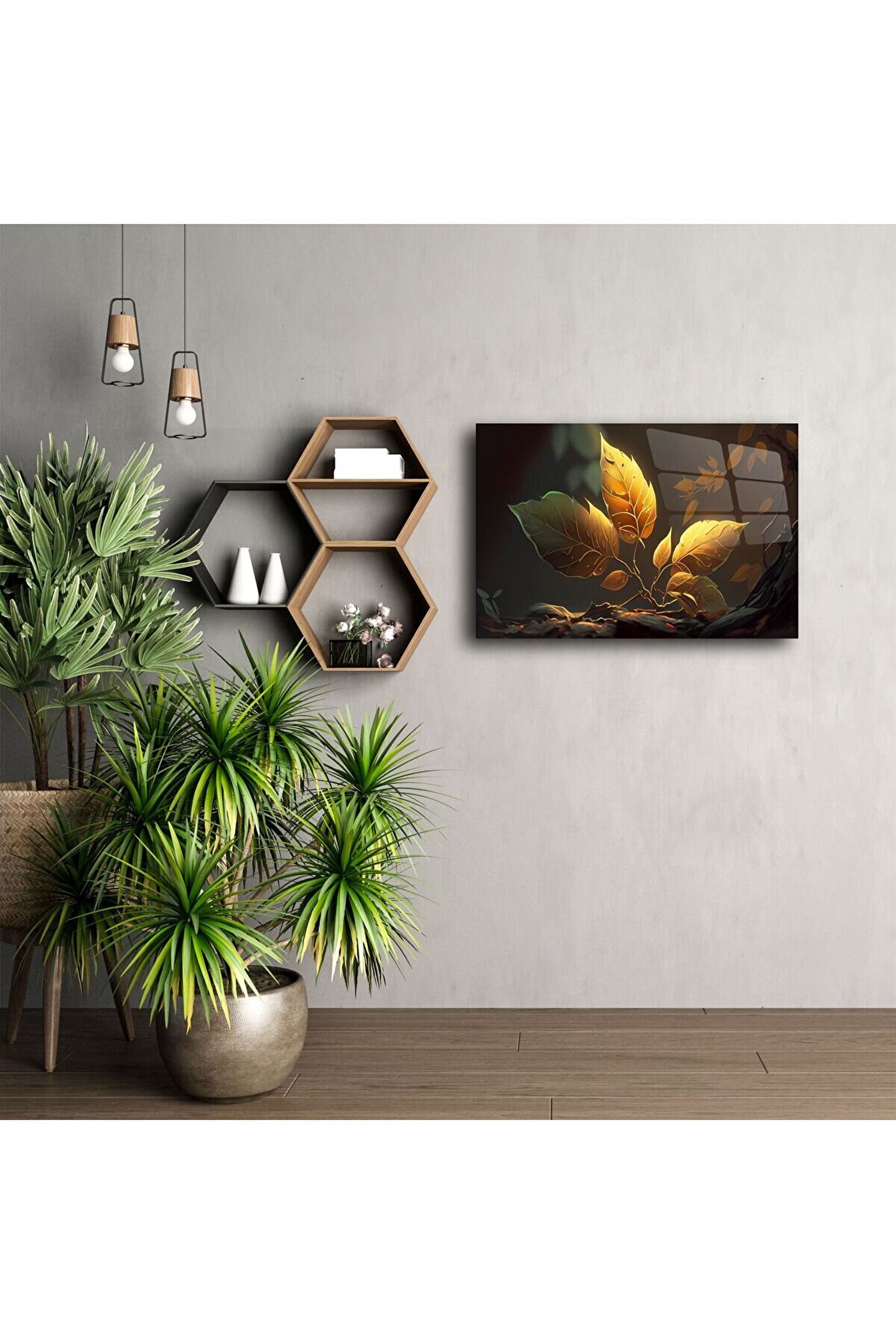 Zarif ve güçlü bir doğa simgesi olan altın yapraklar, ışıkla dans eden bu cam tablo üzerinde hayat buluyor. Gerçek cam panel üzerine yüksek çözünürlüklü olarak basılan bu yaprak sanatı, modern doğa temalı dekorun en estetik halini sunuyor.