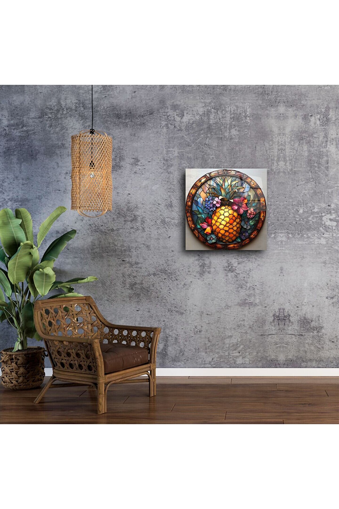 Canlı renkleri ve benzersiz vitray tarzıyla tasarlanmış bu Ananas Temalı Cam Tablo, mekanınıza tropikal bir neşe ve zarafet katıyor. El işçiliği detaylar ve çiçekli kompozisyon, yaşam alanlarınızı sanat galerisine çeviriyor.