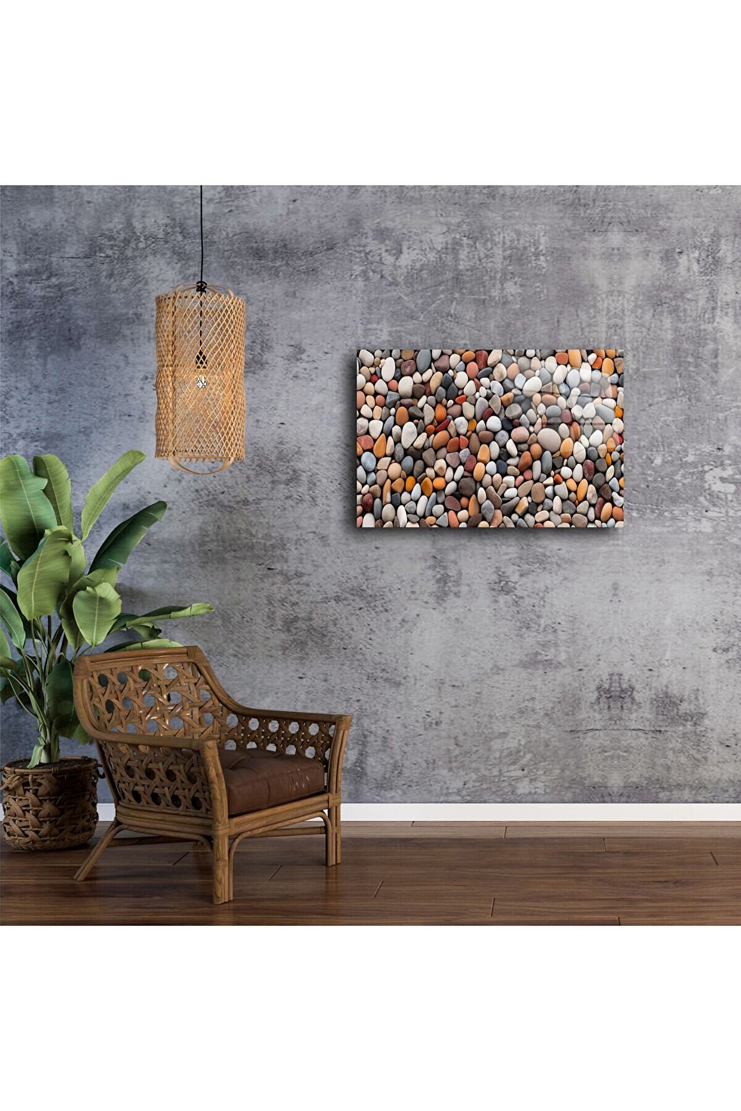 Bu renkli çakıl taşları desenli cam tablo, doğanın denge ve huzur veren enerjisini iç mekânlarınıza taşır. Her biri farklı renk ve dokudaki yumuşak formlu taşlar, sakinleştirici bir atmosfer yaratırken mekânlara doğal bir canlılık kazandırır. Yüksek çözünürlüklü baskı ile temperli cam yüzeyde birleşen bu tasarım, şıklığı ve sadeliği bir arada sunar.