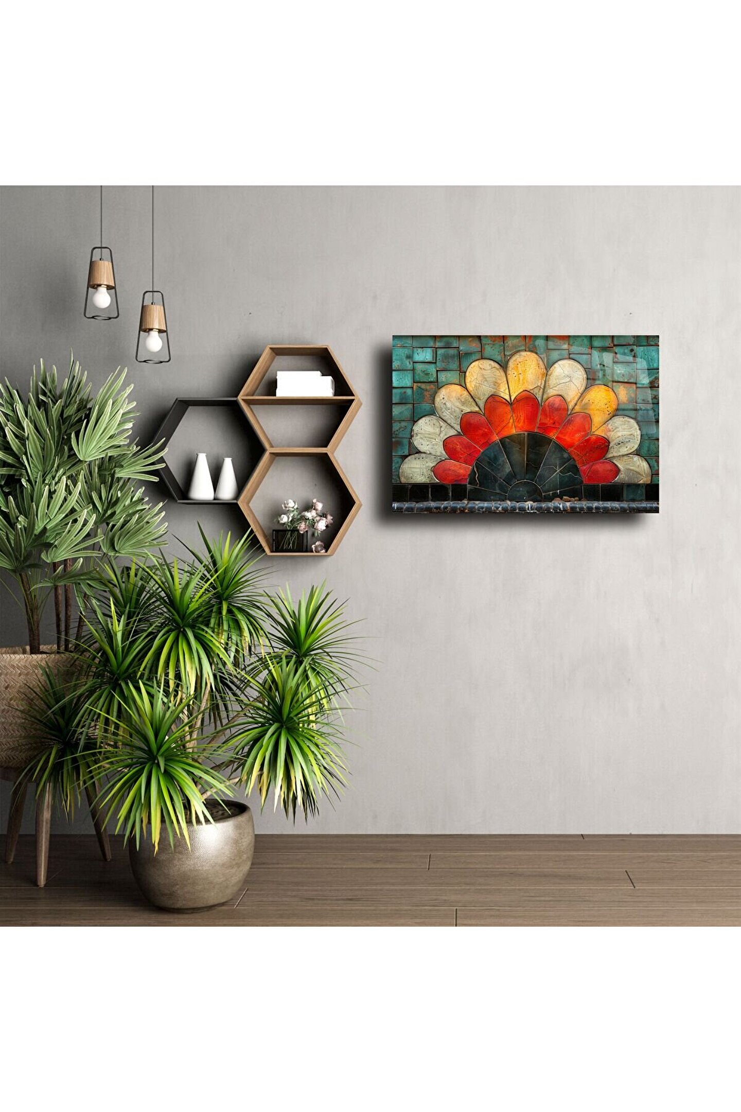 Bu renkli cam mozaik çiçek tablo, yaşam alanınıza neşe ve enerji katmak için ustalıkla elde üretildi. Işıltılı vitray camlarla hazırlanan bu eser; kırmızı, sarı, mavi ve yeşilin göz alıcı tonlarıyla çiçekleri adeta canlandırıyor. Her yaprak, her detay zarif bir işçiliğin parçası.