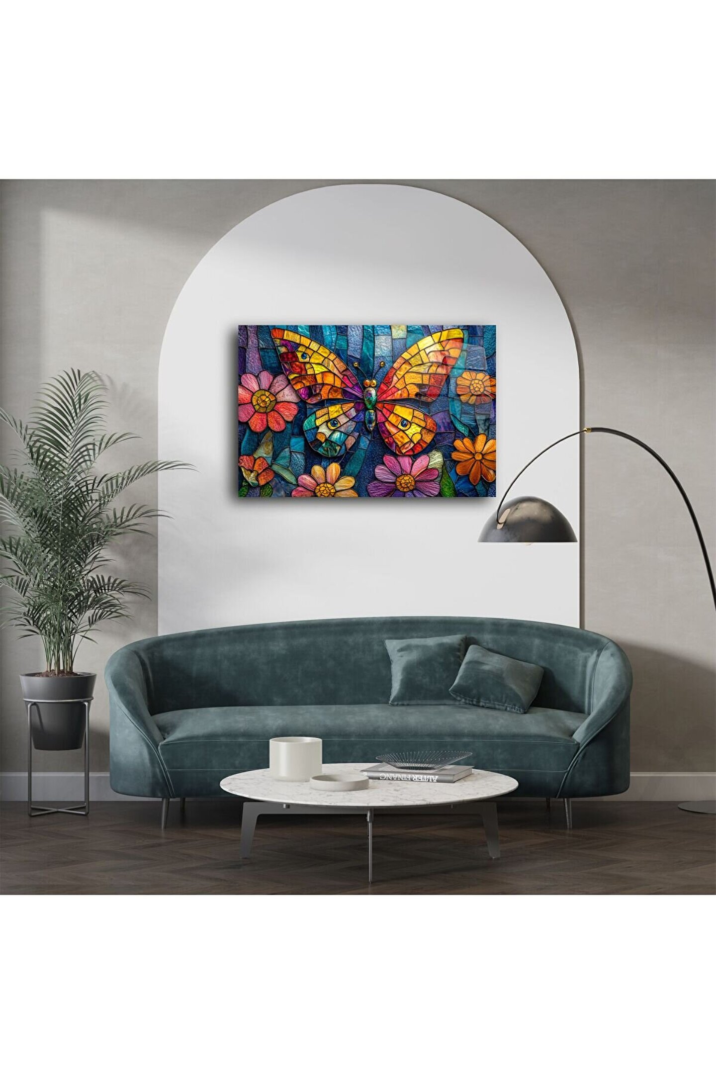 El yapımı cam mozaik kelebek duvar sanatı, doğal taşların ışıltısı ve canlı cam renklerinin buluşmasıyla öne çıkıyor. Bu tablo, kelebek ve çiçeklerin simgelediği yeniden doğuşu, umudu ve pozitif enerjiyi evinize taşıyor. Her parça, usta eller tarafından tek tek yerleştirilen cam mozaiklerden oluşur ve ışıkla büyüleyici bir dans yaratır.