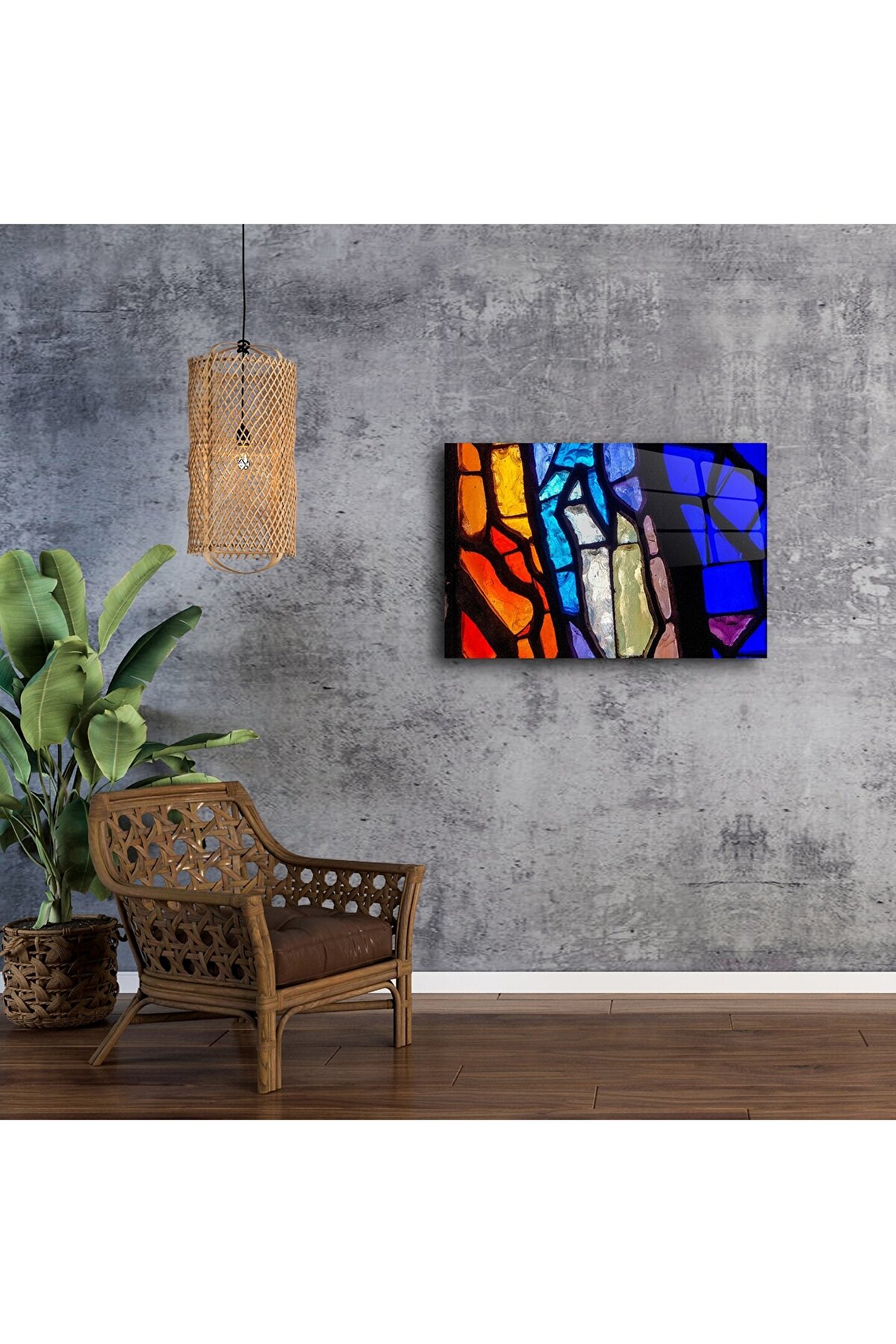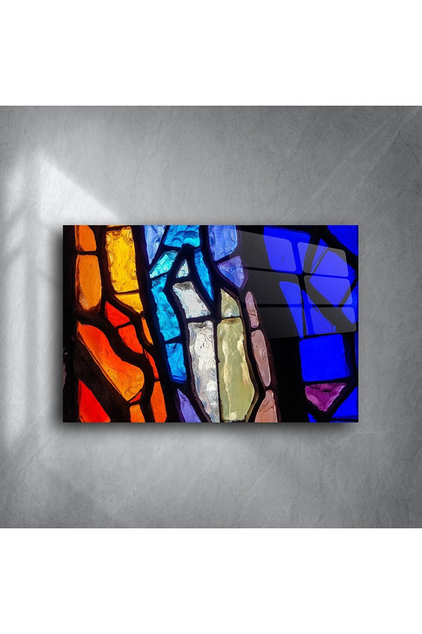 Renkli camın büyüleyici dokunuşuyla tasarlanmış bu soyut vitray tablo, ışığın oyunuyla hayat bulan bir sanat eseridir. El işçiliğiyle üretilen bu cam tablo, modern mekanlara sofistike bir ruh katar.