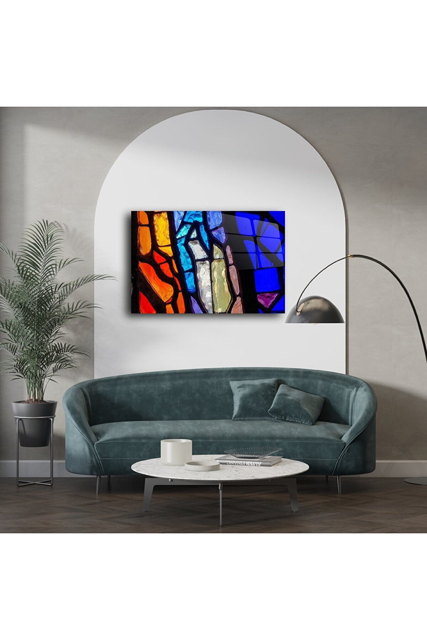 Renkli camın büyüleyici dokunuşuyla tasarlanmış bu soyut vitray tablo, ışığın oyunuyla hayat bulan bir sanat eseridir. El işçiliğiyle üretilen bu cam tablo, modern mekanlara sofistike bir ruh katar.