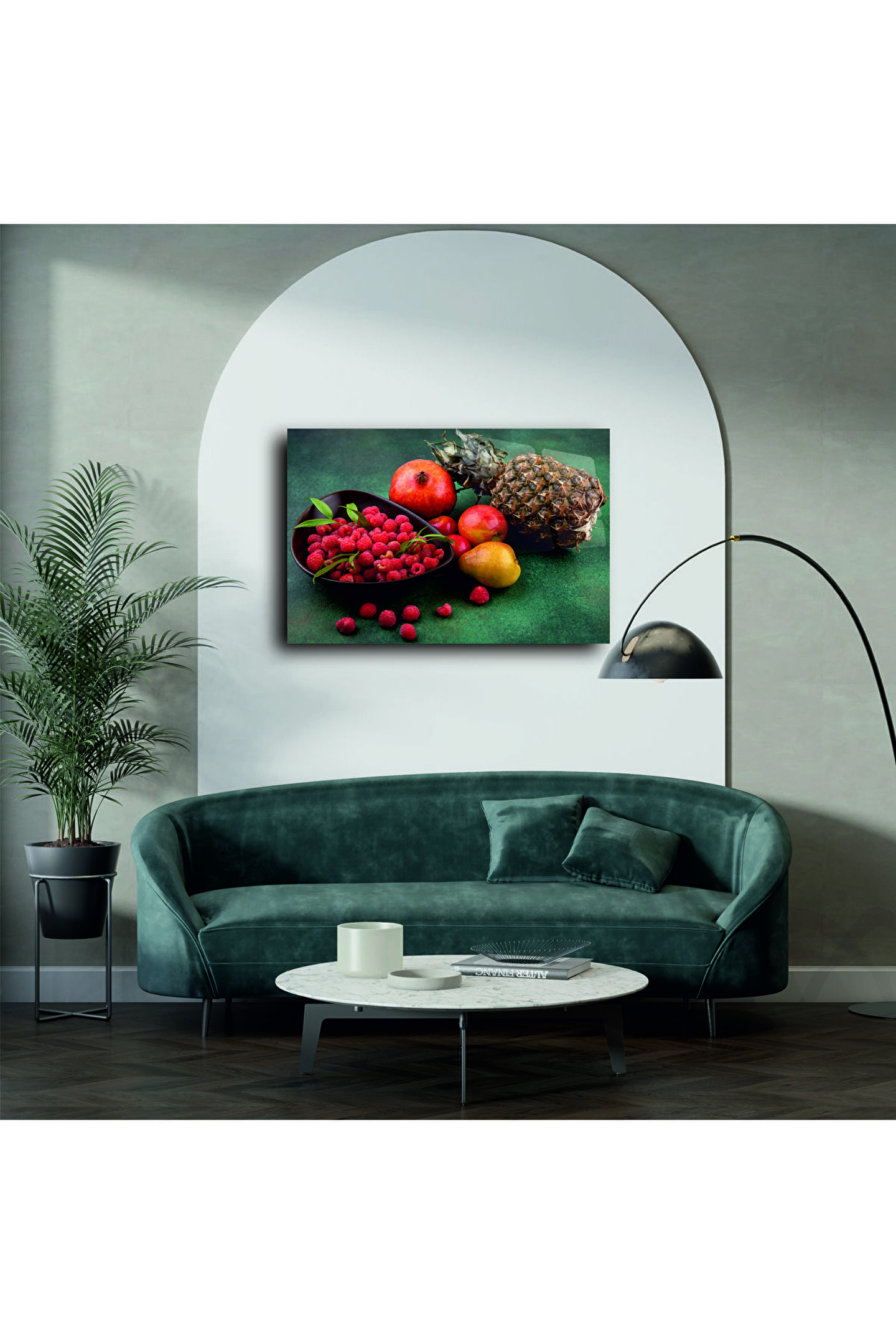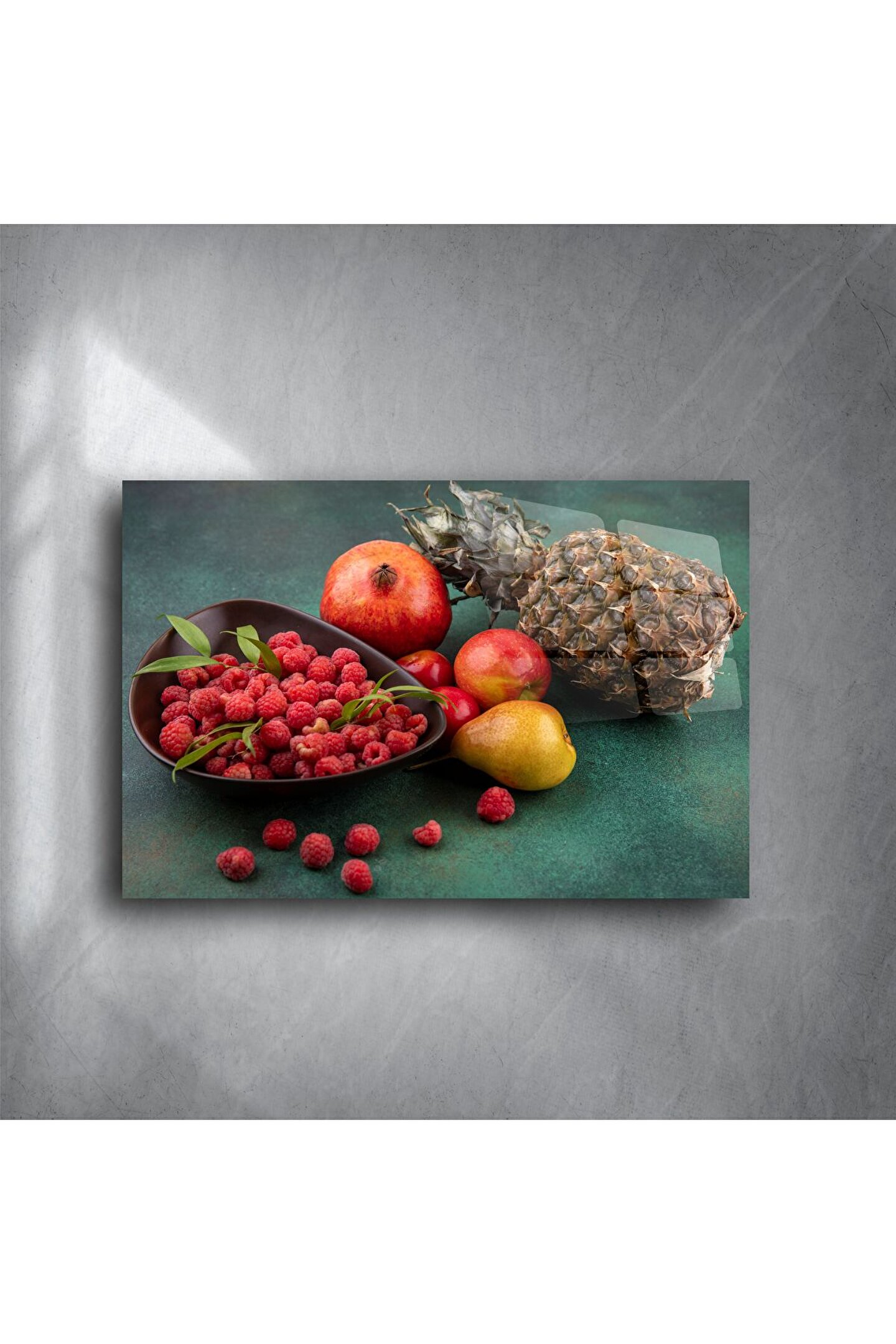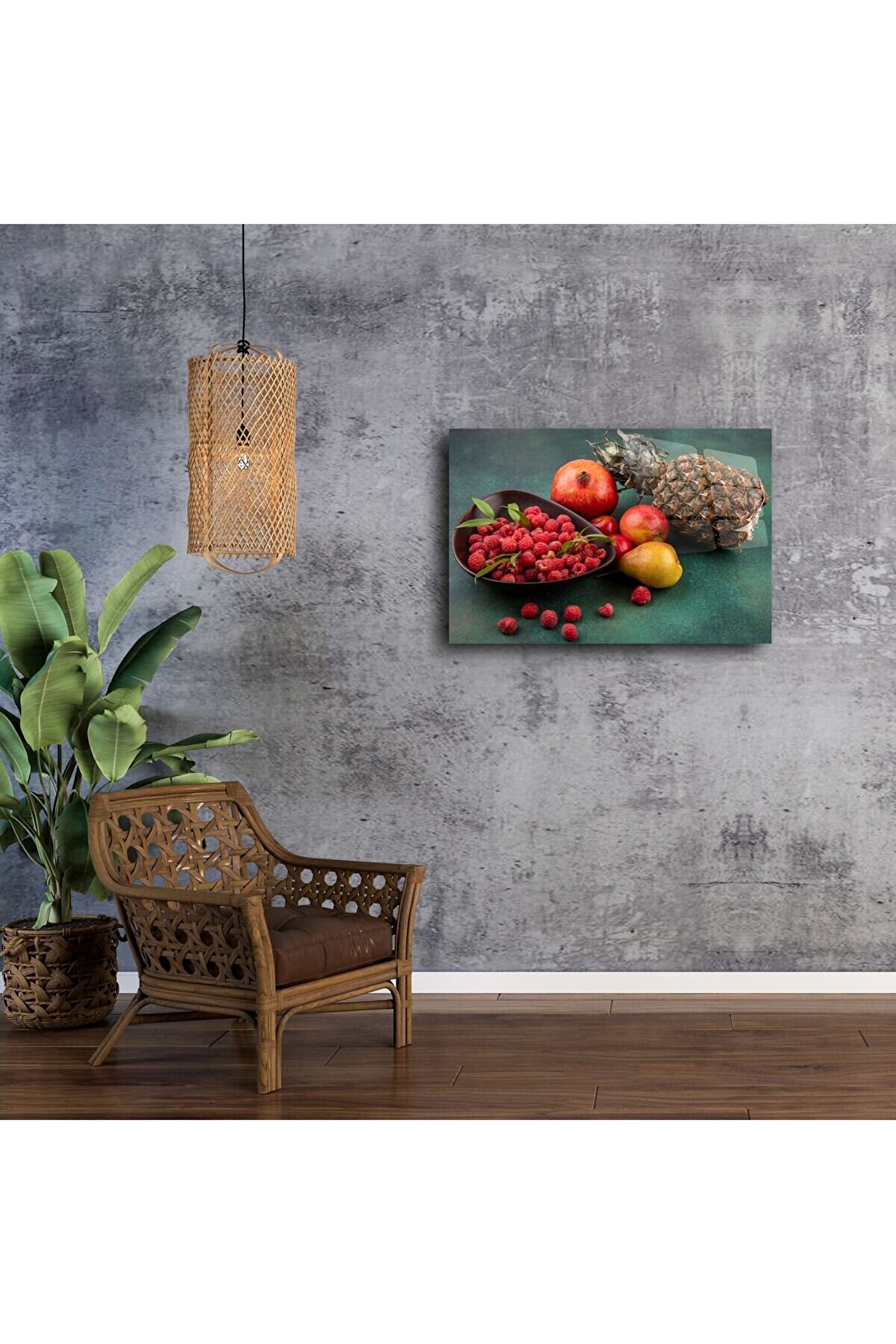 Renkli tropikal meyve kompozisyonlu bu cam tablo, mutfağınıza veya salonunuza canlılık ve sofistike bir enerji katmak için tasarlandı. Yüksek çözünürlükte basılan meyve görselleri, gerçekçilikle sanatı birleştirerek her bakışta tazelik hissi uyandırır.