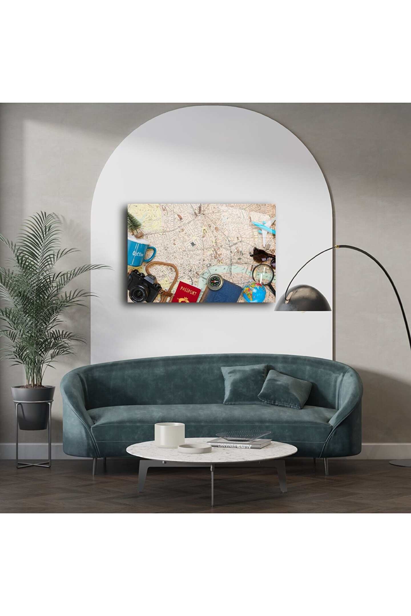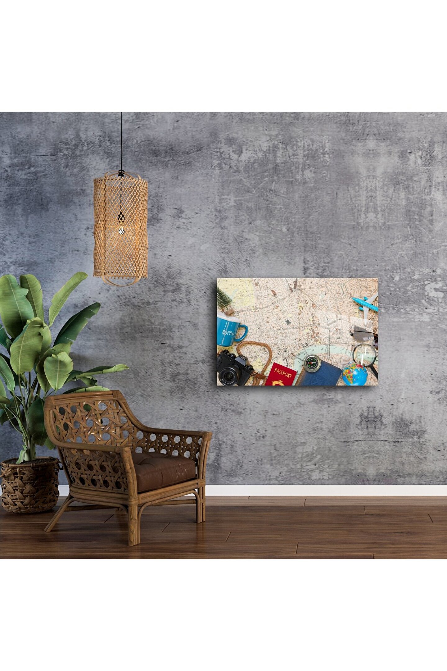 Seyahatin büyüsünü yansıtan bu retro tasarımlı cam tablo, vintage harita üzerinde pasaport, pusula, kamera ve dünya figürleriyle dekoratif bir yolculuk sunar. Evinizde keşif ruhunu yaşatmak, her bakışta macera hissi uyandırmak isteyenler için tasarlandı.