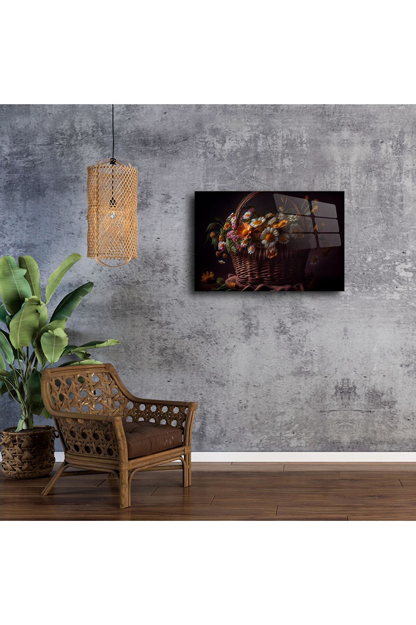 LEYLASER Rustik Hasır Sepette Papatya ve Bahar Çiçekleri Kanvas Cam Tablo