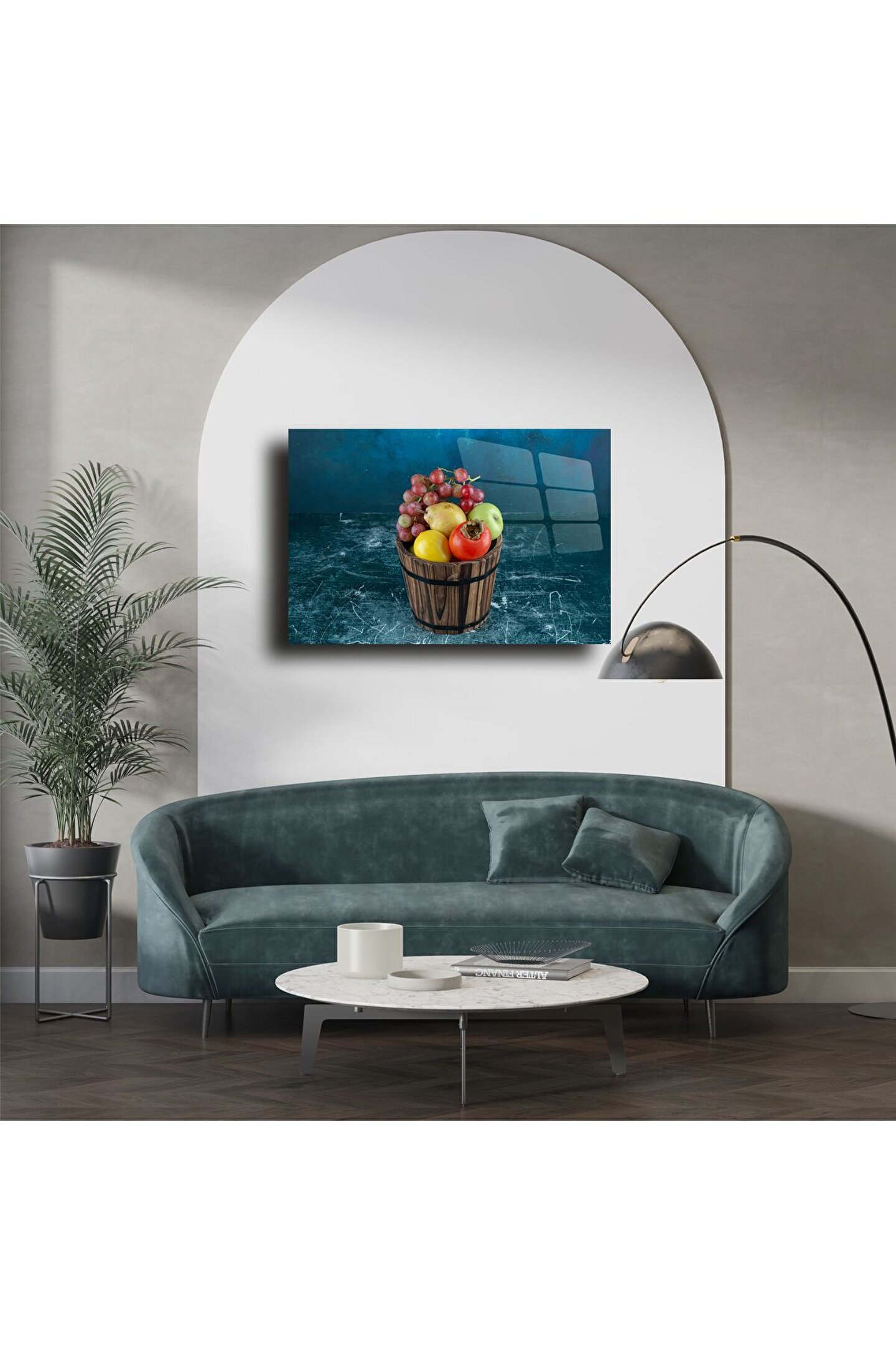 Doğal ve nostaljik atmosferin modern sanatla buluştuğu bu rustik meyve kovası temalı cam tablo, evinizin duvarlarında sıcak bir hikâye anlatır. Ahşap fıçı içindeki elma, nar, üzüm ve limon detaylarıyla zenginleşen bu tasarım, mavi ve dokulu fonuyla etkileyici bir derinlik sunar. Temperli cam yüzey, canlı renkler ve net detaylarla göz alıcı bir görünüm sağlar.