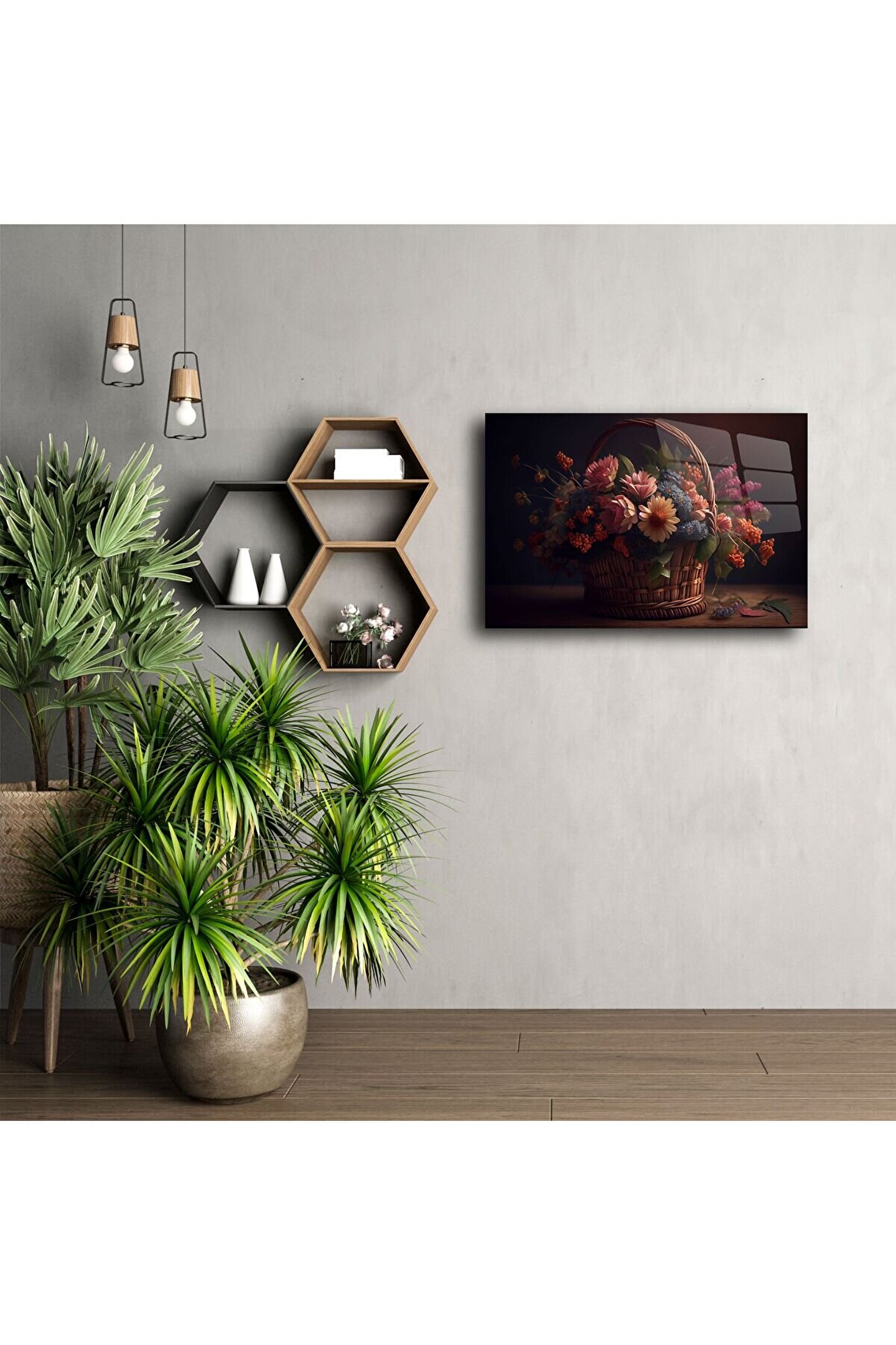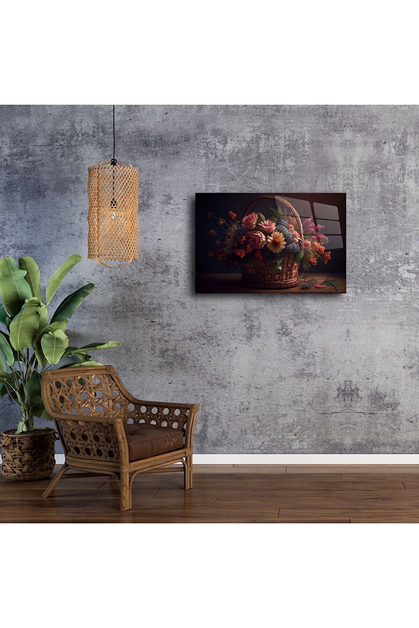 Rustik sepetli yapay çiçek aranjmanı baskısı, romantik bir zarafet ve pastoral bir sıcaklık sunarak yaşam alanınıza büyüleyici bir dokunuş katıyor. El yapımı gibi hissettiren bu tablo, vintage tarzı ve doğal pastel renkleriyle dinginlik ve nostalji arayan ruhlara hitap eder.