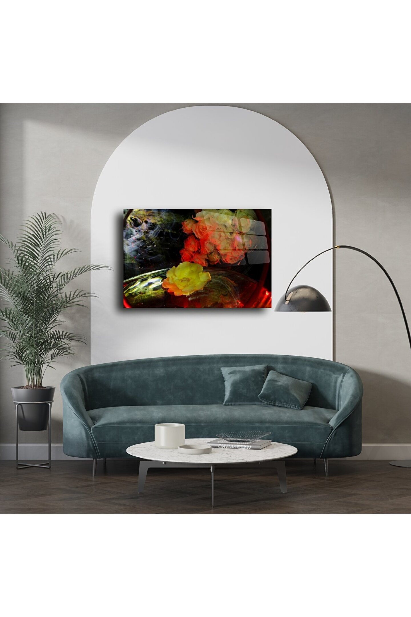 Bu etkileyici cam tablo, sarı ve kırmızı güllerin soyut ve derinlikli yansımalarıyla romantizmi modern sanatla buluşturuyor. Parlak cam yüzeyin sunduğu yüksek netlik ve renk canlılığı, çiçeklerin zarafetini duvara taşıyor.