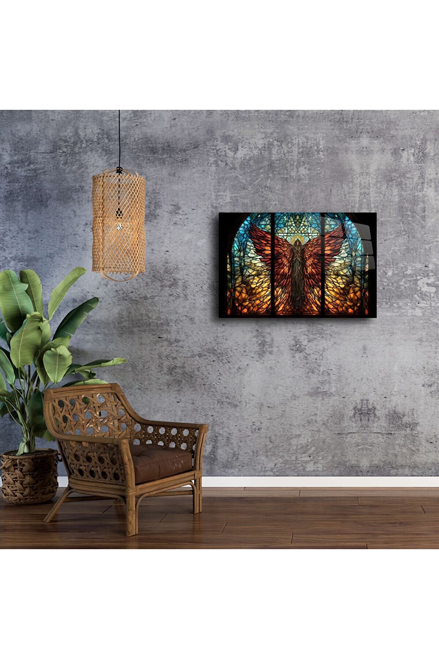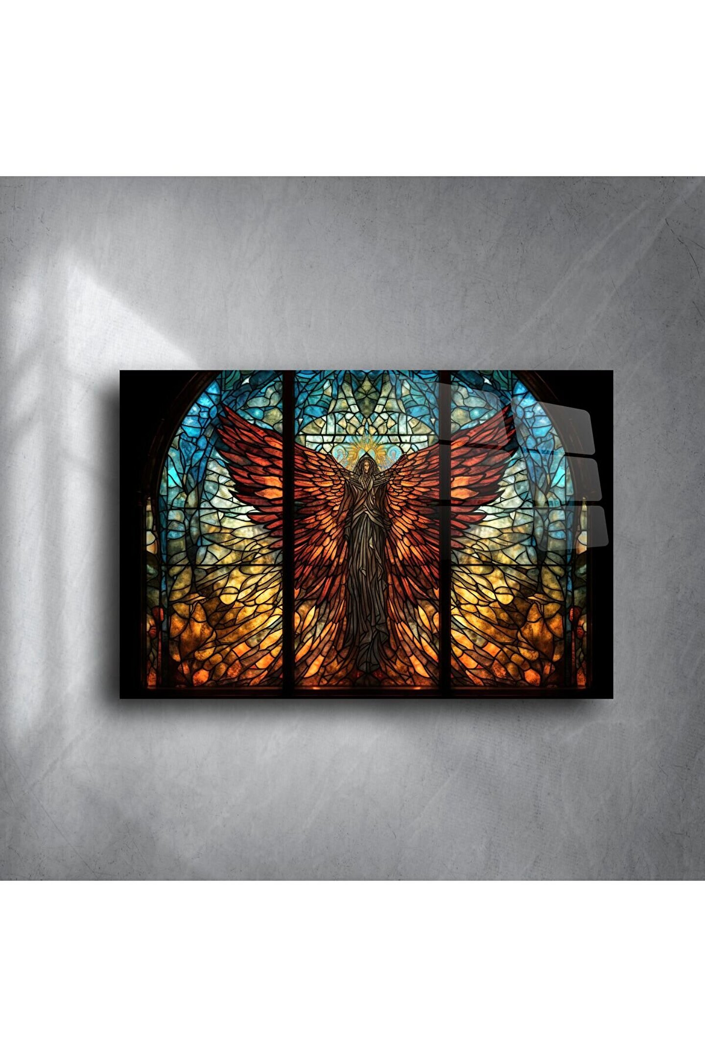 Bu büyüleyici cam tablo, alev gibi kırmızı kanatlara sahip mistik bir serafim melek figürünü vitray estetiğiyle göz alıcı şekilde sunar. Işığın içinden süzüldüğü bu detaylı tasarım, kutsal bir atmosfer yaratmak isteyen yaşam alanları için eşsiz bir tercihtir.