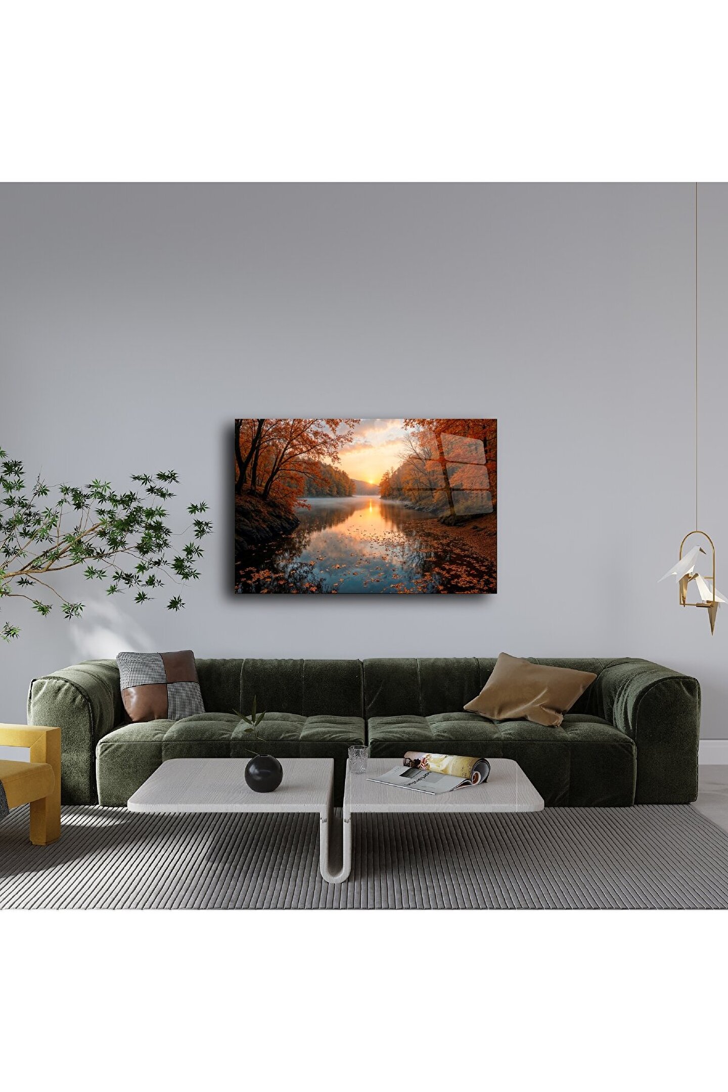 Bu büyüleyici cam tablo, sonbaharın sıcak tonlarını ve doğanın dinginliğini evinize taşıyor. Altın rengi yaprakların süslediği orman, göle yansıyan gün batımıyla birleşerek adeta huzurun cam üzerindeki yansıması oluyor.
