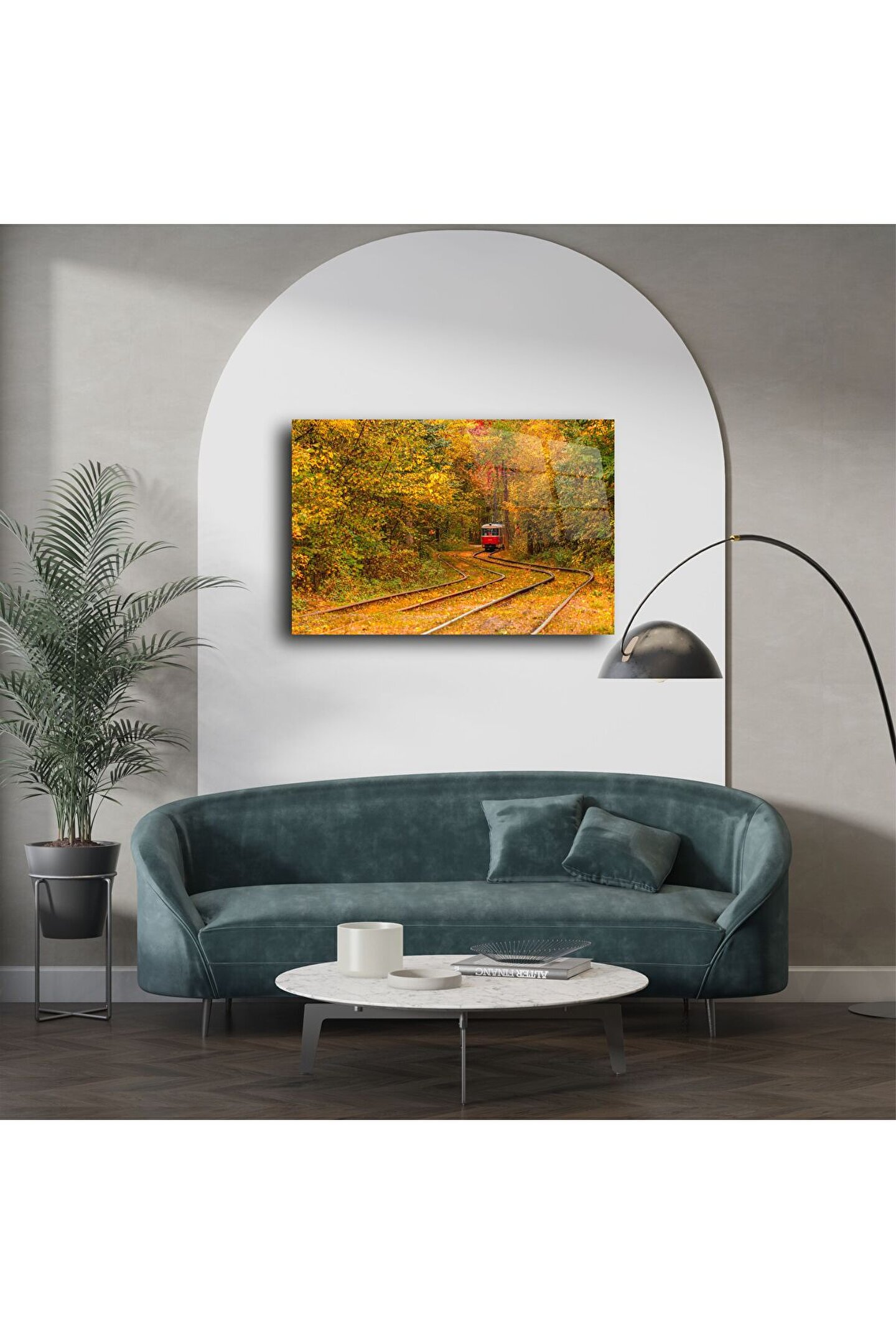 Nostaljiyi ve doğanın sıcaklığını bir araya getiren bu etkileyici cam tablo, sarı yapraklarla kaplı orman yolunda ilerleyen kırmızı tramvayı büyüleyici bir sahneyle sunuyor. Zamanın yavaş aktığı, huzurun hissedildiği bu manzara; evinizin ya da ofisinizin atmosferini tamamen değiştirecek.