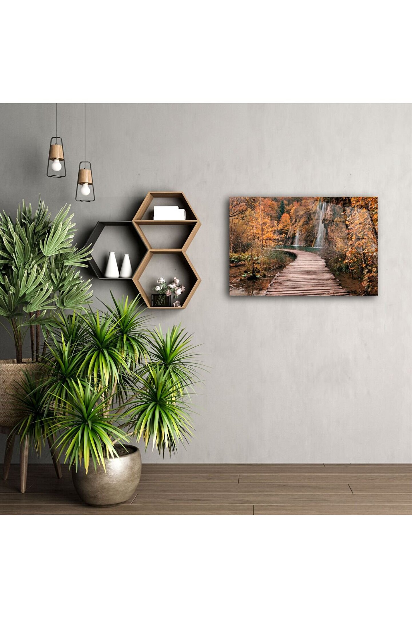 Sonbaharın büyüleyici renkleri, ahşap bir patika ve serinletici bir şelale... Bu özel cam tablo, doğayla iç içe olma hissini duvarlarınıza taşıyor. Renklerin geçişi, suyun hareketi ve ahşap dokunun huzuruyla birleşen bu sahne, modern yaşam alanlarında doğal bir nefes gibi yerini alır.