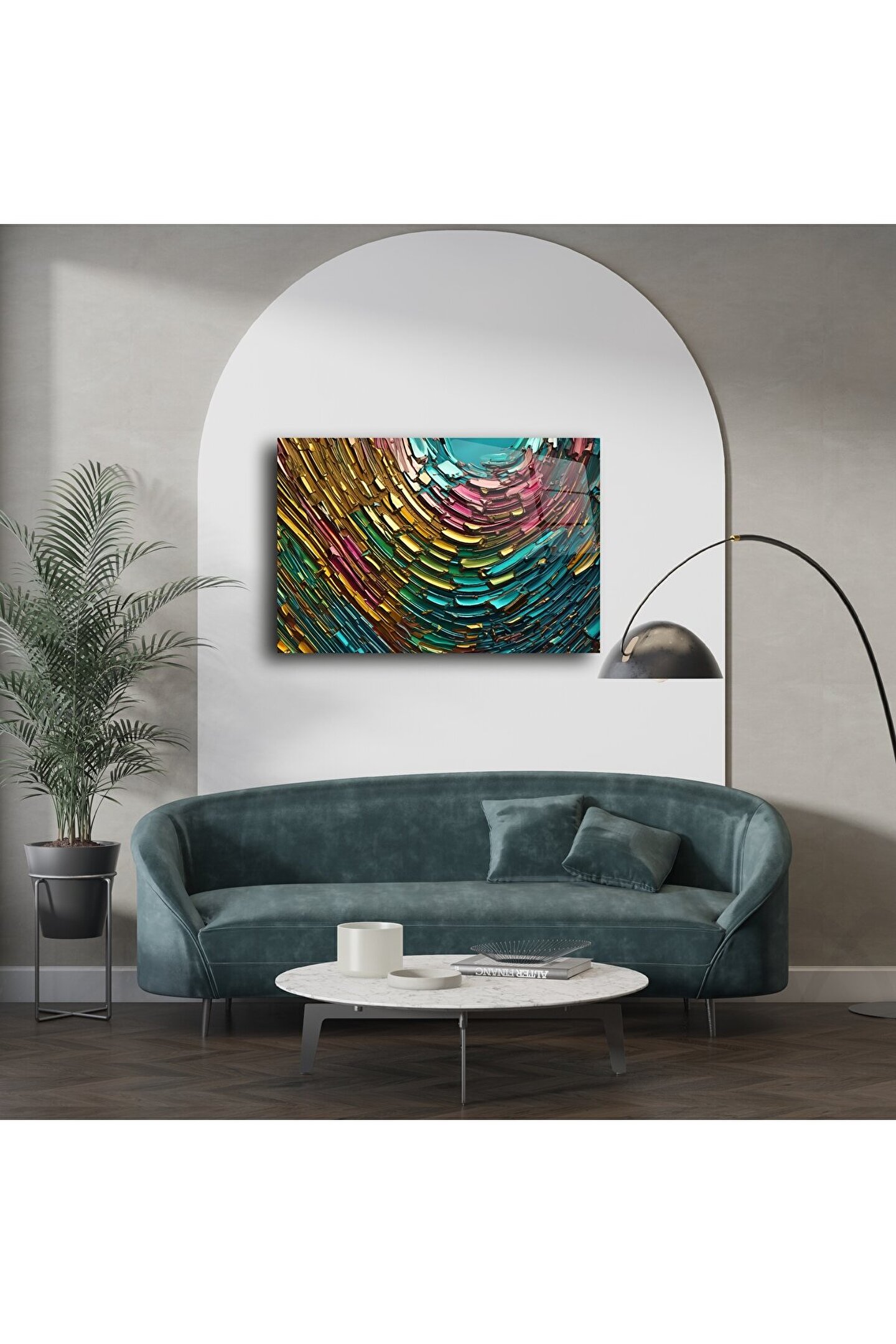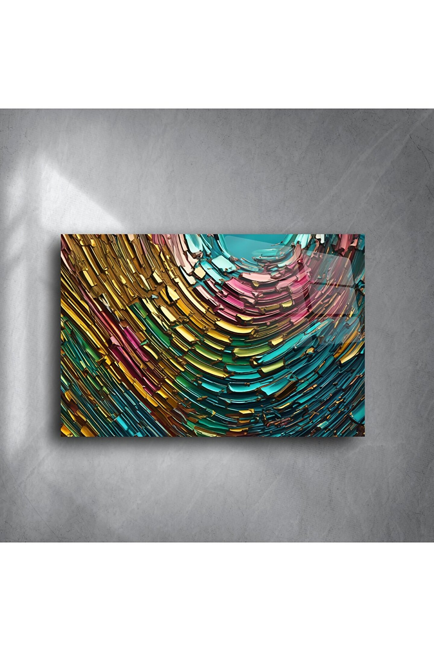 Parlak cam yüzey üzerinde renklerin dansı… Turkuaz, altın, pembe ve zümrüt tonlarının spiral formda birleştiği bu cam tablo; dinamizm, enerji ve modernliği yaşam alanlarınıza taşıyor. Soyut formu ve güçlü renk geçişleriyle göz alıcı bir vurgu parçası sunar.