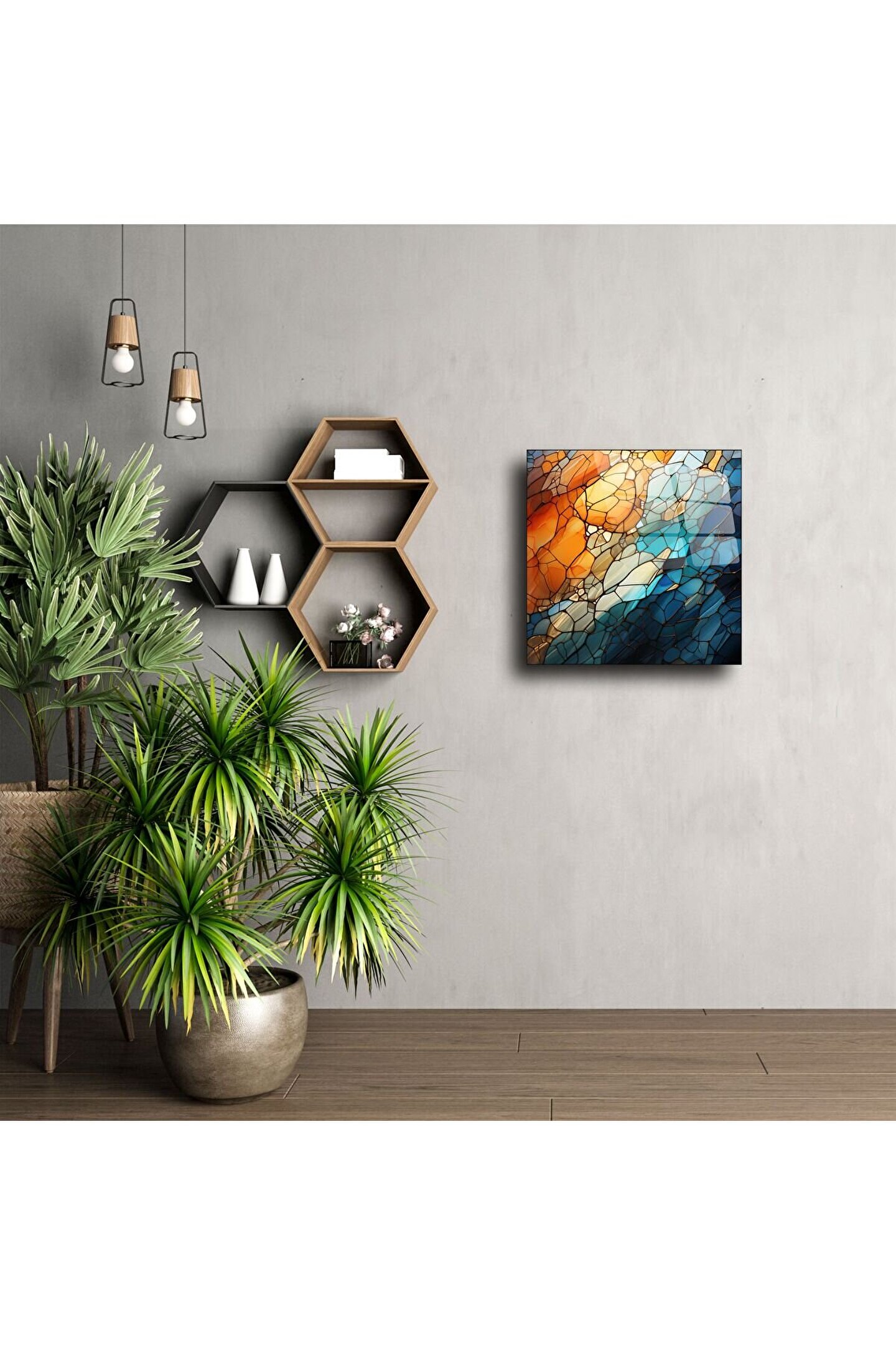 Modern sanatı yaşam alanınıza taşıyan bu soyut cam tablo, dinamik turuncu ve mavi tonların armonisiyle tasarlanmıştır. Renk geçişleriyle derinlik hissi yaratan bu cam panel, minimalist çizgilerle çağdaş bir atmosfer sunar.