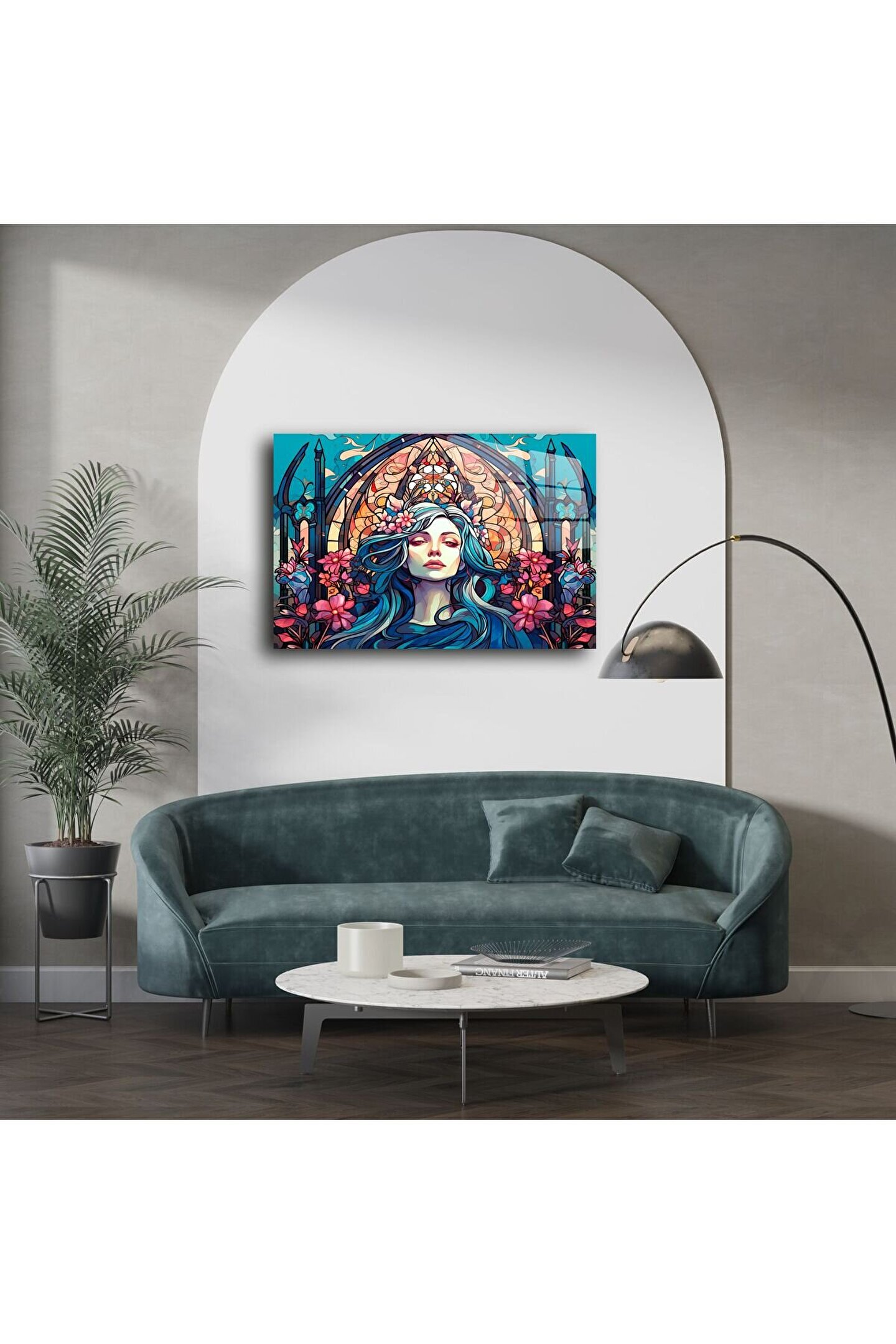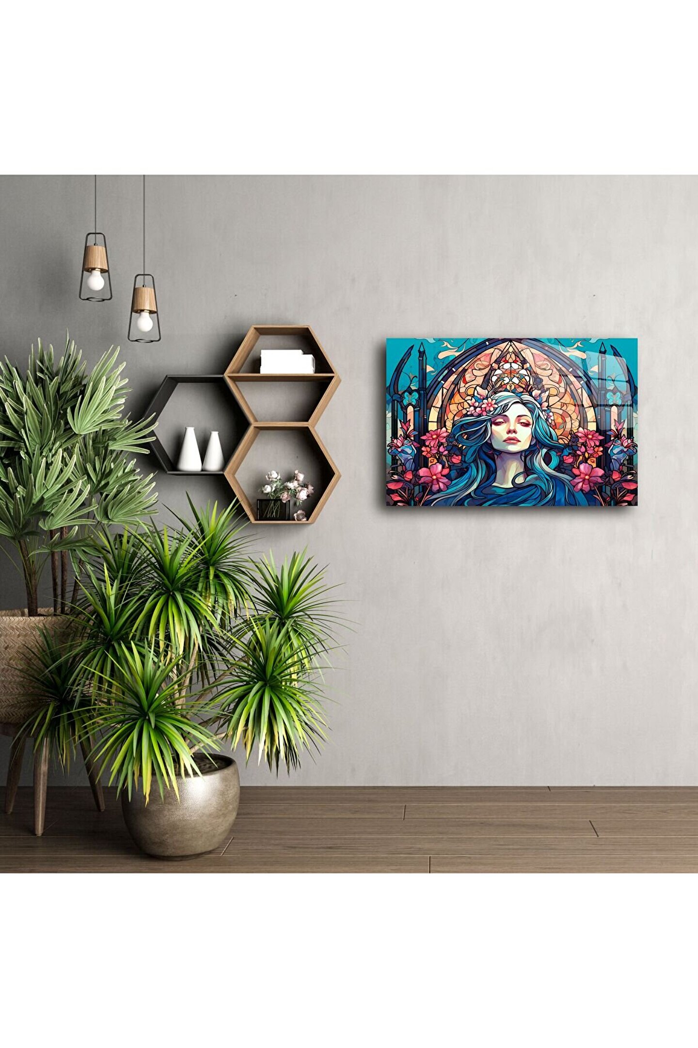 Bu taçlı kadın figürlü gotik vitray duvar sanatıyla mistik güzelliği ve gücü evine taşı. Canlı çiçek detayları ve katedral tarzı kemerli çizgilerle tasarlanan bu panel, bohem zarafeti ve kutsal dişiliği yaşam alanına getiriyor.