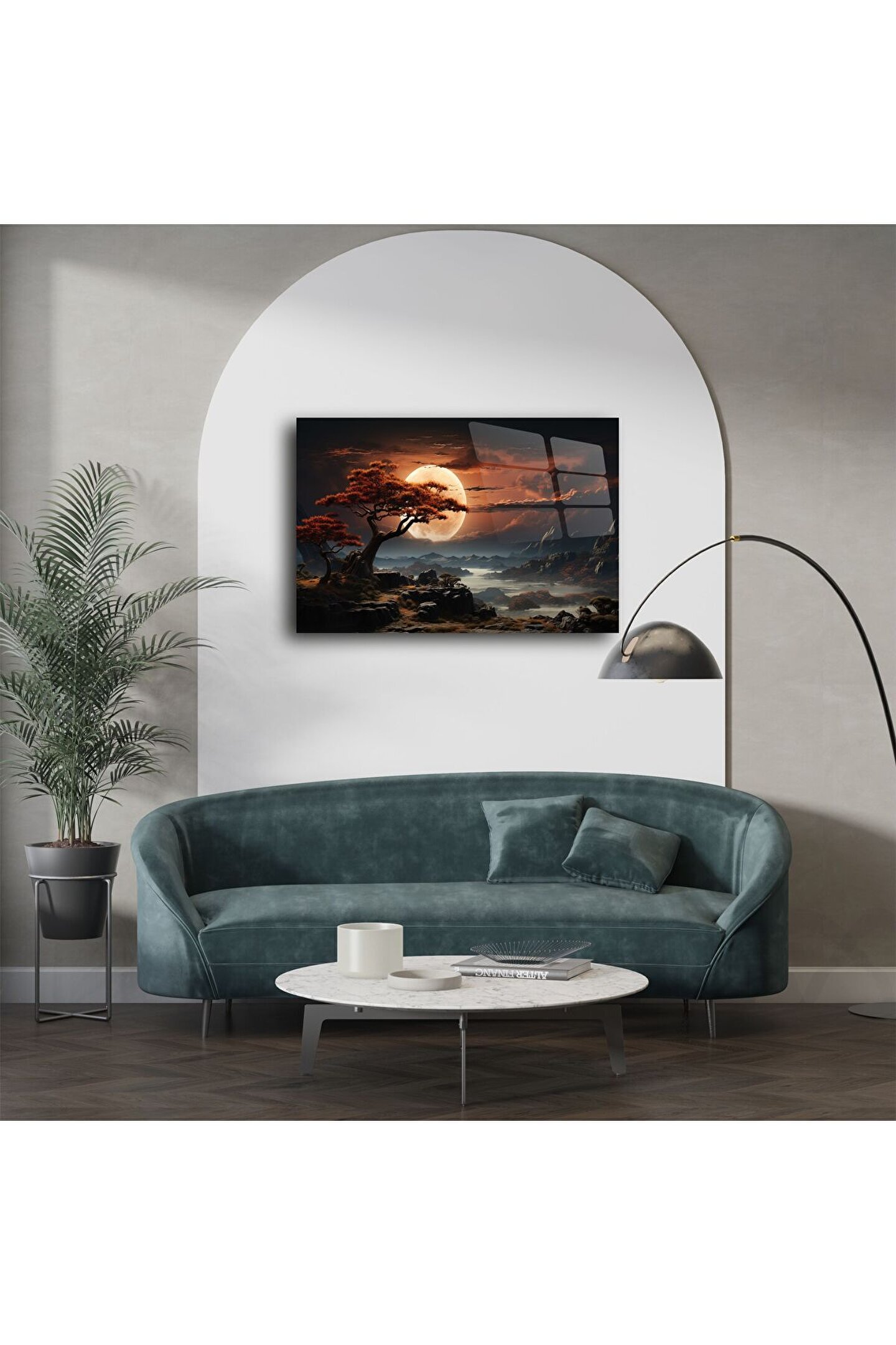 Büyüleyici turuncu ay ışığı altında kıvrılan siluet ağaçları ve sisli dağ manzarasıyla bu cam tablo, doğaya duyduğunuz tutkuyu duvarlarınıza taşıyor. Yüksek çözünürlüklü baskı teknolojisi ile üretilen bu modern duvar sanatı, ışığı yansıtan parlak cam yüzeyiyle odanıza sofistike bir atmosfer katıyor.