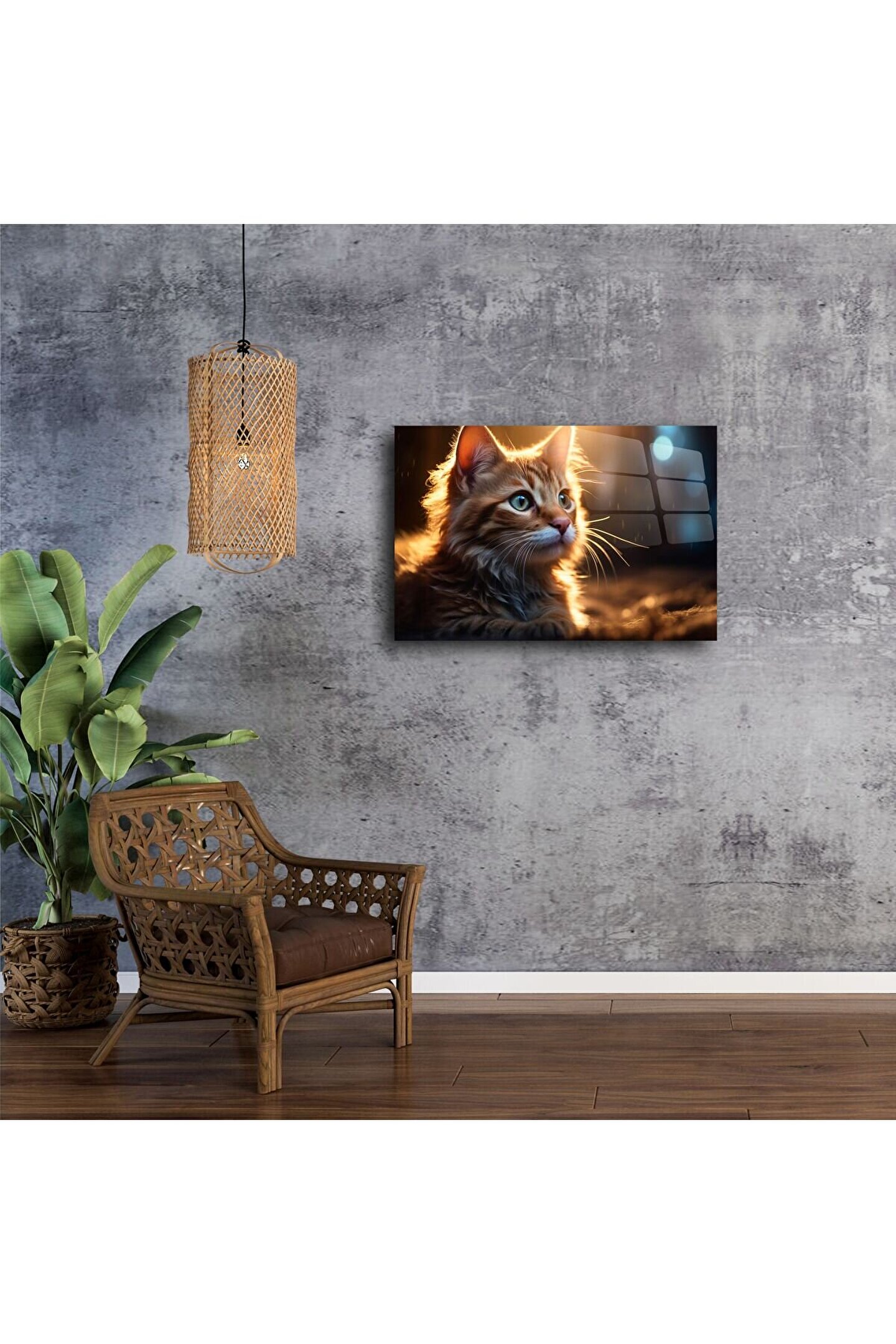 Bu turuncu yavru kedi cam tablo, gün batımının sıcak ışığını minik bir kalbin içine sığdırıyor. Işığın kürkte oluşturduğu parıltı ve kedinin hayran bakışları, yüksek çözünürlükle temperli cam yüzeyeişlenerek huzur dolu bir dekorasyon sunar.