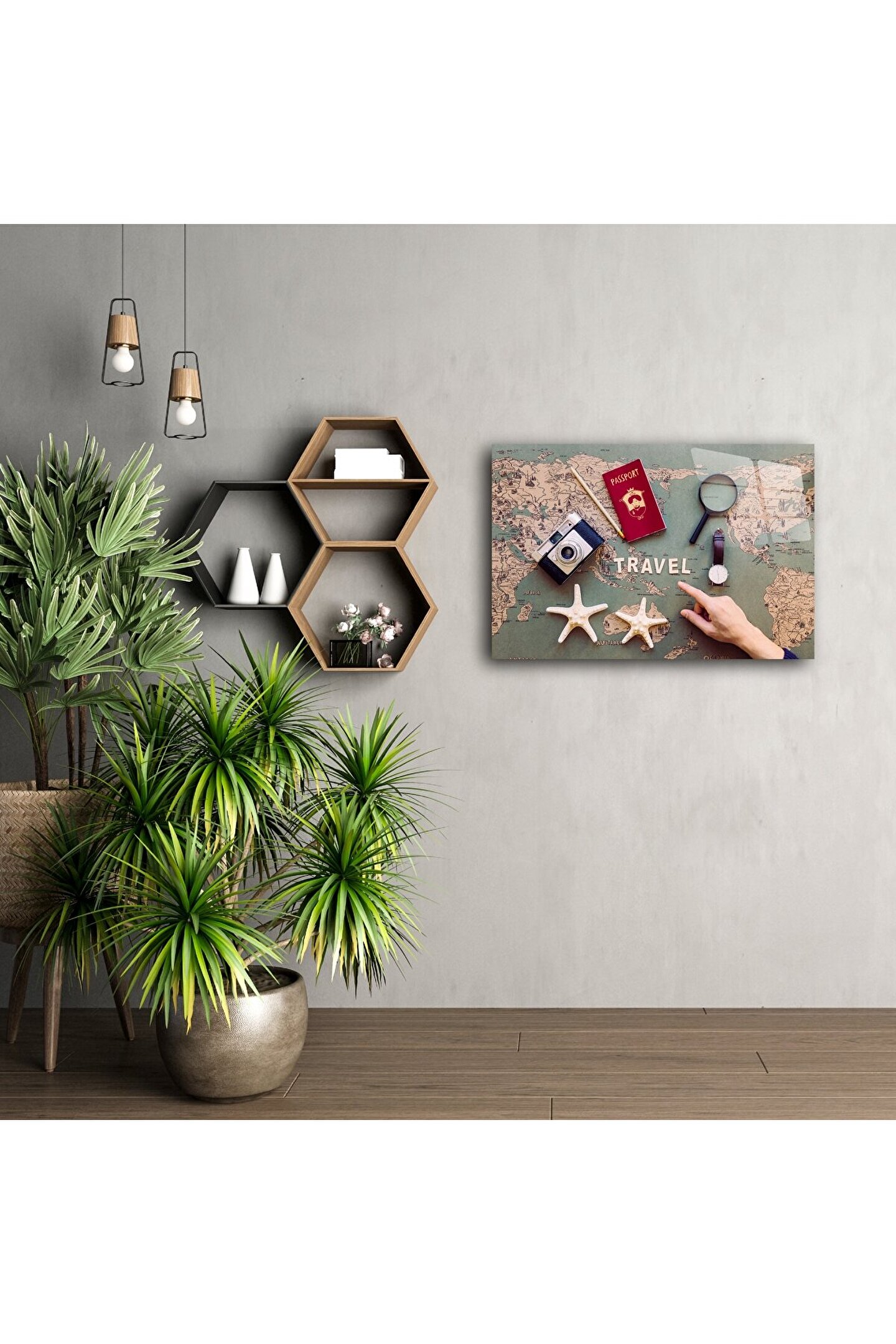 Seyahat ruhunu evinizin duvarlarına taşıyın! Bu cam tablo, vintage dünya haritası üzerinde konumlandırılmış pasaport, retro fotoğraf makinesi ve deniz yıldızlarıyla tamamlanmış sofistike bir kompozisyon sunar. Her detay, keşfetme arzusunu ve uzaklara duyulan özlemi simgeler.