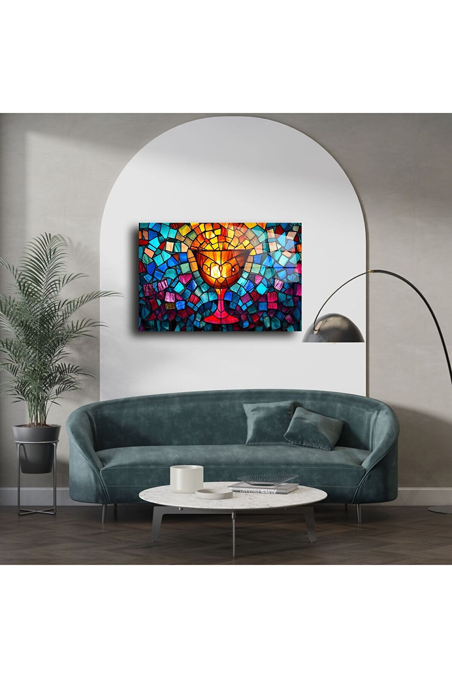 Bu zarif vitray kadeh duvar sanatıyla kutsal gelenekleri onurlandırın — canlı mavi, kırmızı ve altın tonlarında işlenmiş bir inanç ve adanmışlık sembolü. El işçiliğiyle üretilmiş mozaik tasarımı huzur ve maneviyat hissi uyandırır; her odaya spiritüel bir odak noktası kazandırmak için idealdir.