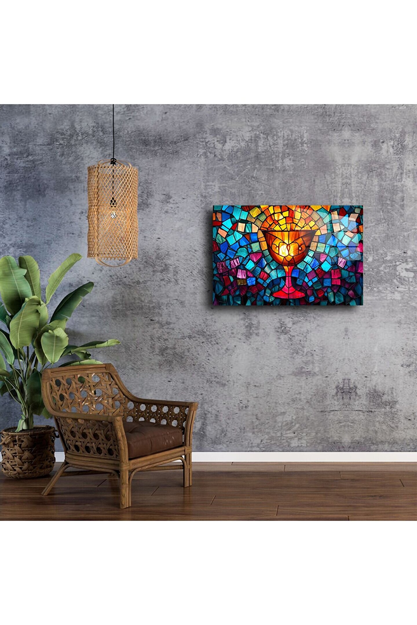 Bu zarif vitray kadeh duvar sanatıyla kutsal gelenekleri onurlandırın — canlı mavi, kırmızı ve altın tonlarında işlenmiş bir inanç ve adanmışlık sembolü. El işçiliğiyle üretilmiş mozaik tasarımı huzur ve maneviyat hissi uyandırır; her odaya spiritüel bir odak noktası kazandırmak için idealdir.