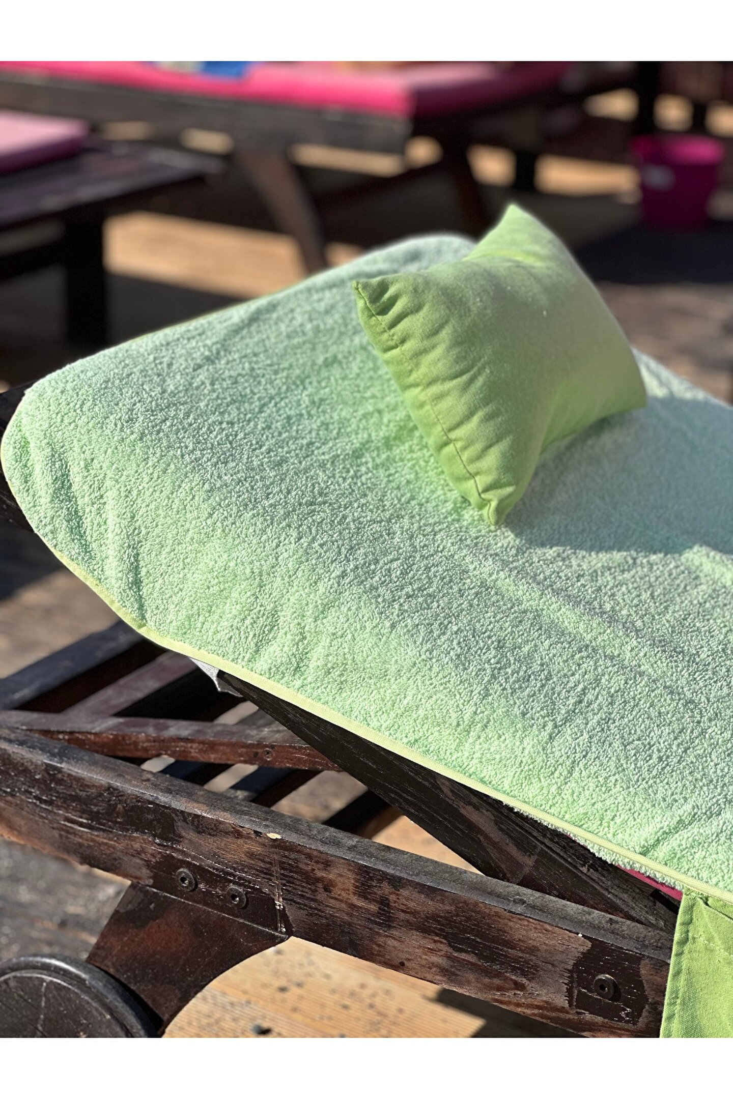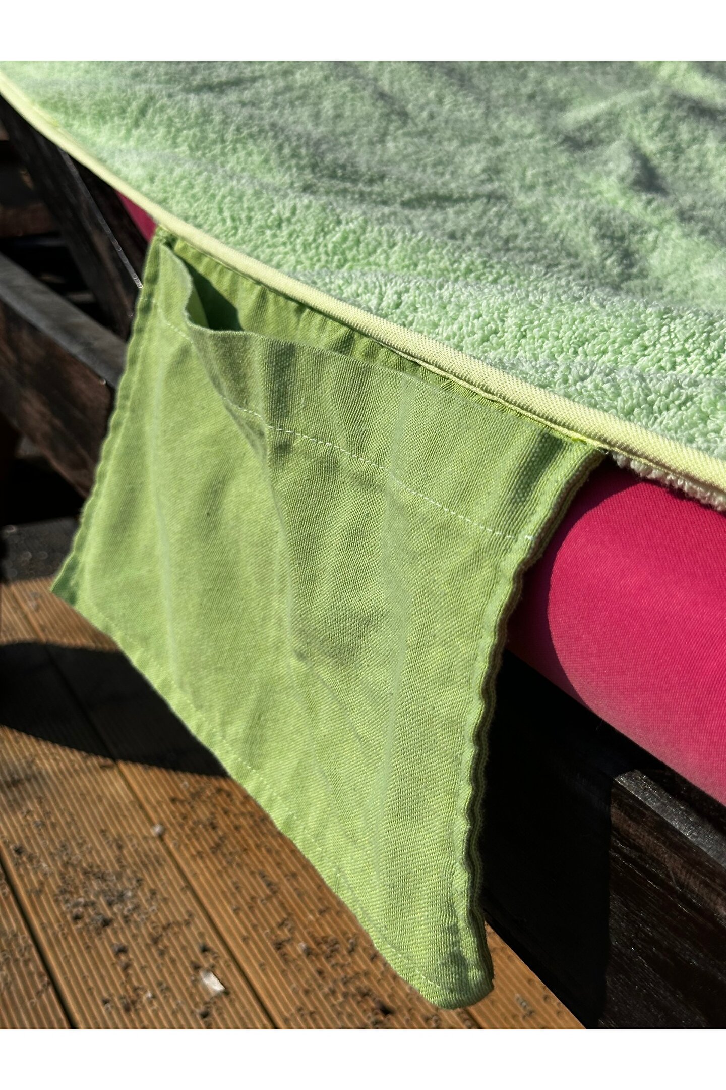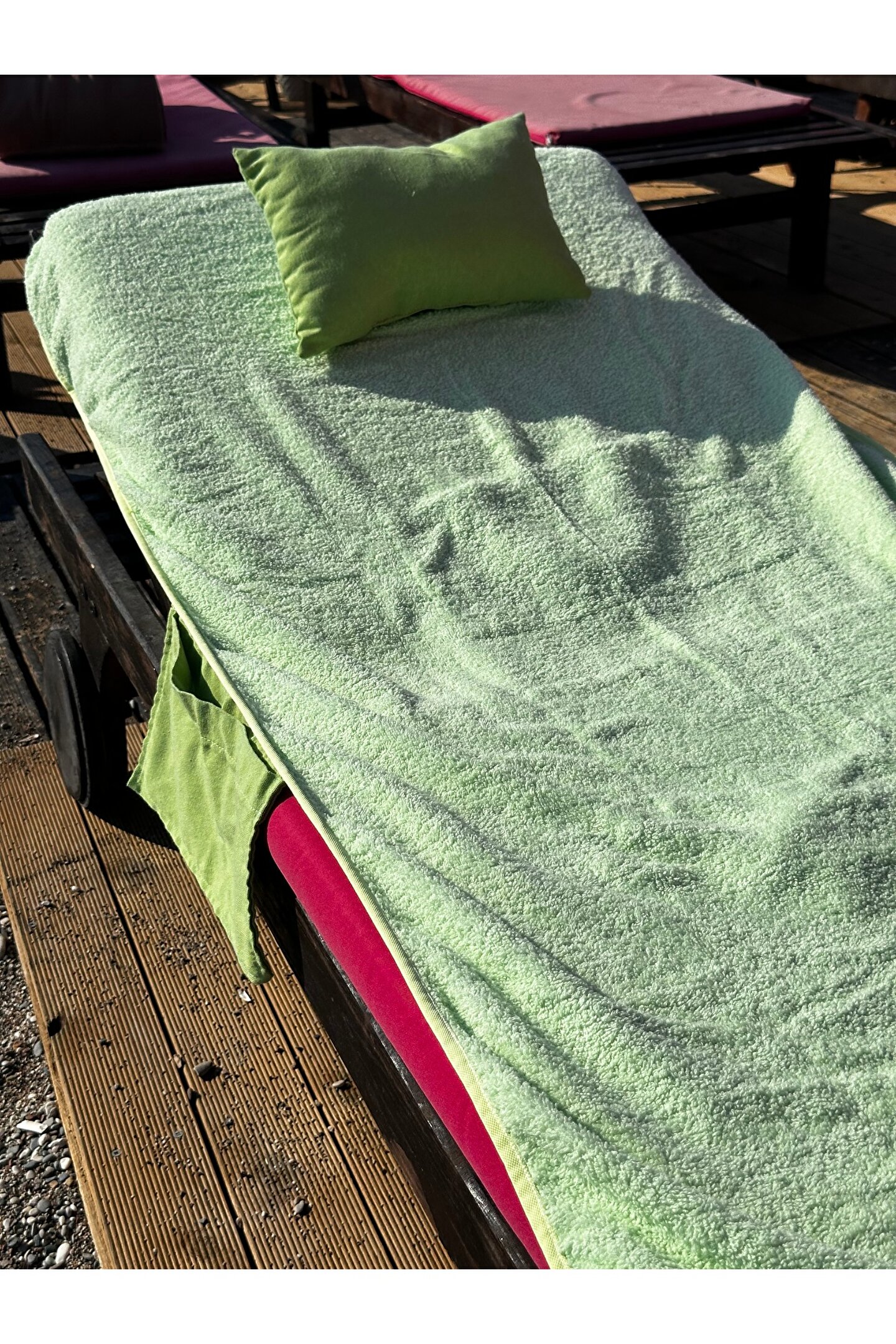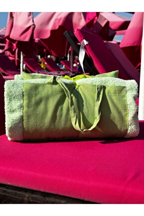 Çanta formunda plaj havlusu Ürün içerisinde yastığı ile gönderilmektedir. ; Ürünün çanta formunda iken 4, açık formda iken de 4 cebi bulunmaktadır. ; Ceplerde cüzdan, telefon, anahtar, kitap gibi bütün özel eşyalarınızı rahatlıkla muhafaza edebilirsiniz. ; Şezlonga sabitlemek için ipi bulunmaktadır. ; Aynı zamanda içinden çıkan yastık rüzgardan uçmaması ve kolay kullanım için istendiğinde düğme ile sabitlenebilmektedir. ; Çamaşır makinasında yıkamaya uygundur. ; Ürün üzerindeki çanta detayı dikme formdadır. ; Ürün açılıp şezlonga serildiğinde çanta detayı altta kalıp kolay kullanım sağlar. ; 75x175 cm;