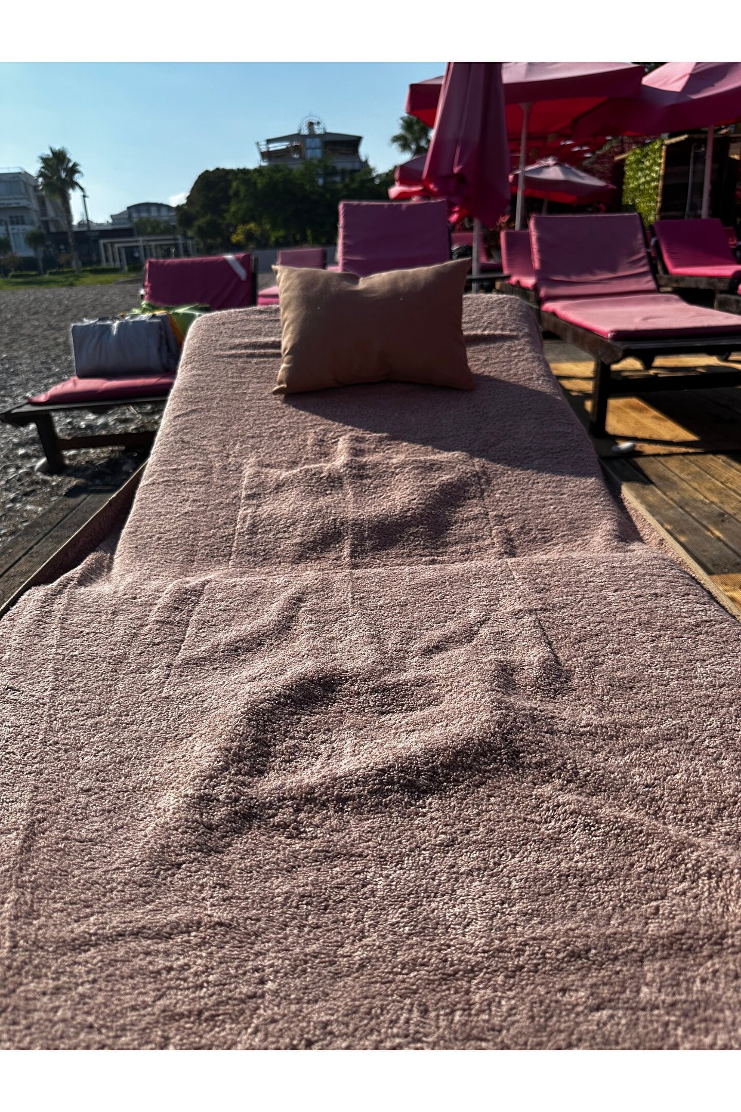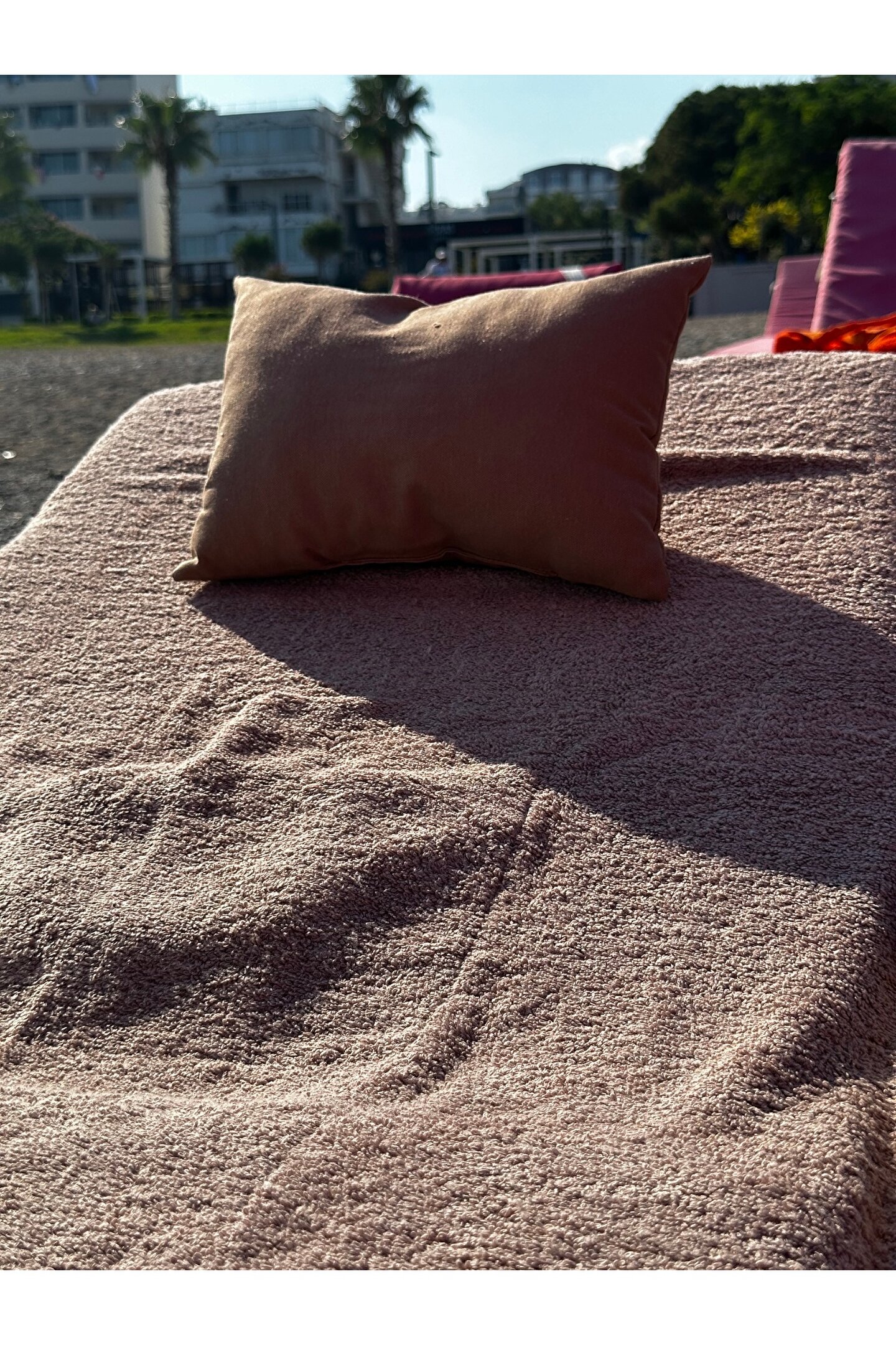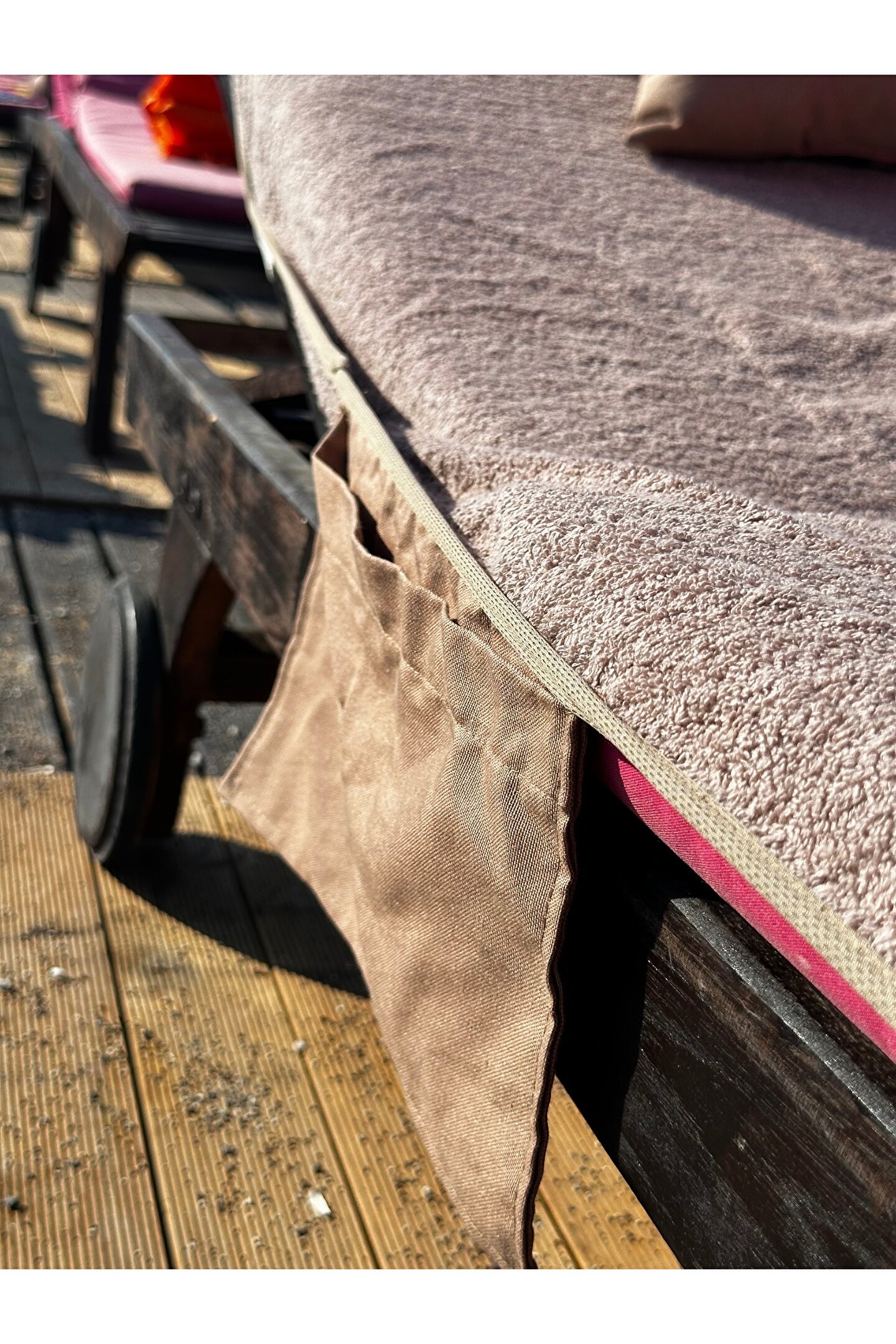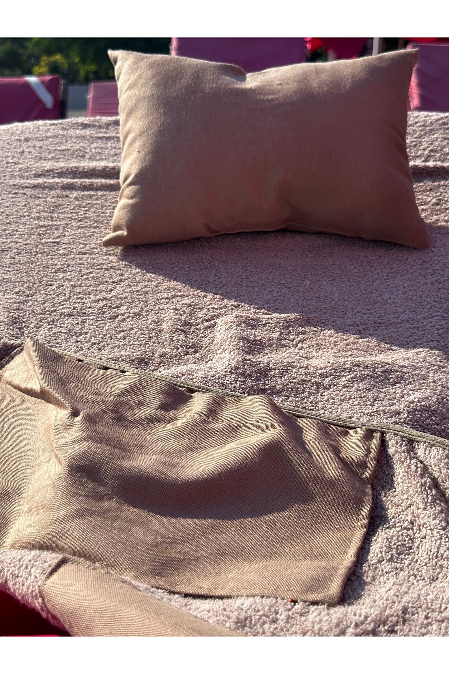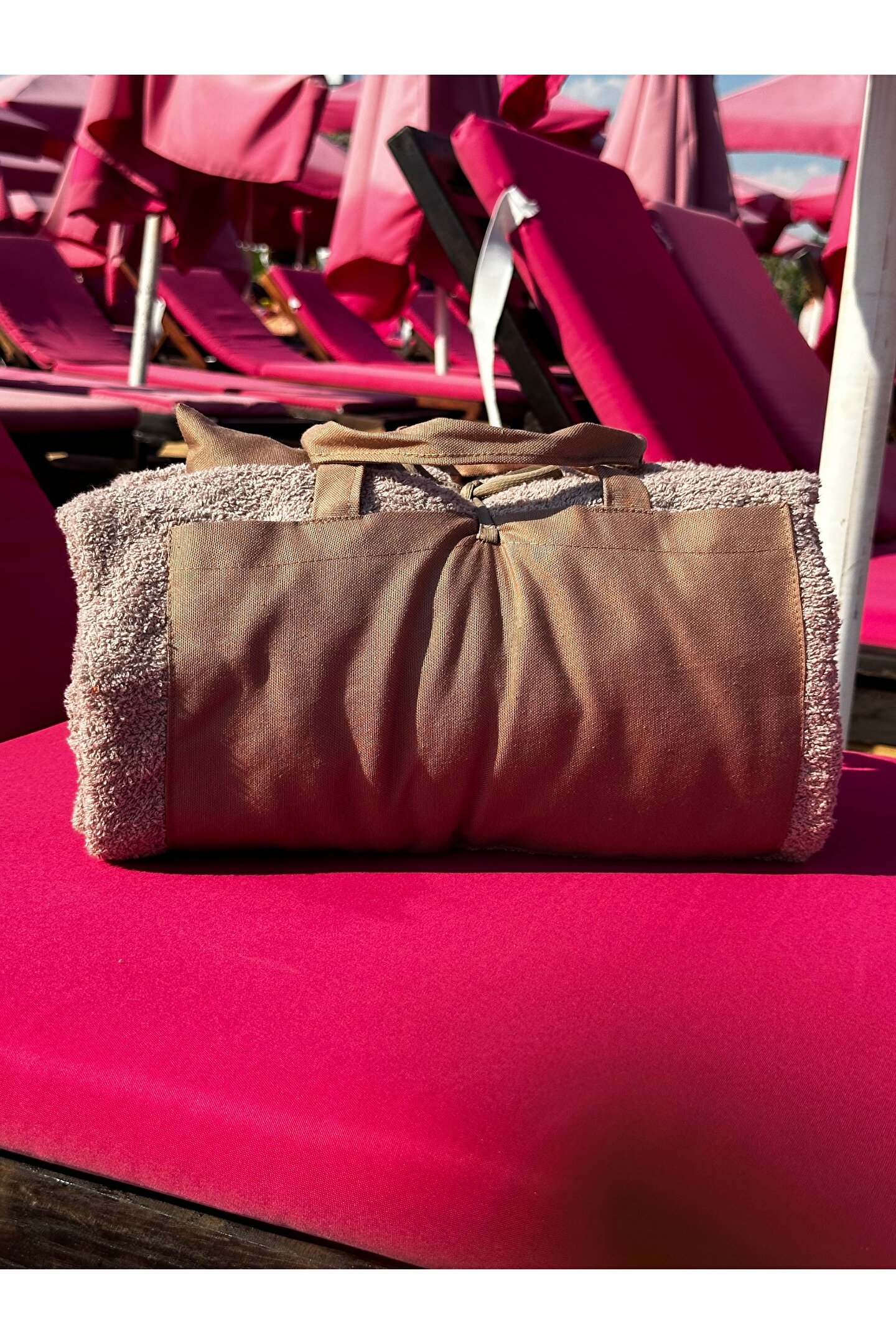 Çanta formunda plaj havlusu Ürün içerisinde yastığı ile gönderilmektedir. ; Ürünün çanta formunda iken 4, açık formda iken de 4 cebi bulunmaktadır. ; Ceplerde cüzdan, telefon, anahtar, kitap gibi bütün özel eşyalarınızı rahatlıkla muhafaza edebilirsiniz. ; Şezlonga sabitlemek için ipi bulunmaktadır. ; Aynı zamanda içinden çıkan yastık rüzgardan uçmaması ve kolay kullanım için istendiğinde düğme ile sabitlenebilmektedir. ; Çamaşır makinasında yıkamaya uygundur. ; Ürün üzerindeki çanta detayı dikme formdadır. ; Ürün açılıp şezlonga serildiğinde çanta detayı altta kalıp kolay kullanım sağlar. ; 75x175 cm;