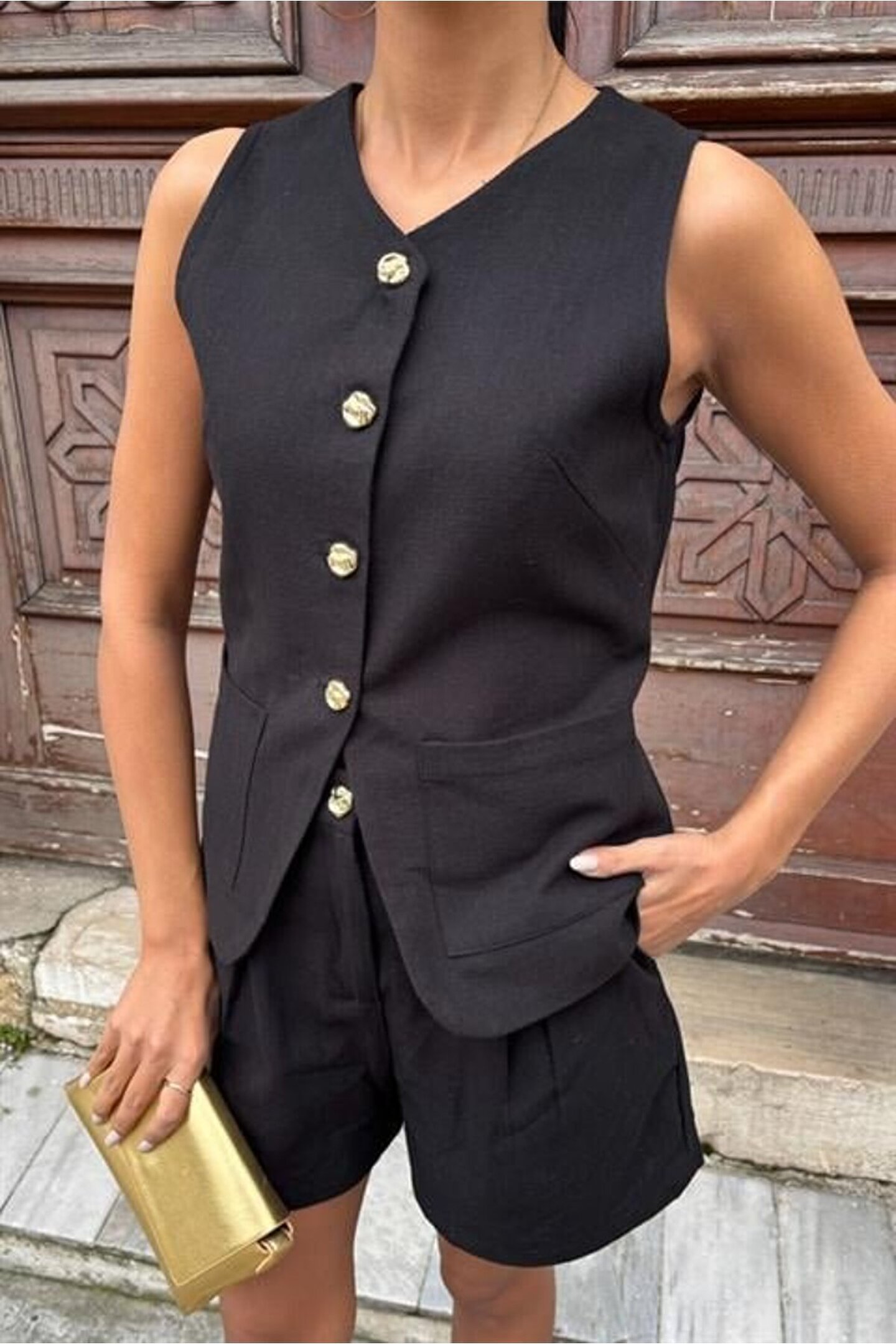 Gold Düğme Detaylı Yelek Şort Cotton Takım 10134-17