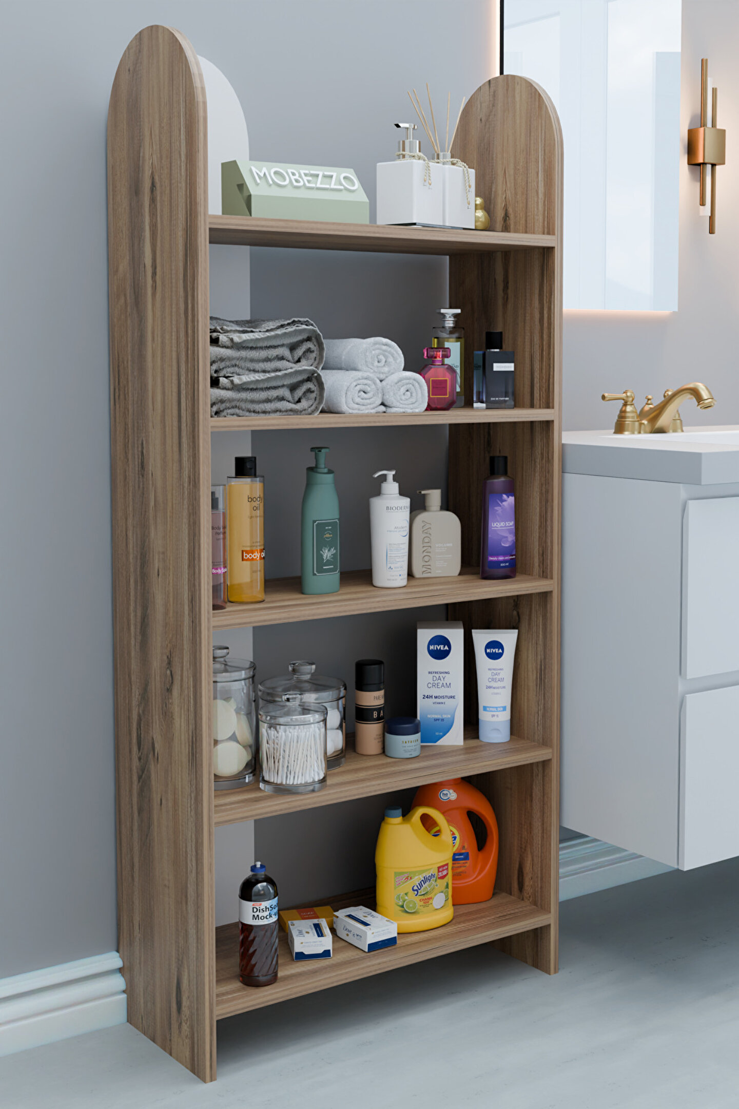 - Beş rafı sayesinde banyonuzda ihtiyacınız olan her şeyi düzenli bir şekilde saklayabilirsiniz.; - Modern tasarımı ile banyonuza şık bir görünüm kazandırırken, fonksiyonel kullanım sunar.; - Suntalam malzemesiyle dayanıklılığı artırılmış ve uzun ömürlü bir kullanım vaat eder.; - Kahverengi rengi ve ceviz tonlarındaki doğal dokusuyla mekanınıza sıcak bir atmosfer katar.; - Çok amaçlı yapısı sayesinde hem dekoratif hem de pratik bir depolama çözümü sağlar; şampuanlarınızı, havlularınızı veya diğer banyo malzemelerinizi kolayca organize edebilirsiniz.